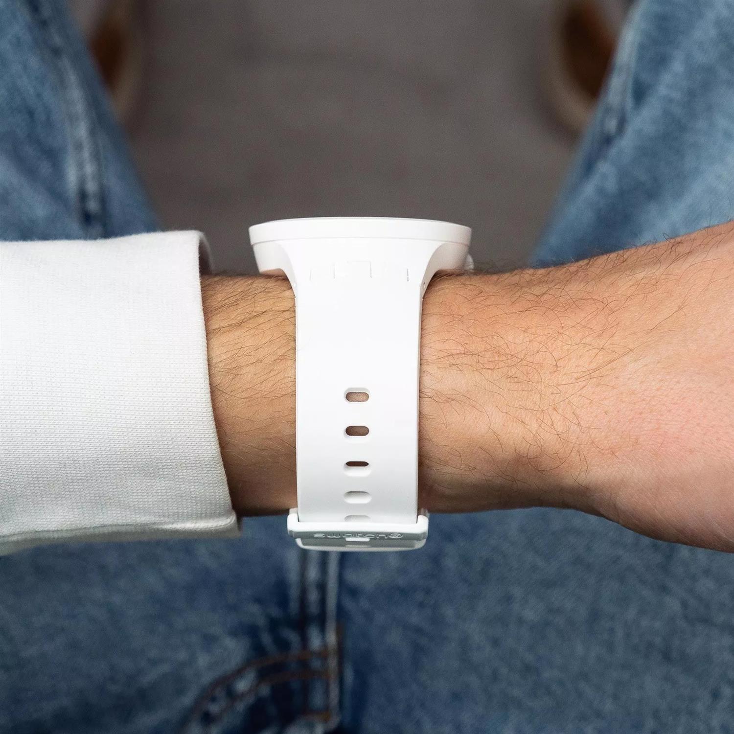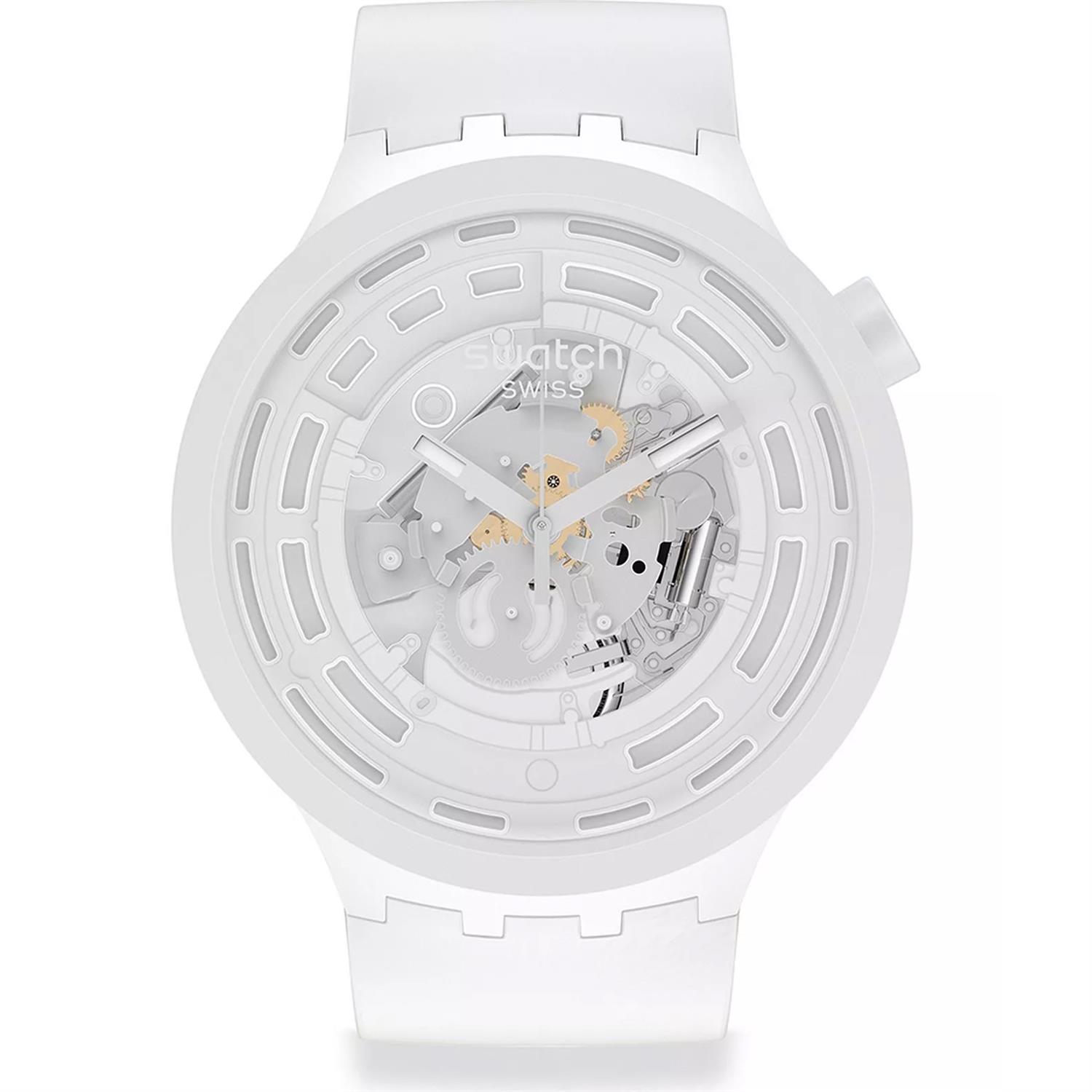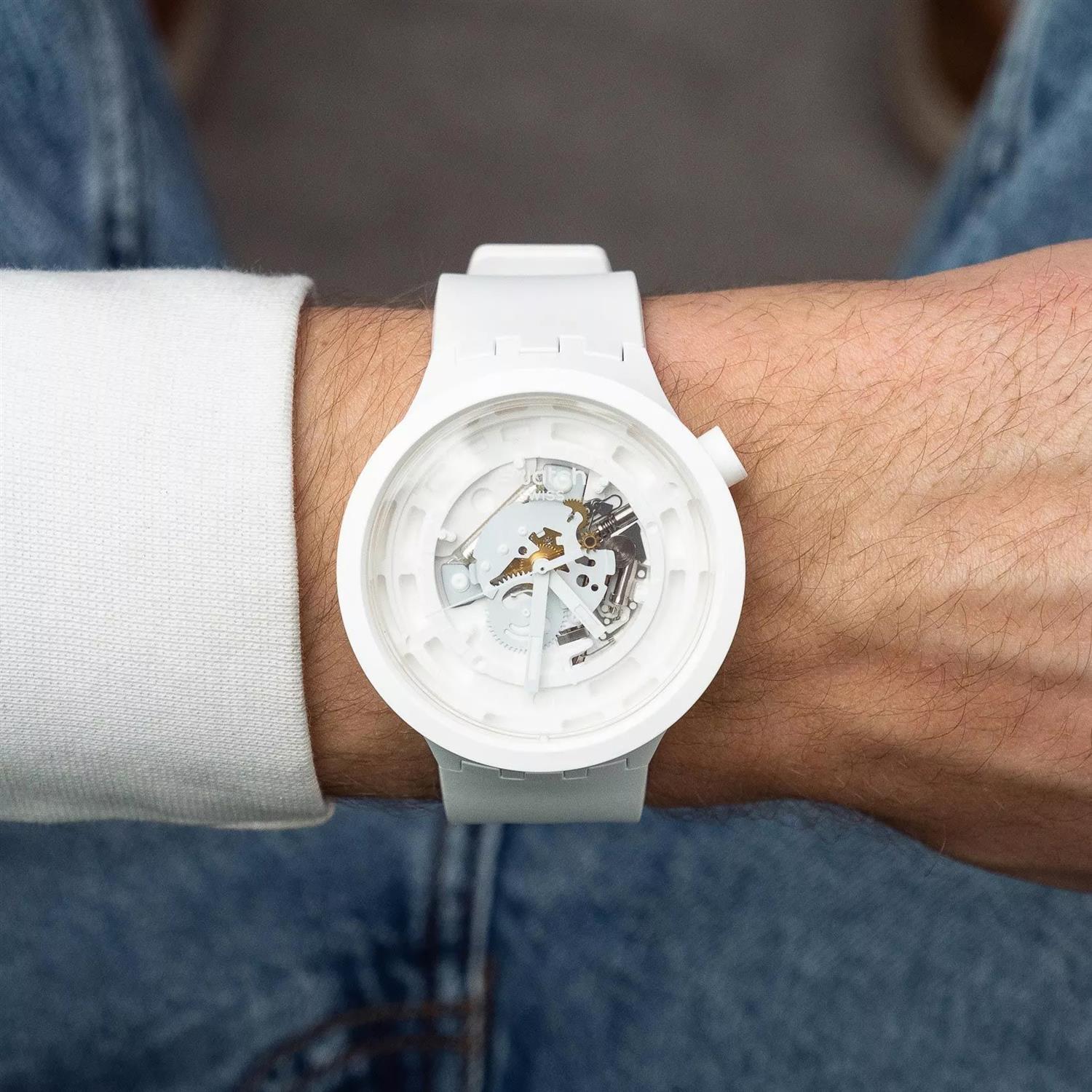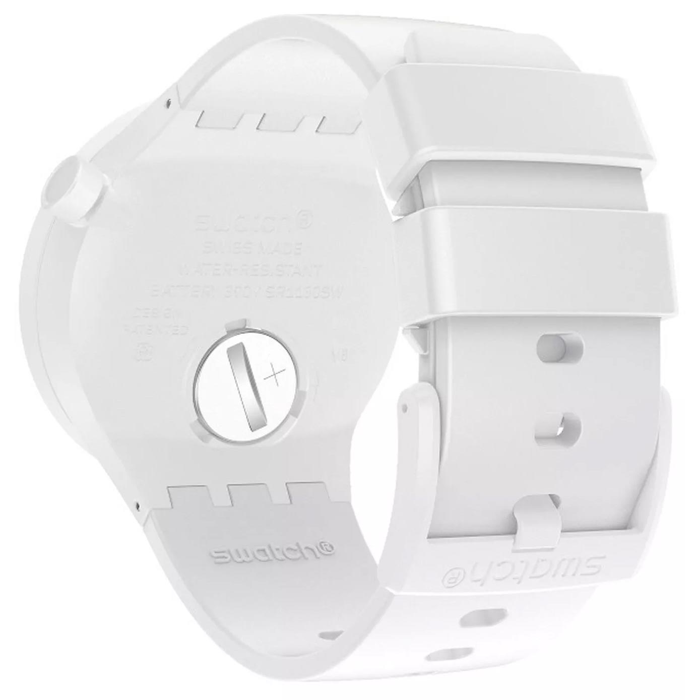 ساعت مچی مردانه سواچ SWATCH با طراحی روزانه بند سیلیکونی سفید و قاب گرد سفید و صفحه گرد سفید و موتور سوییسی با انرژی باتری و قابلیت داشتن شب نما و مقاوم در برابر آب تا عمق 30 متر به همراه دو سال گارانتی بین المللی