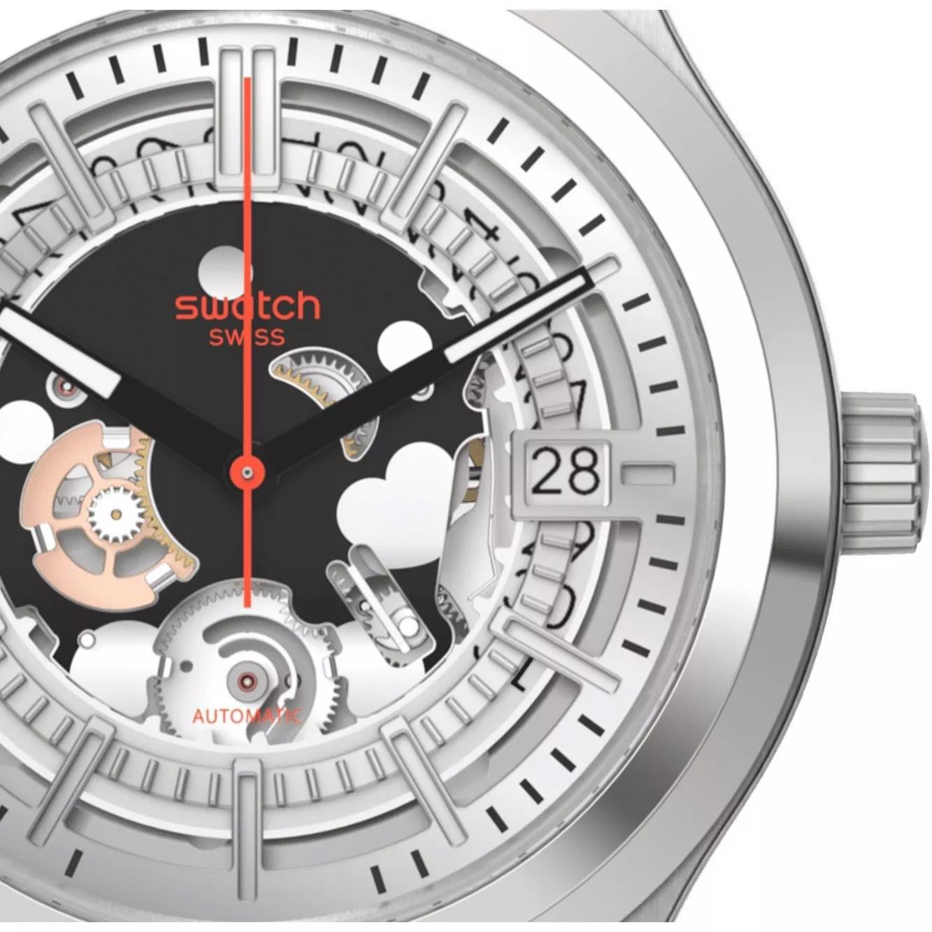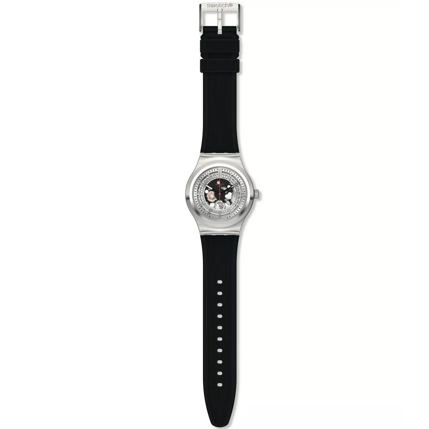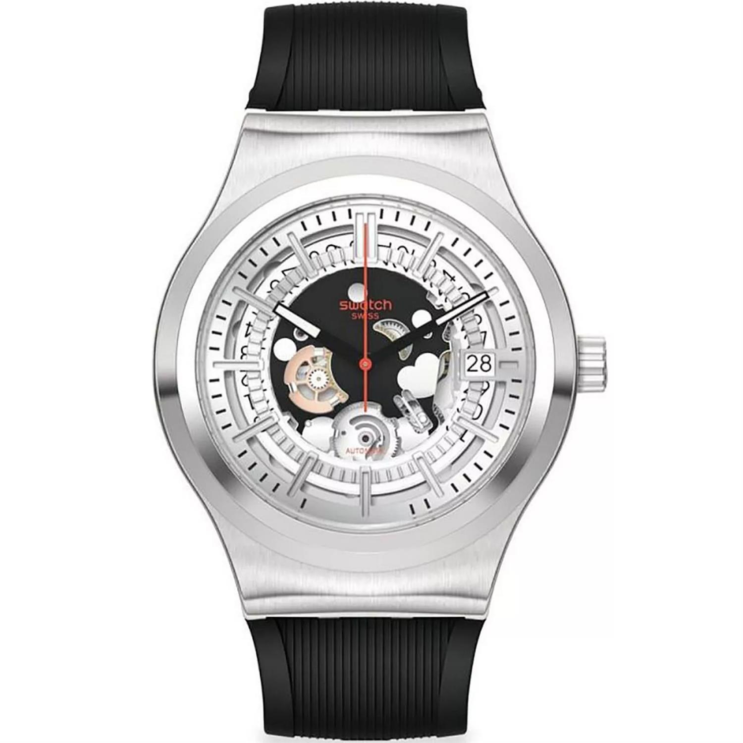 ساعت مچی مردانه سواچ SWATCH با طراحی روزانه بند سیلیکونی و قاب گرد استیل و صفحه اسکلتون نقره ای و موتوراتوماتیک سوییسی با انرژی مکانیکی و قابلیت داشتن شب نما / تقویم و مقاوم در برابر آب تا عمق 30 متر به همراه دو سال گارانتی بین المللی