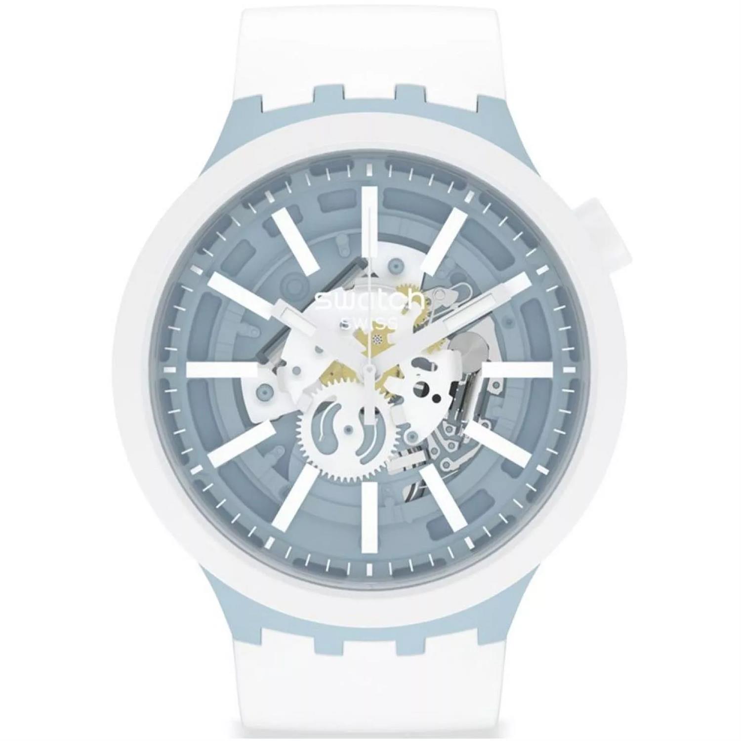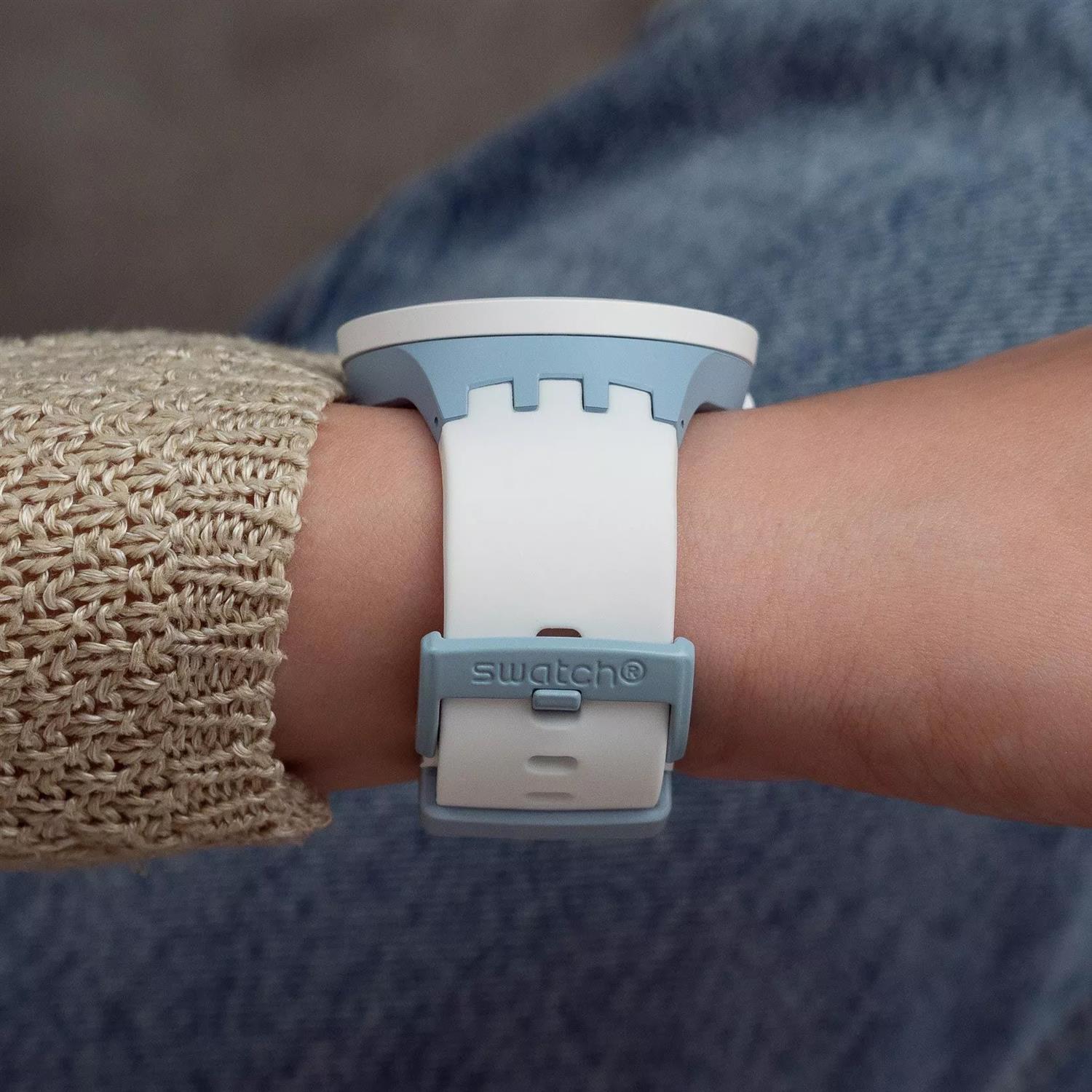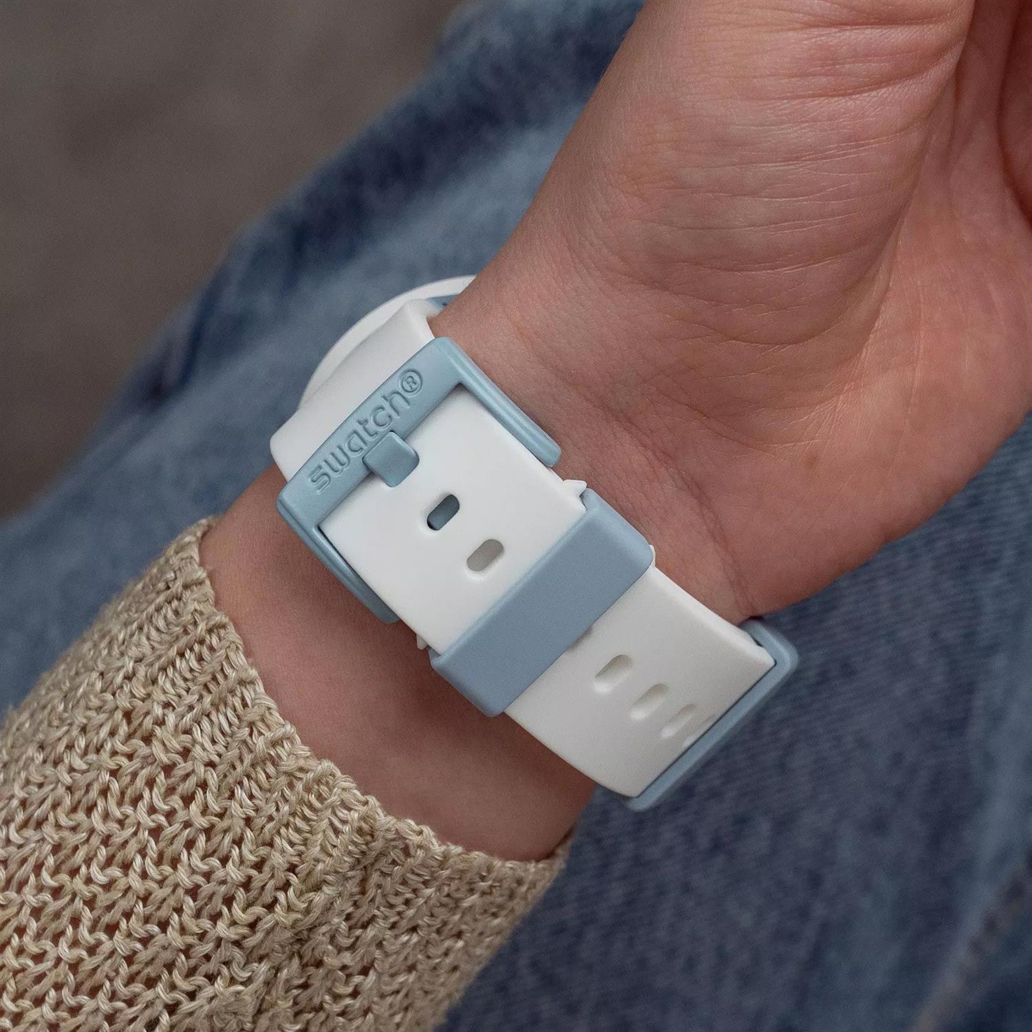 ساعت مچی مردانه سواچ SWATCH با طراحی روزانه بند سیلیکونی سفید و قاب گرد سفید آبی و صفحه گرد آبی و موتور سوییسی با انرژی باتری و قابلیت داشتن شب نما و مقاوم در برابر آب تا عمق 30 متر به همراه دو سال گارانتی بین المللی