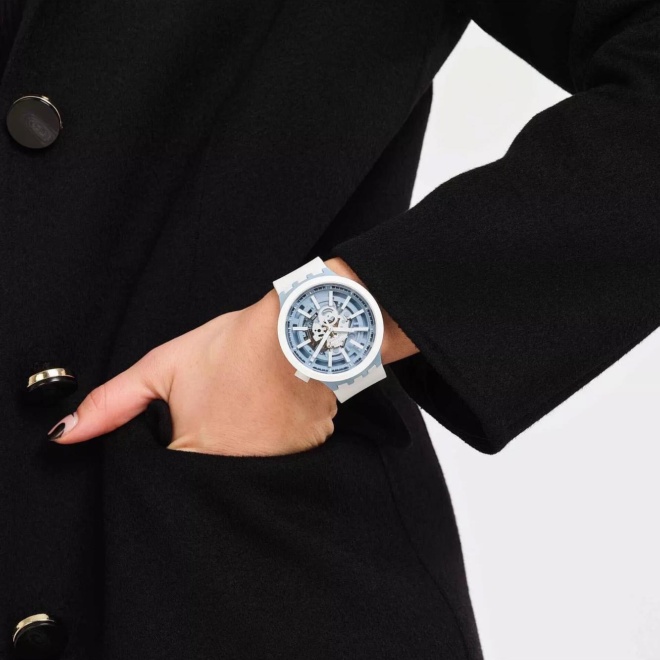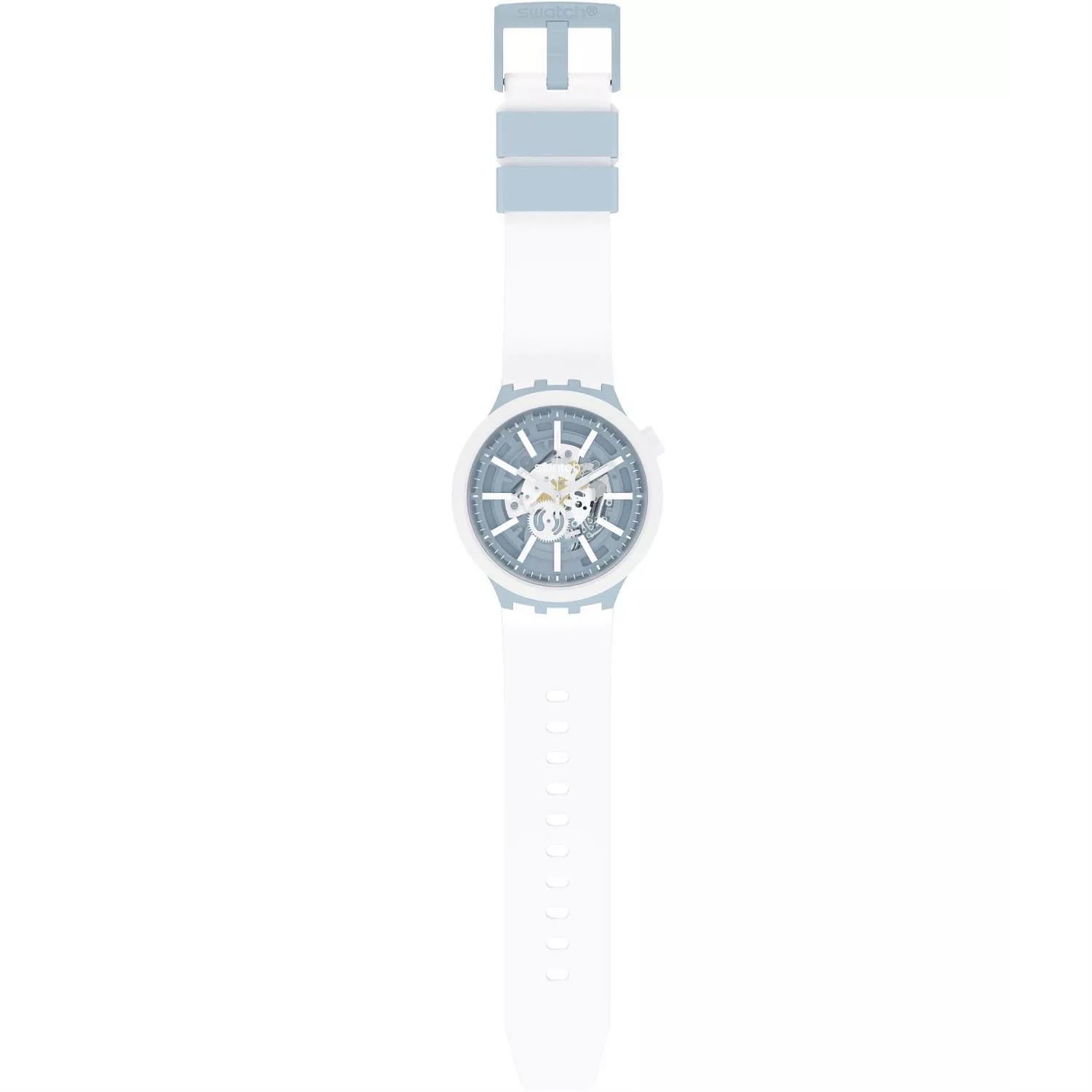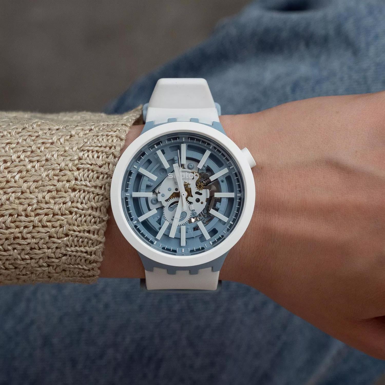 ساعت مچی مردانه سواچ SWATCH با طراحی روزانه بند سیلیکونی سفید و قاب گرد سفید آبی و صفحه گرد آبی و موتور سوییسی با انرژی باتری و قابلیت داشتن شب نما و مقاوم در برابر آب تا عمق 30 متر به همراه دو سال گارانتی بین المللی