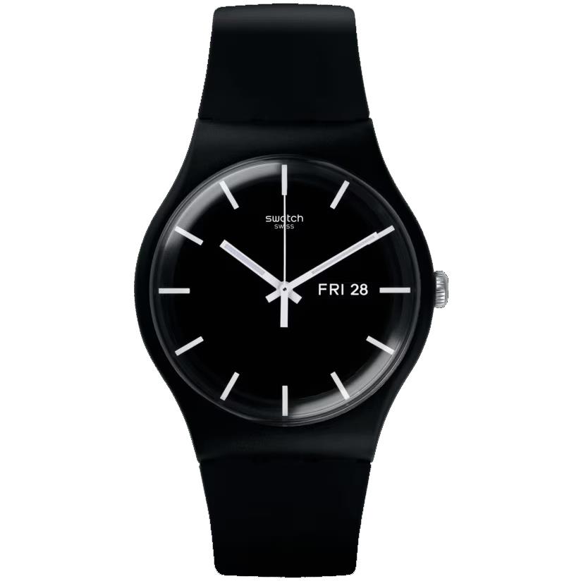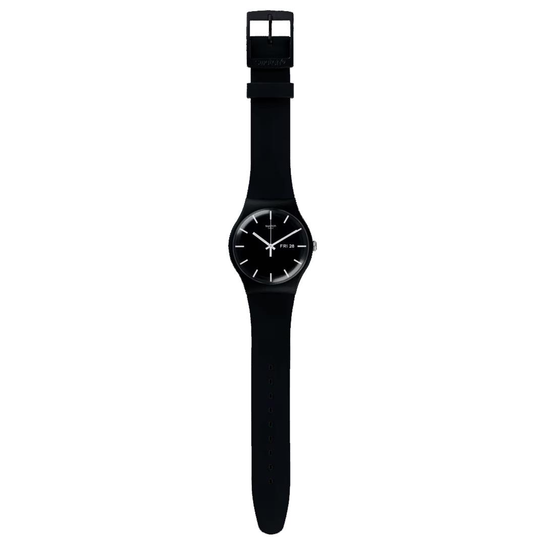 ساعت مچی مردانه سواچ SWATCH با طراحی روزانه بند سیلیکونی و قاب گرد مشکی و صفحه گرد مشکی و موتور سوییسی با انرژی باتری و قابلیت داشتن شب نما / روزهای هفته / تقویم و مقاوم در برابر آب تا عمق 30 متر به همراه دو سال گارانتی بین المللی