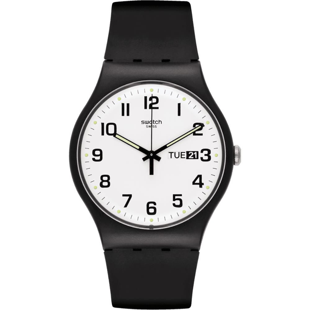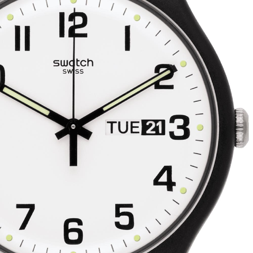 ساعت مچی مردانه سواچ SWATCH با طراحی روزانه بند سیلیکونی و قاب گرد مشکی و صفحه گرد سفید و موتور سوییسی با انرژی باتری وقابلیت داشتن شب نما / روزهای هفته / تقویم و مقاوم در برابر آب تا عمق 30 متر به همراه دو سال گارانتی بین المللی
