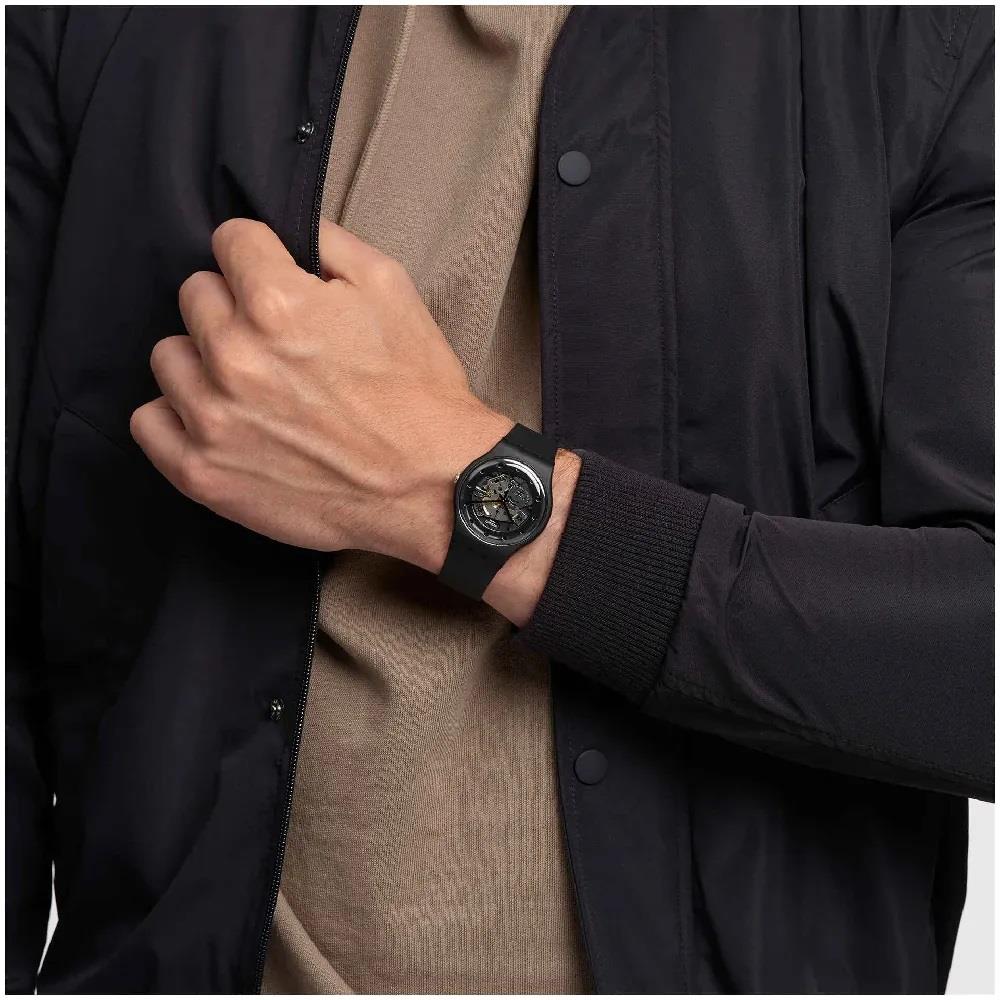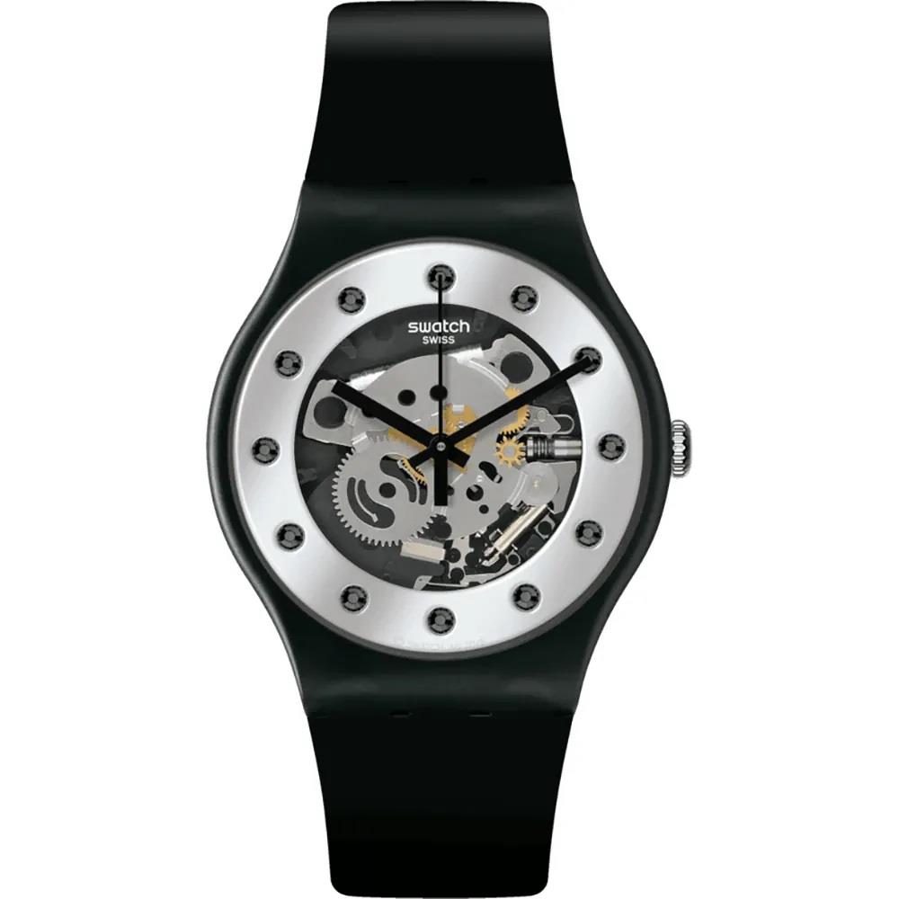 ساعت مچی مردانه سواچ SWATCH با طراحی روزانه بند سیلیکونی و قاب گرد مشکی و صفحه گرد نقره ای و موتور سوییسی با انرژی باتری و مقاوم در برابر آب تا عمق 30 متر به همراه دو سال گارانتی بین المللی
