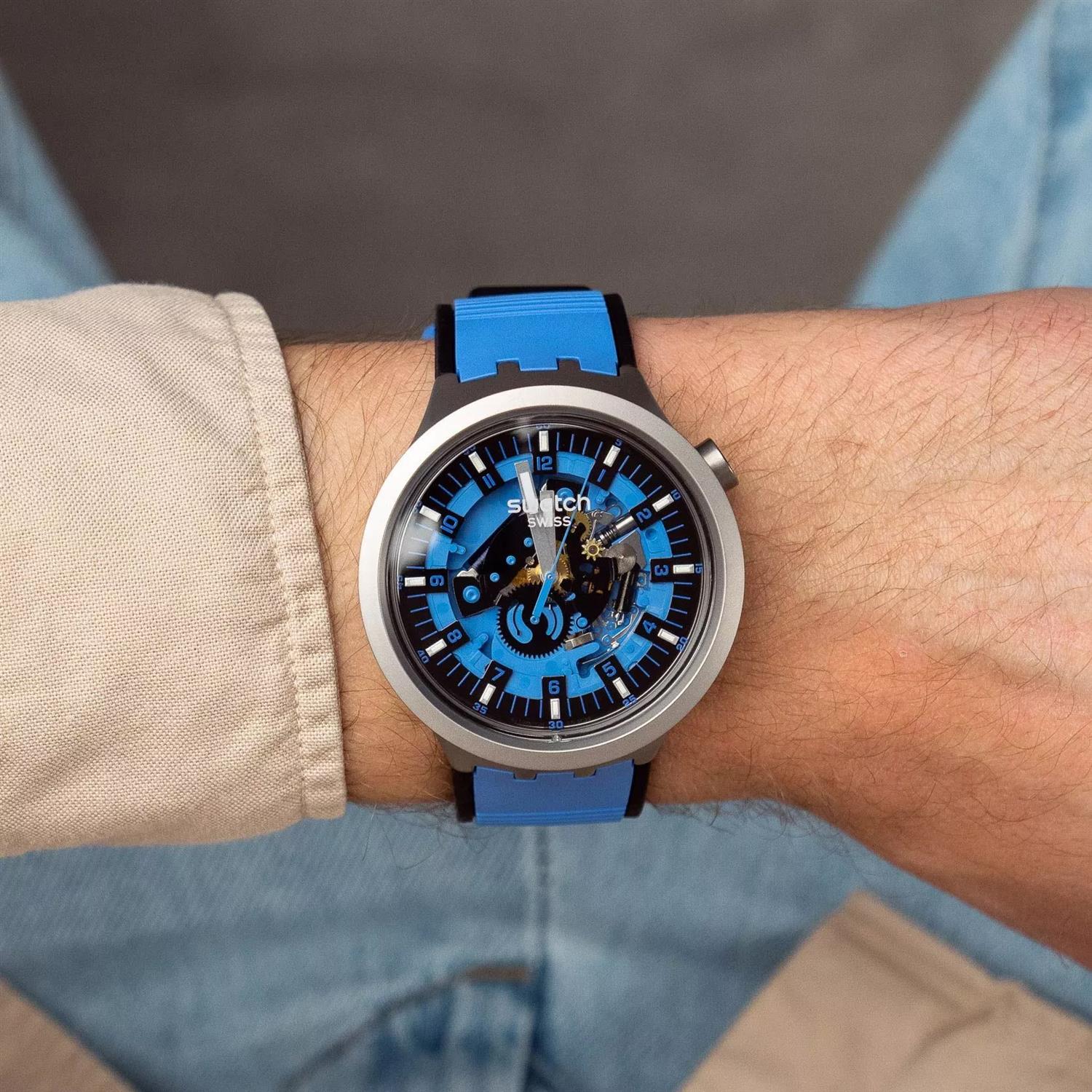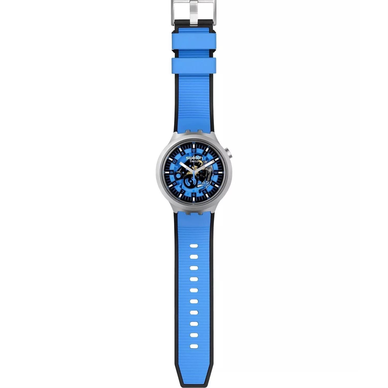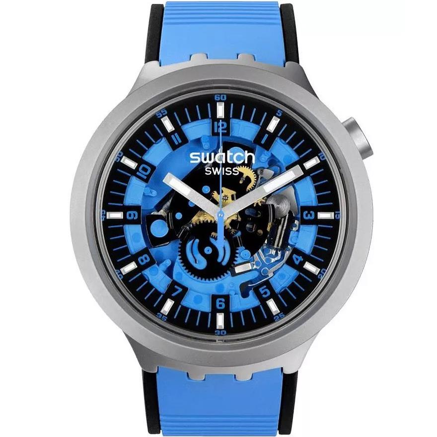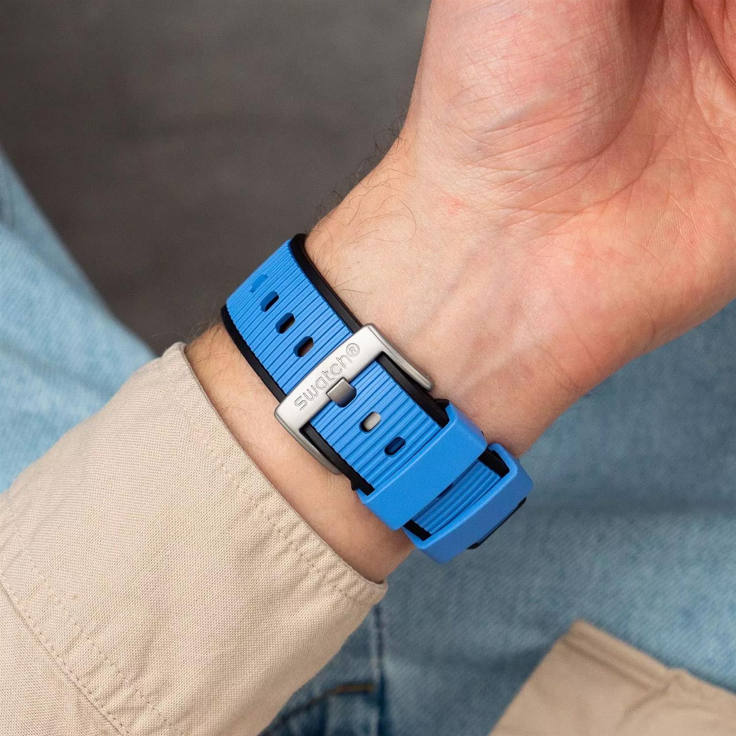 ساعت مچی مردانه سواچ SWATCH با طراحی روزانه بند سیلیکونی دورنگ و قاب گرد استیل و صفحه گرد دورنگ و موتور سوییسی با انرژی باتری و قابلیت داشتن  شبنما و مقاوم در برابر آب تا عمق 30 متر به همراه دو سال گارانتی بین المللی