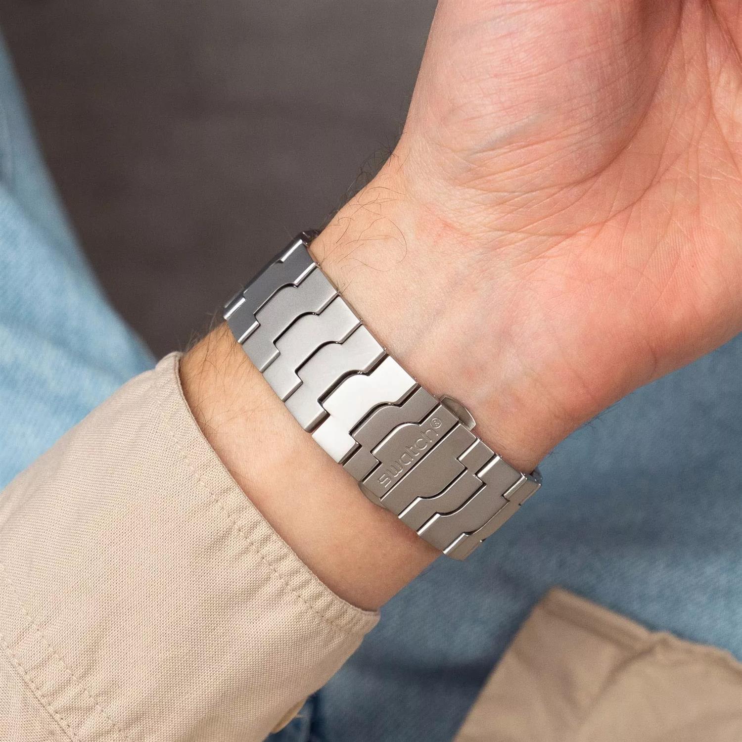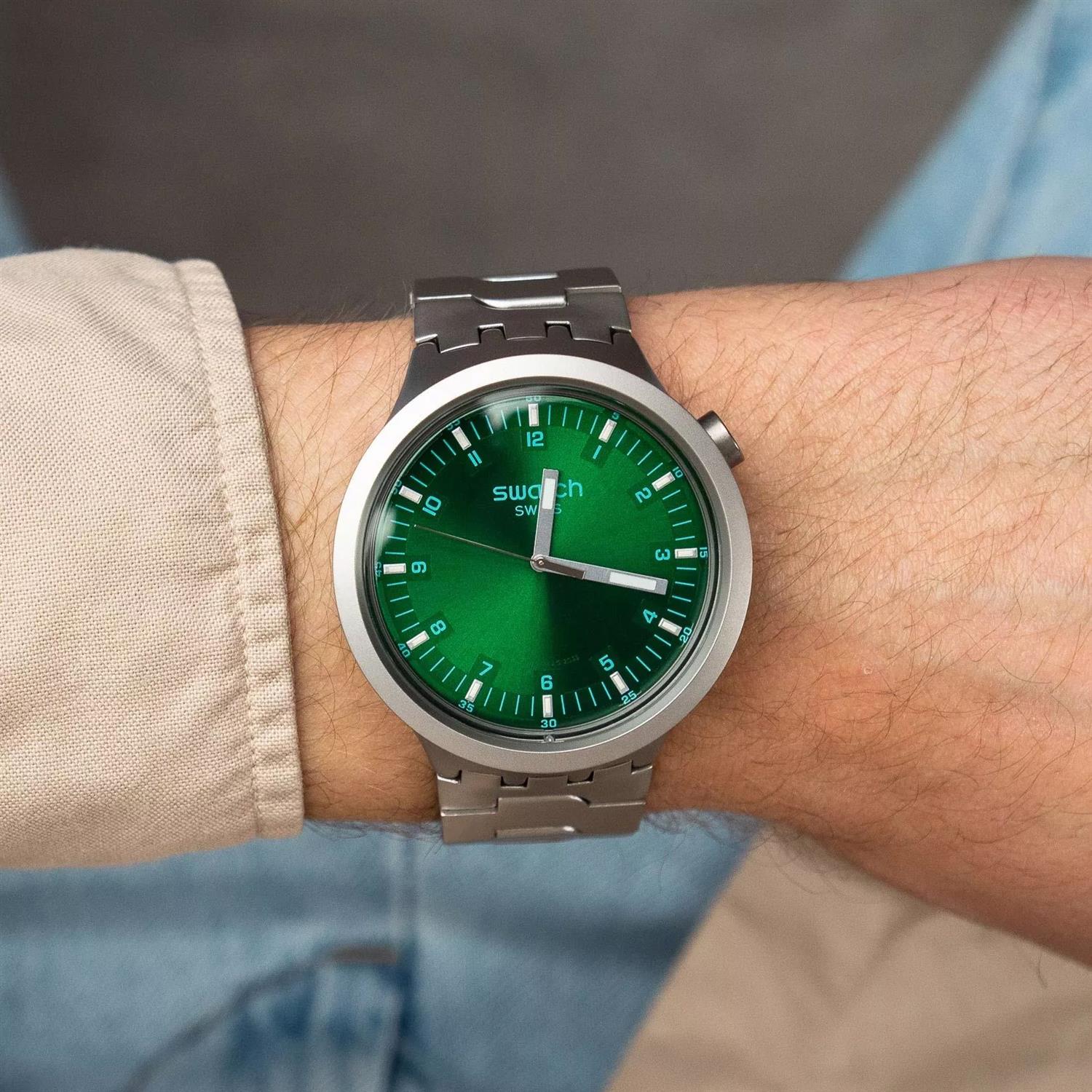 ساعت مچی مردانه سواچ SWATCH با طراحی روزانه بند استیل و قاب گرد استیل و صفحه گرد سبز و موتور سوییسی با انرژی باتری و قابلیت داشتن  شبنما و مقاوم در برابر آب تا عمق 30 متر به همراه دو سال گارانتی بین المللی