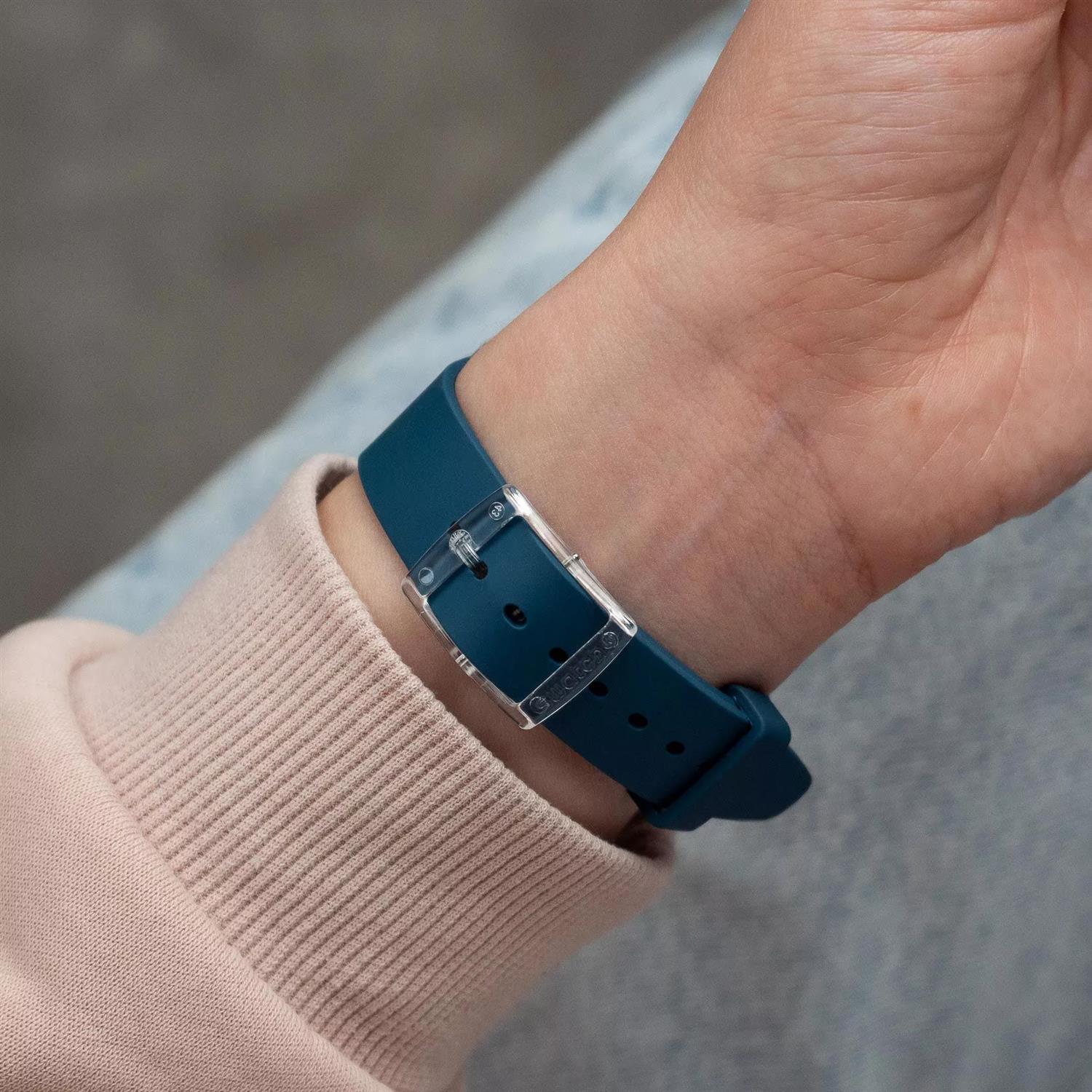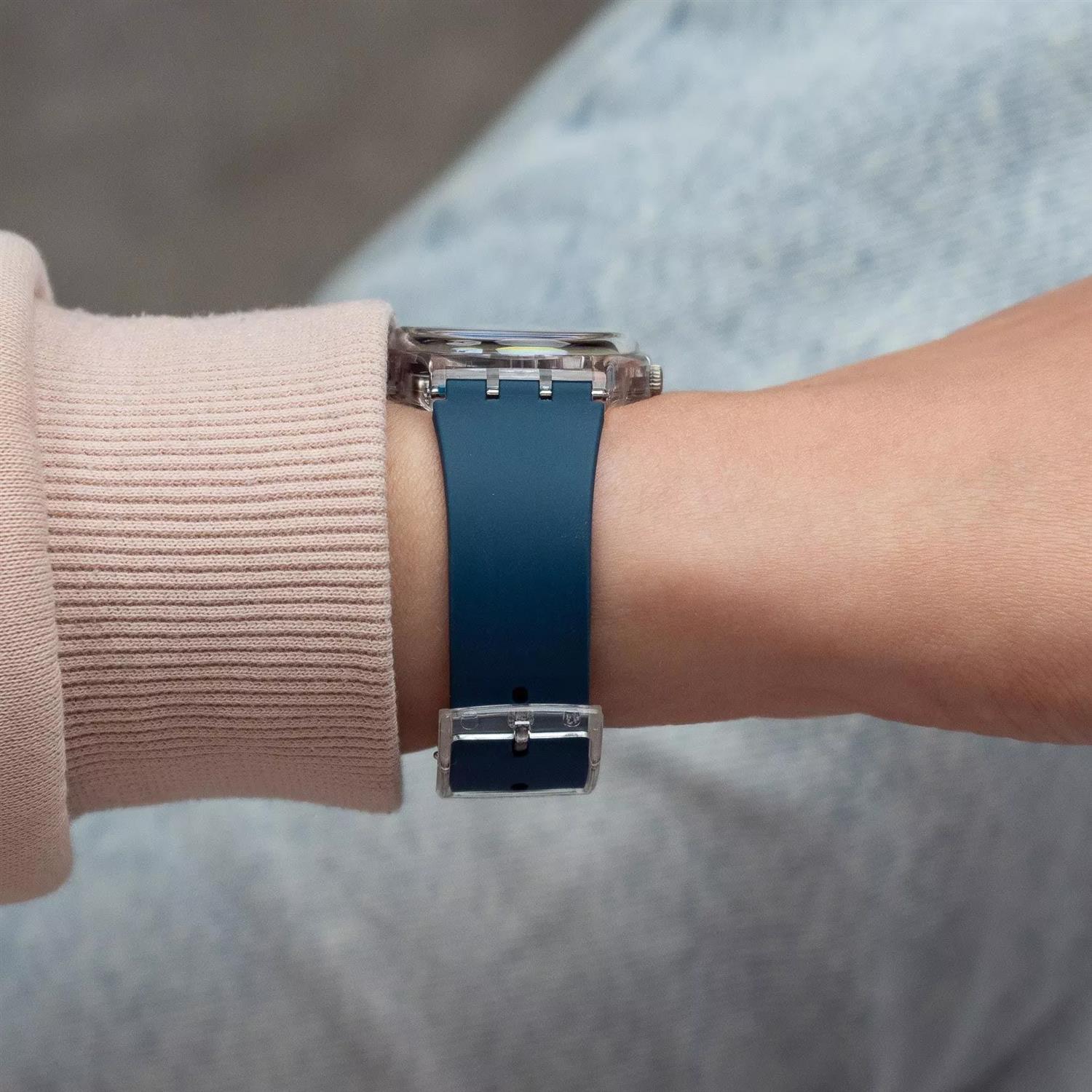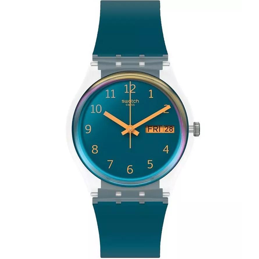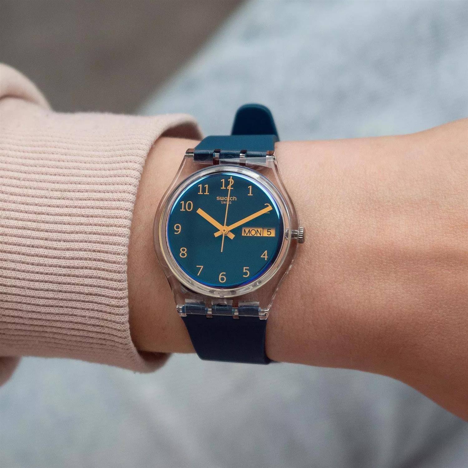 ساعت مچی دخترانه سواچ SWATCH با طراحی روزانه بند سیلیکونی آبی و قاب گرد شیشه ای و صفحه گرد آبی با موتور سوییسی و انرژی باتری با قابلیت داشتن روزهای هفته / تقویم و مقاوم در برابر آب تا عمق 30 متر به همراه دو سال گارانتی بین المللی