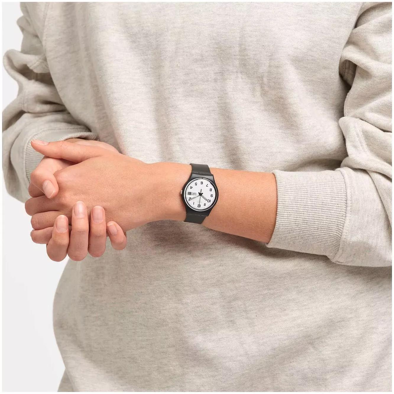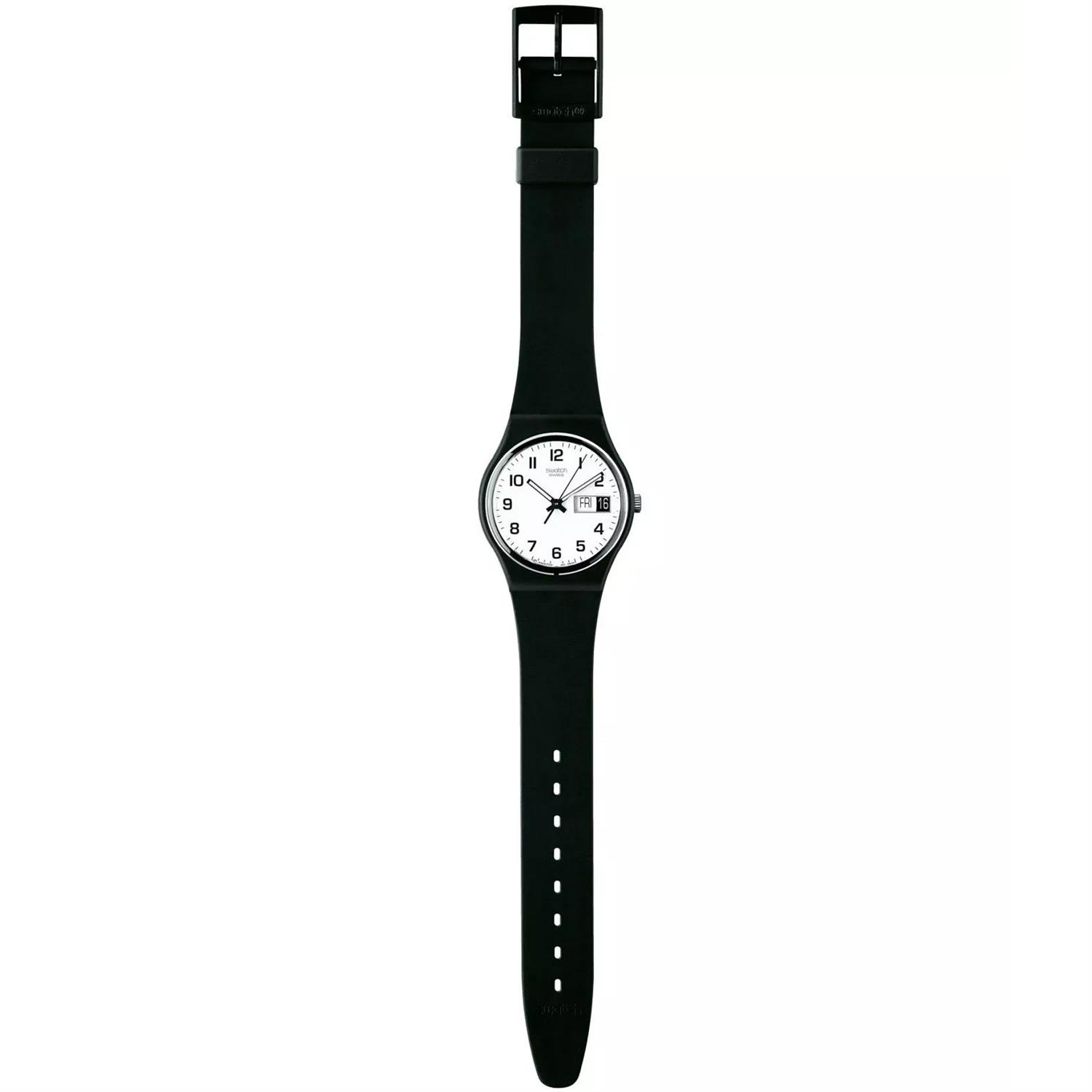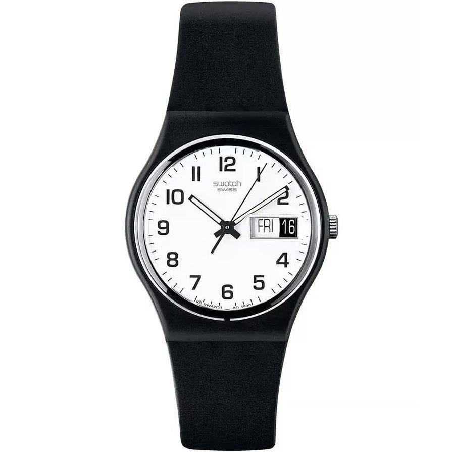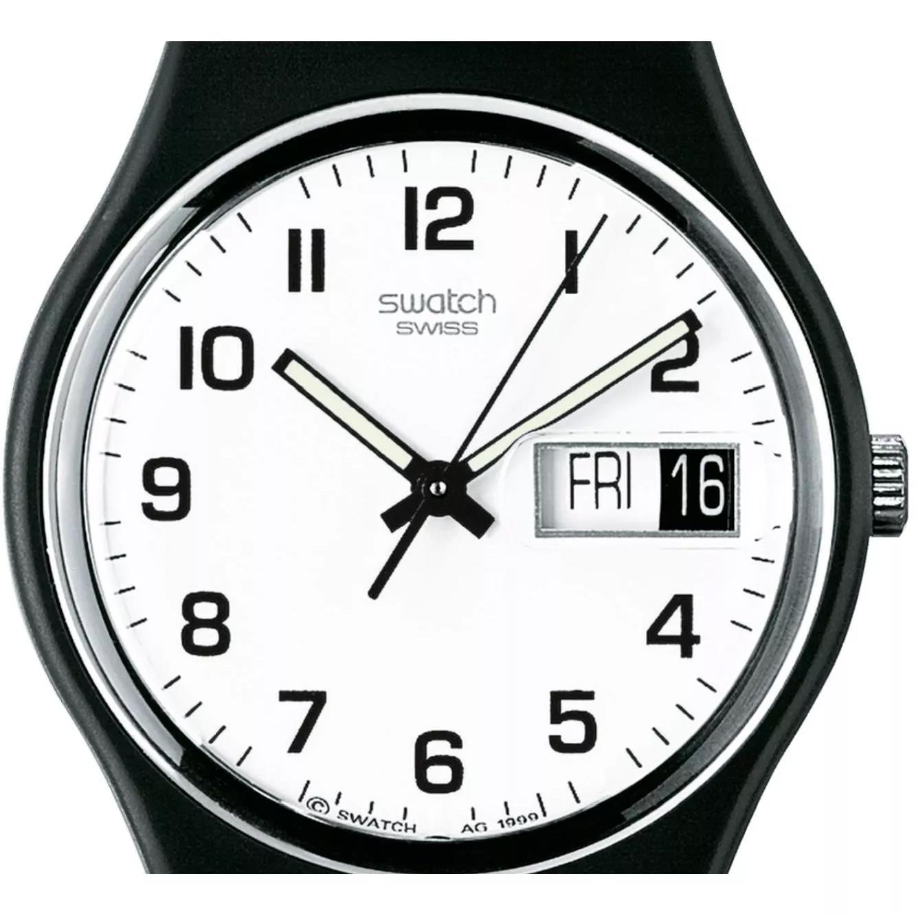 ساعت مچی پسرانه سواچ swatch با طراحی روزانه بند سیلیکونی مشکی و قاب گرد مشکی با صفحه گرد سفید و قابلیت داشتن روزهای هفته / شب نما / تقویم و موتور سوییسی با انرژی باطری و مقاوم در برابر آب تا عمق 30 متر به همراه گارانتی بین المللی
