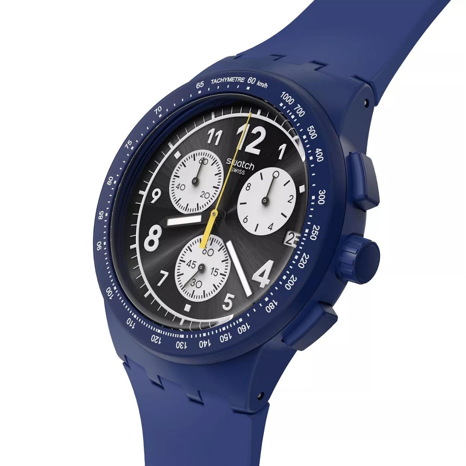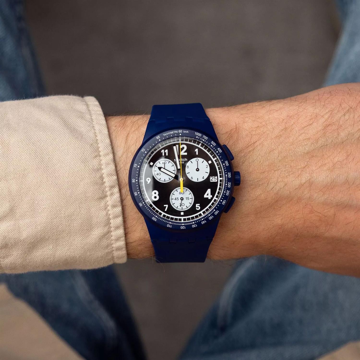 ساعت مچی مردانه سواچ SWATCH با طراحی روزانه بند سیلیکونی سرمه ای و قاب گرد سرمه ای و صفحه گرد مشکی سفید با موتور سوییسی و انرژی باتری با قابلیت داشتن کرنوگراف تقویم شبنما زه تاچی متر و مقاوم در برابر آب تا عمق 30 متر به همراه دو سال گارانتی بین المللی
