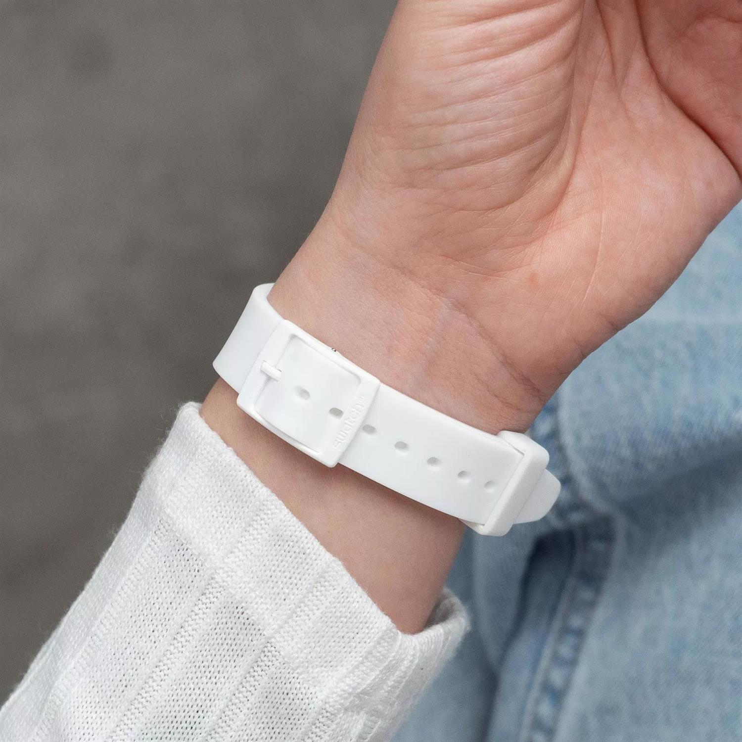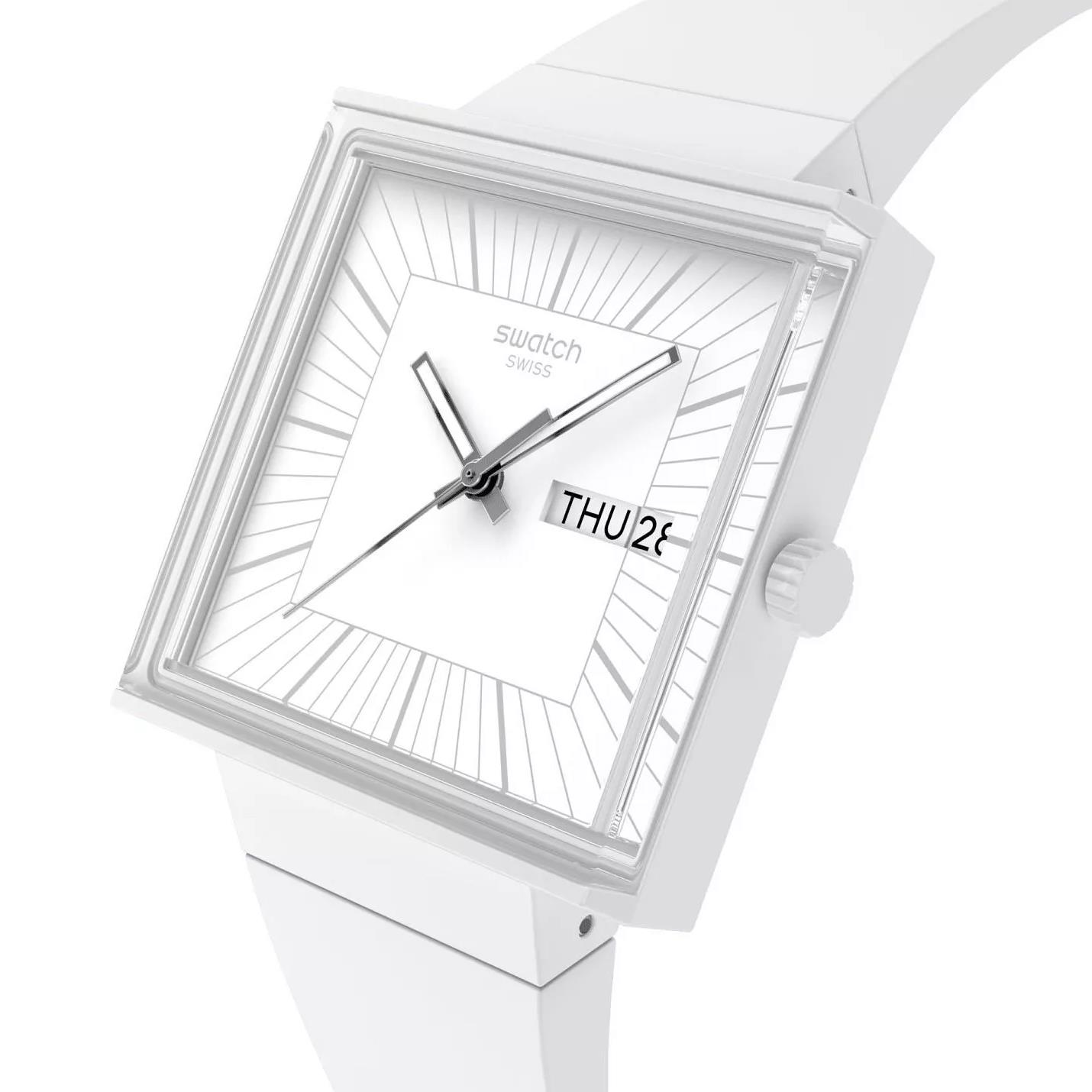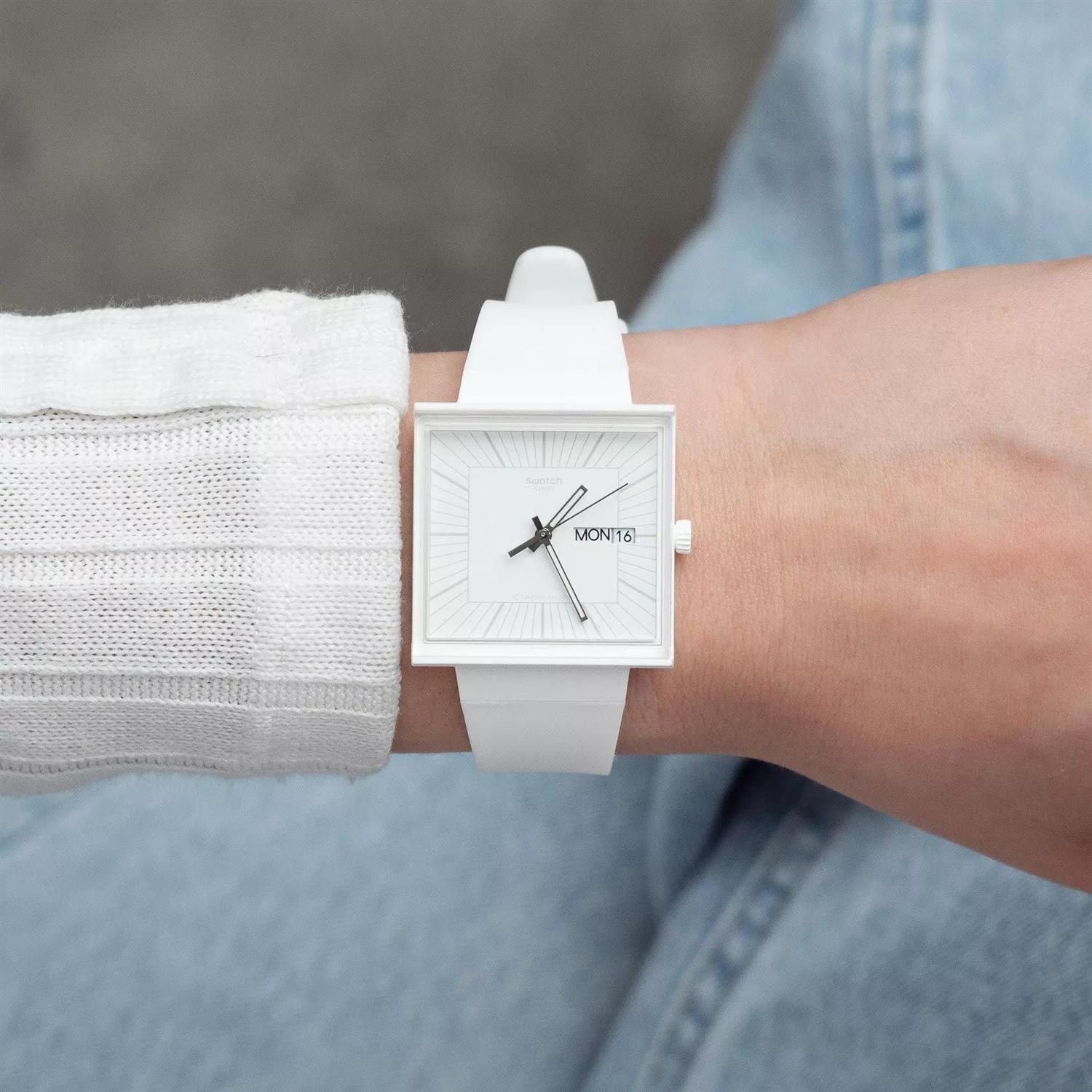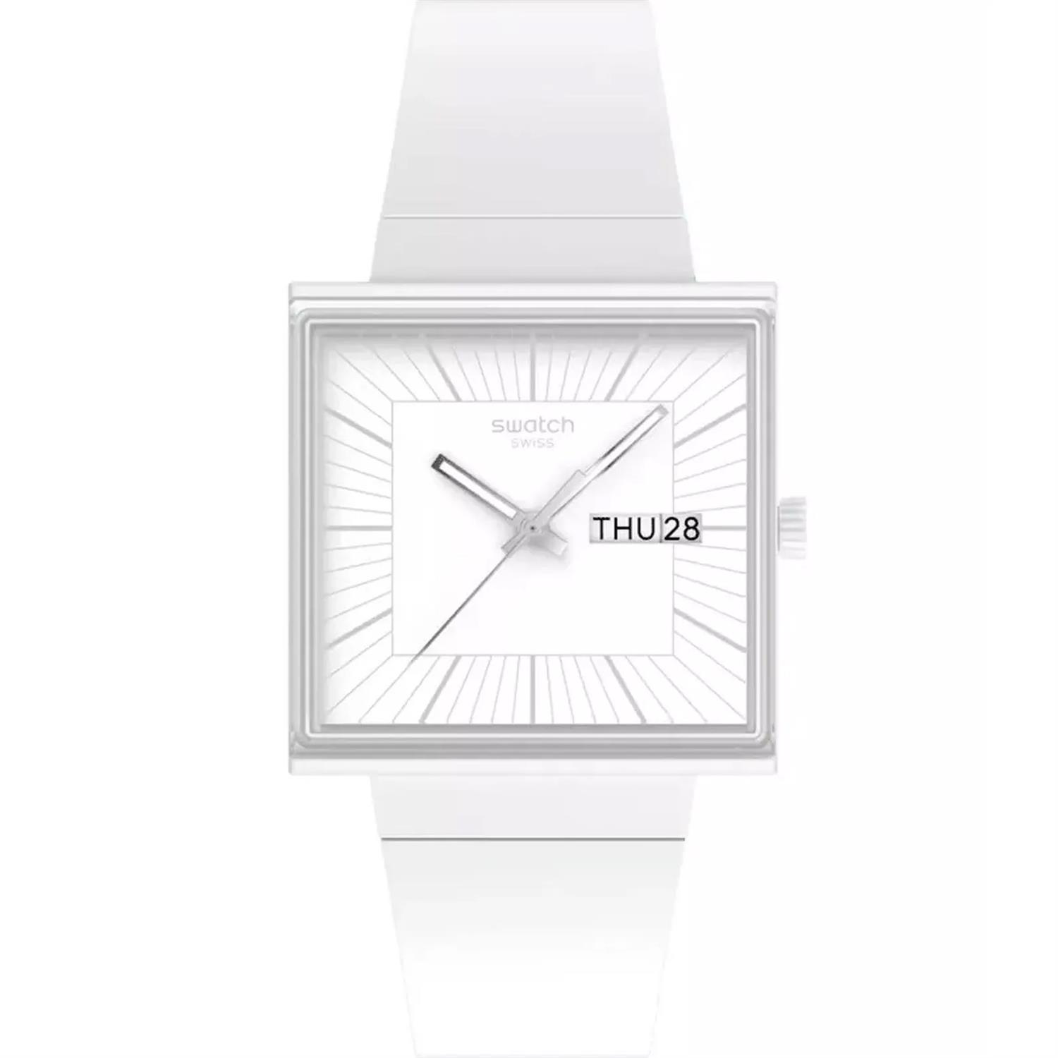 ساعت مچی زنانه / مردانه سواچ swatch با طراحی روزانه بند سیلیکونی سفید و قاب مربعی سفید با صفحه سفید و قابلیت داشتن شب نما / روزهای هفته / تقویم و موتور سوییسی با انرژی باطری و مقاوم در برابر آب تا عمق 30 متر به همراه گارانتی بین المللی