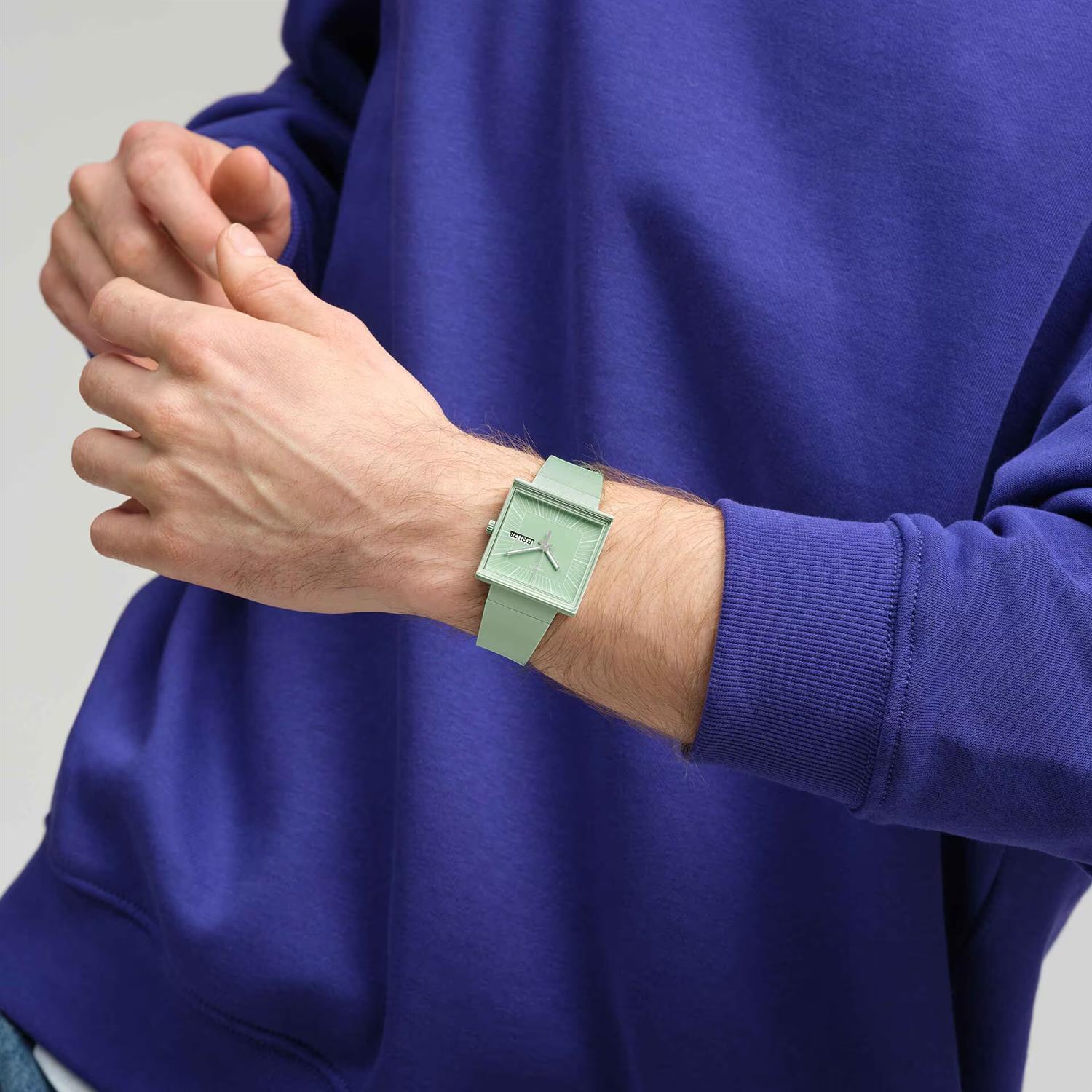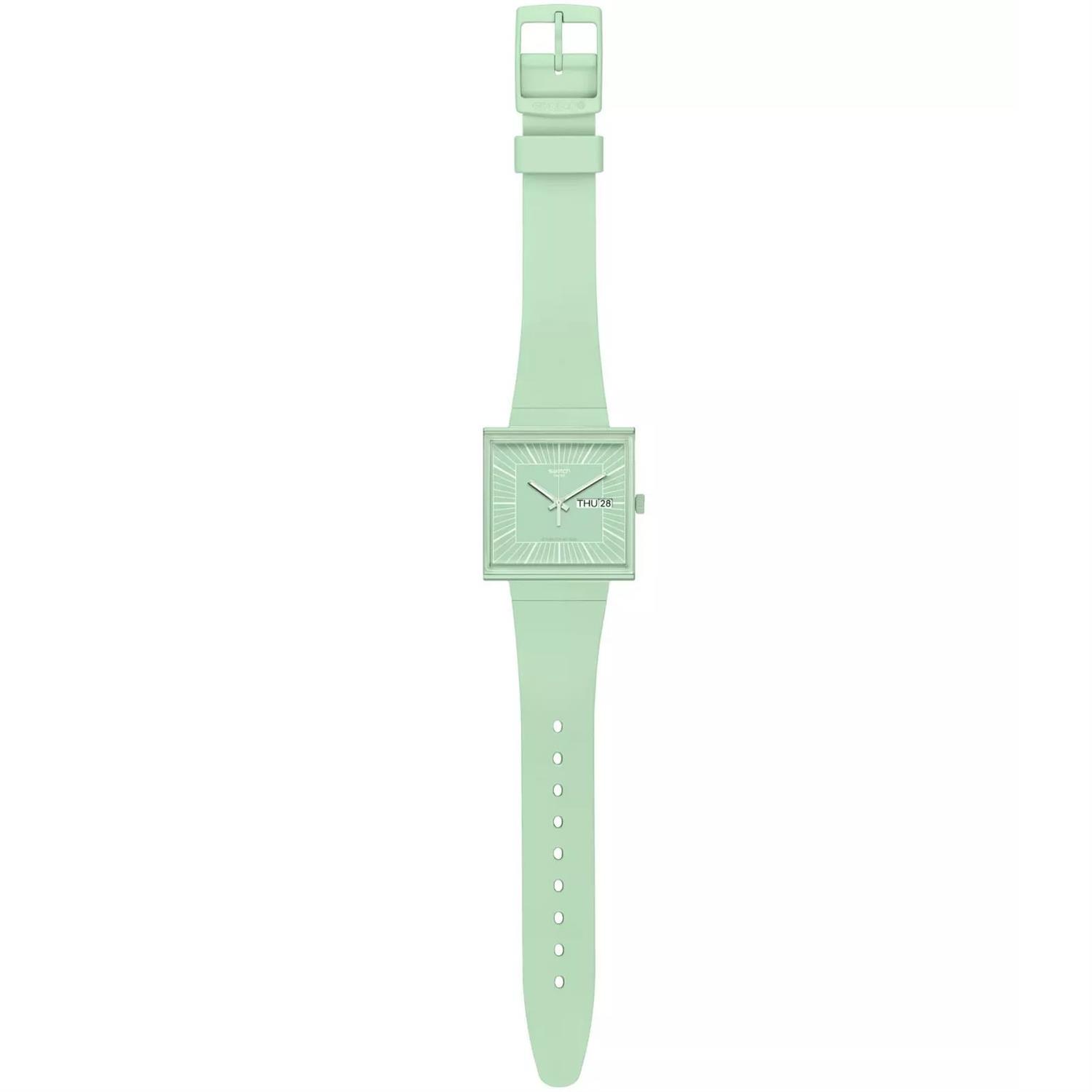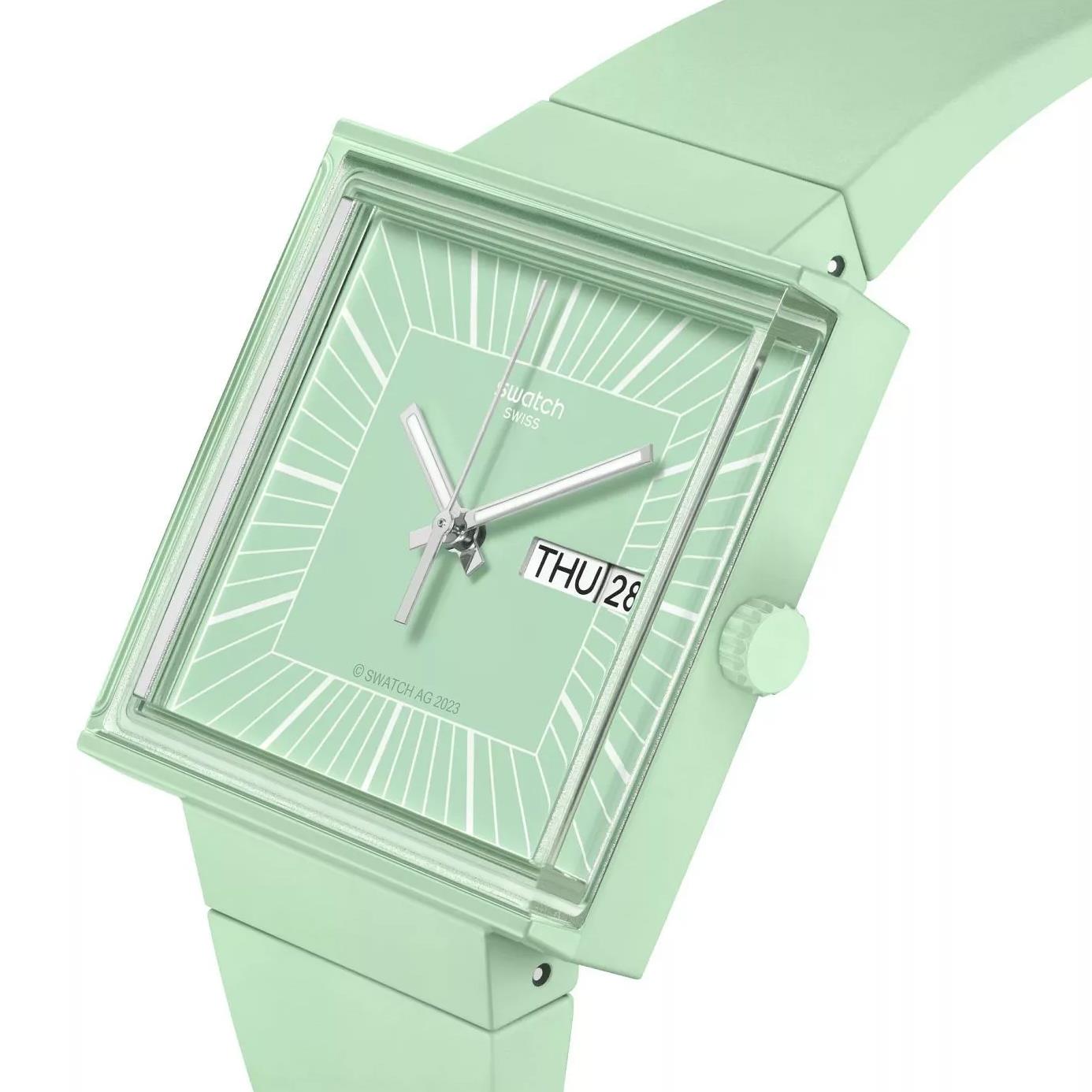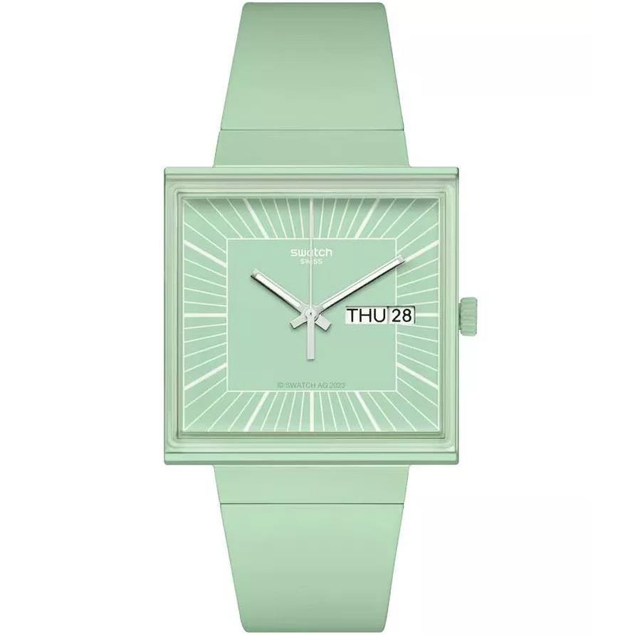 ساعت مچی زنانه سواچ SWATCH با طراحی روزانه بند سیلیکونی سبز و قاب مربعی سبز و صفحه سبز با قابلیت داشتن شب نما / تقویم /روزهای هفته و موتور سوییسی و انرژی باتری و مقاوم در برابر آب تا عمق 30 متر به همراه دو سال گارانتی بین المللی