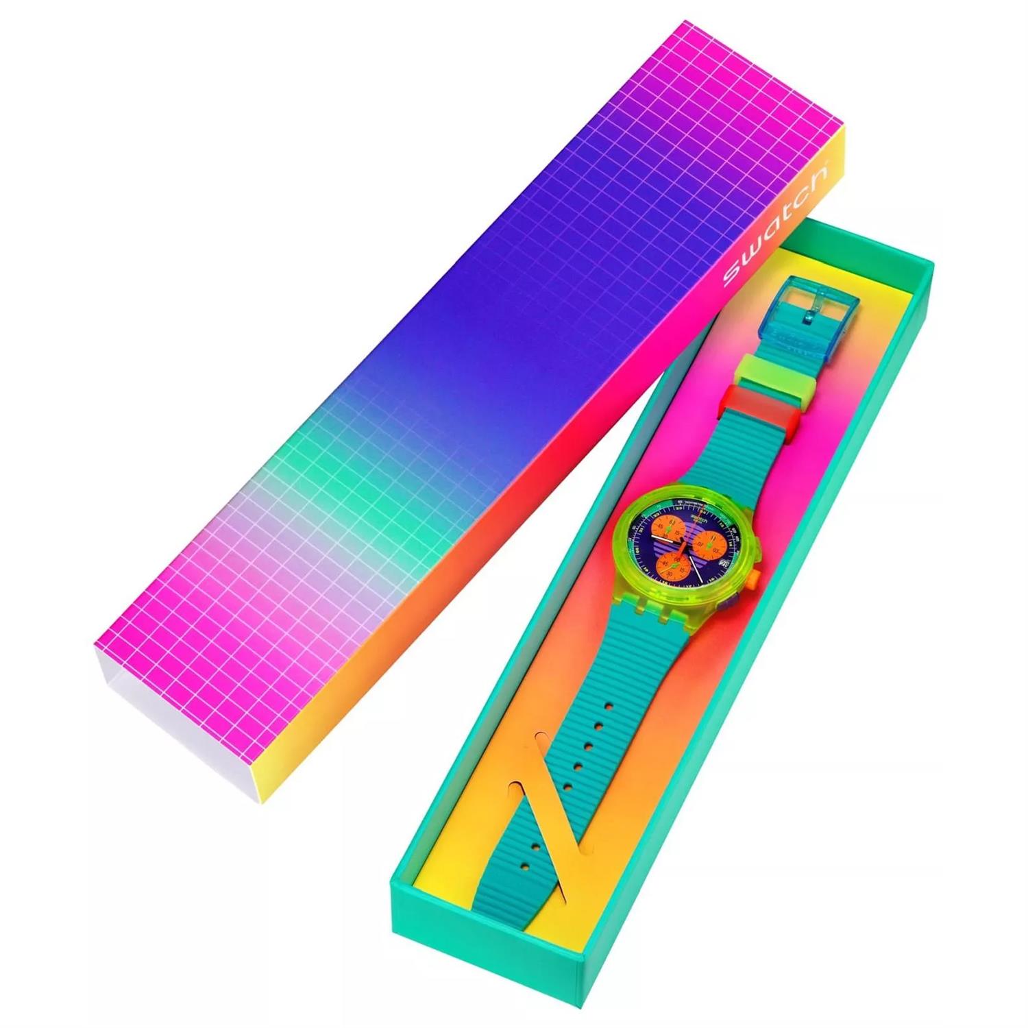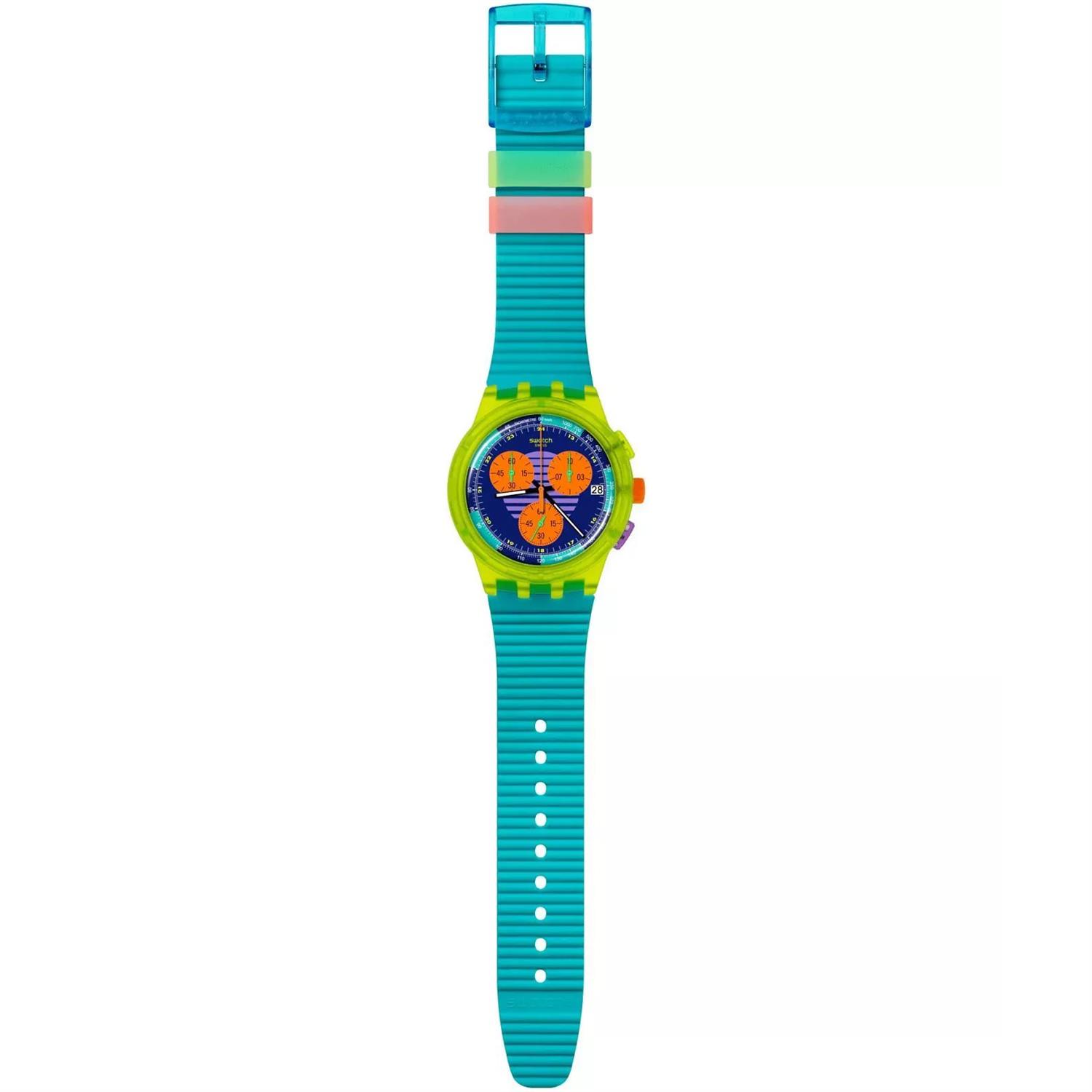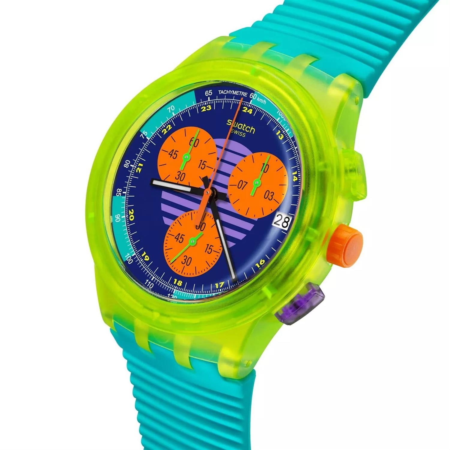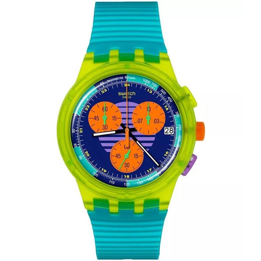 ساعت مچی مردانه/ زنانه سواچ SWATCH با طراحی روزانه بند سیلیکونی آبی و قاب گرد سبز و صفحه چند رنگ با قابلیت داشتن کرنوگراف / تقویم /شب نما / زه تاچی متر و موتور سوییسی با انرژی باتری و مقاوم در برابر آب تا عمق 30 متر به همراه دو سال گارانتی بین المللی