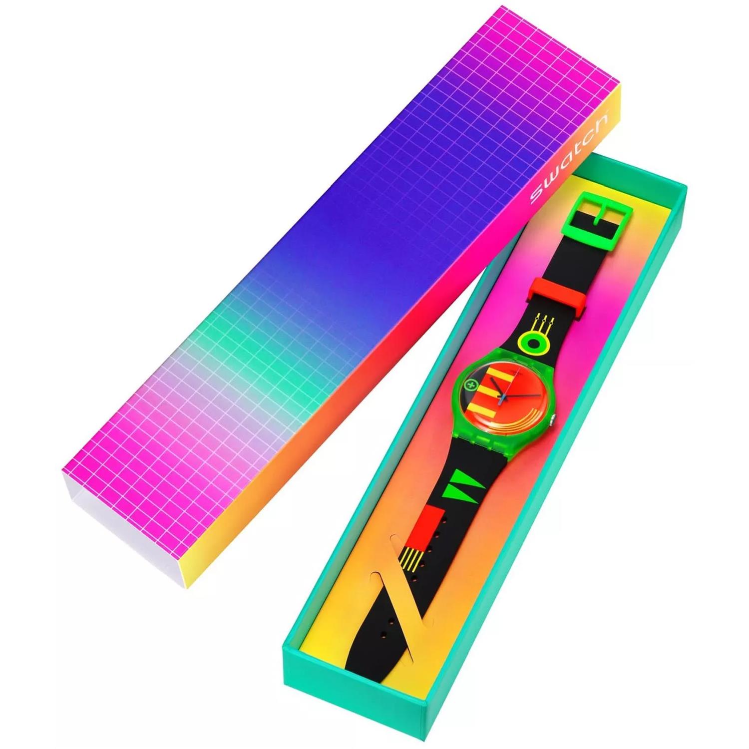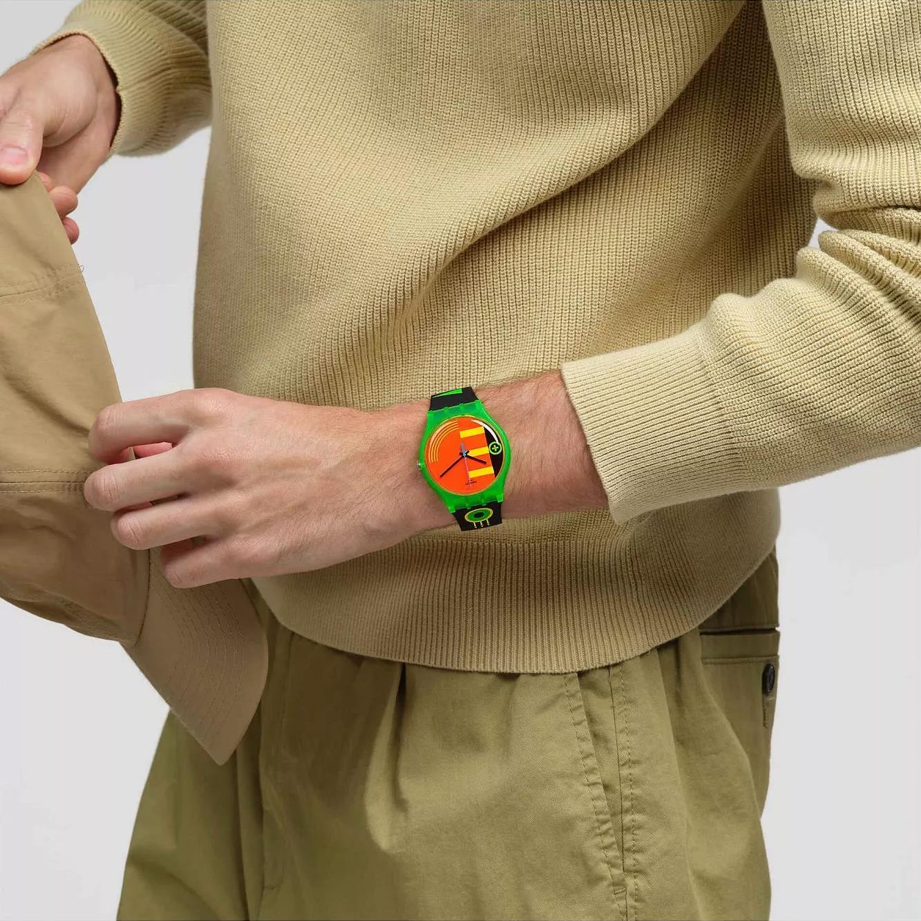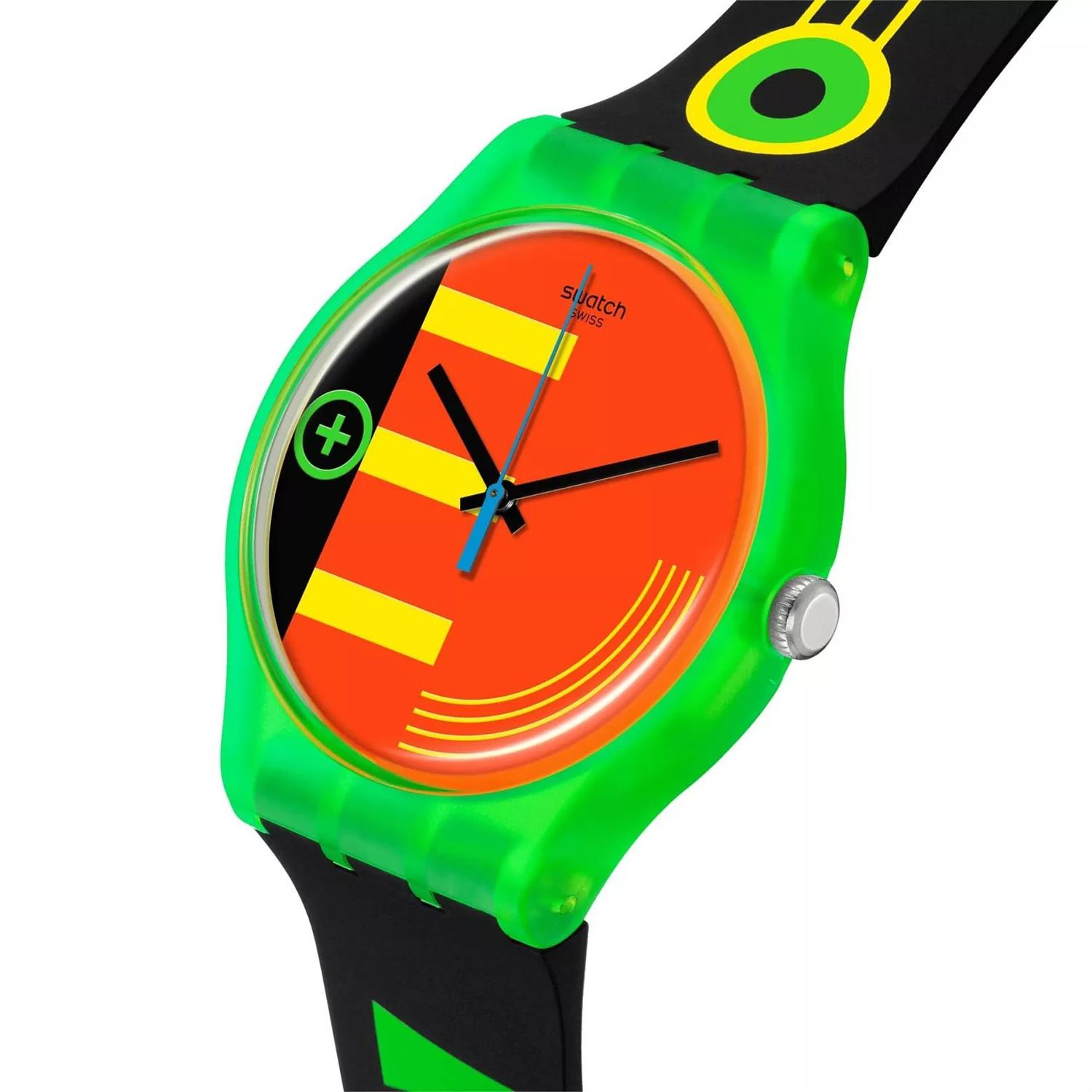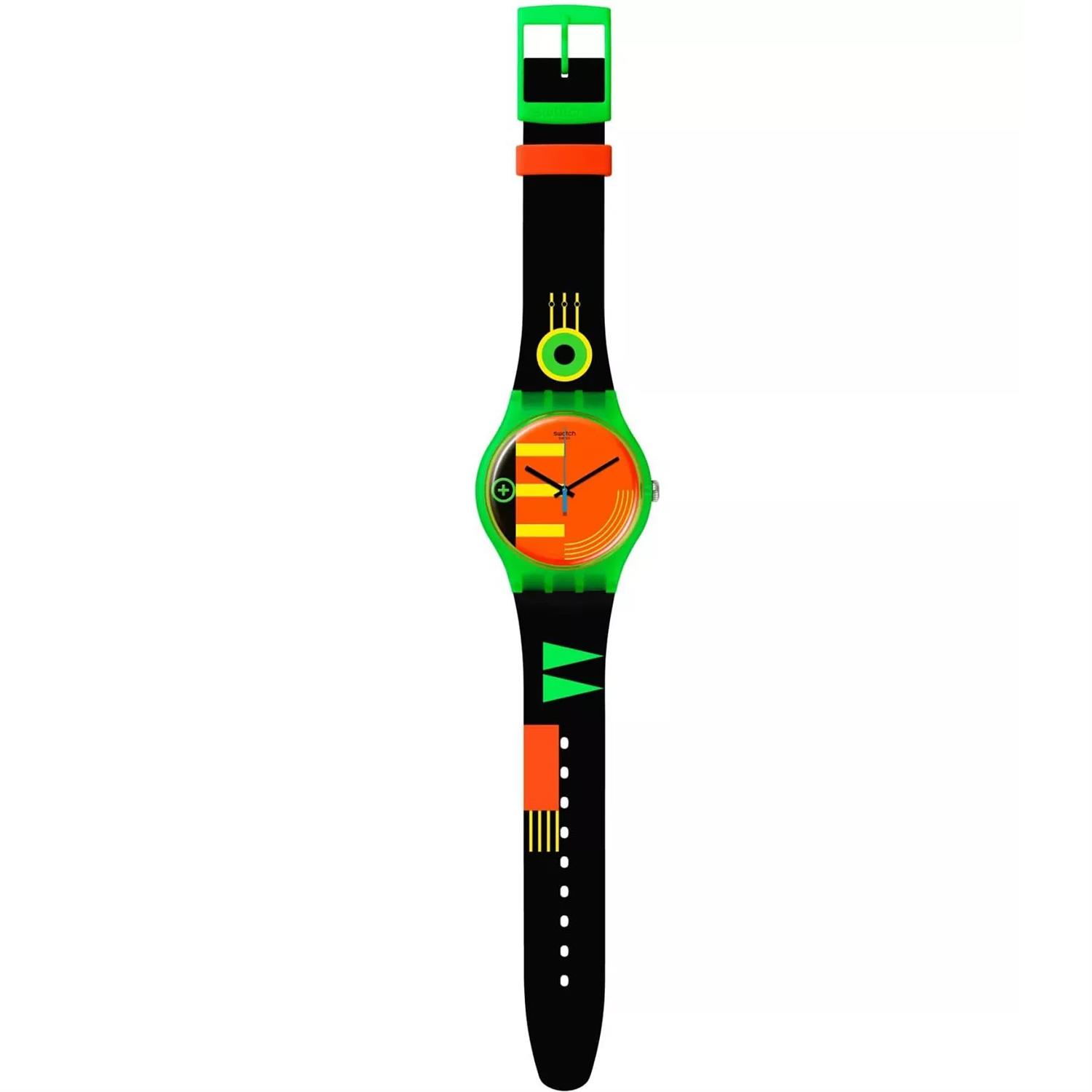 ساعت مچی مردانه/ زنانه سواچ SWATCH با طراحی روزانه بند سیلیکونی چند رنگ و قاب گرد سبز و صفحه چند رنگ با موتور سوییسی و انرژی باتری و مقاوم در برابر آب تا عمق 30 متر به همراه دو سال گارانتی بین المللی
