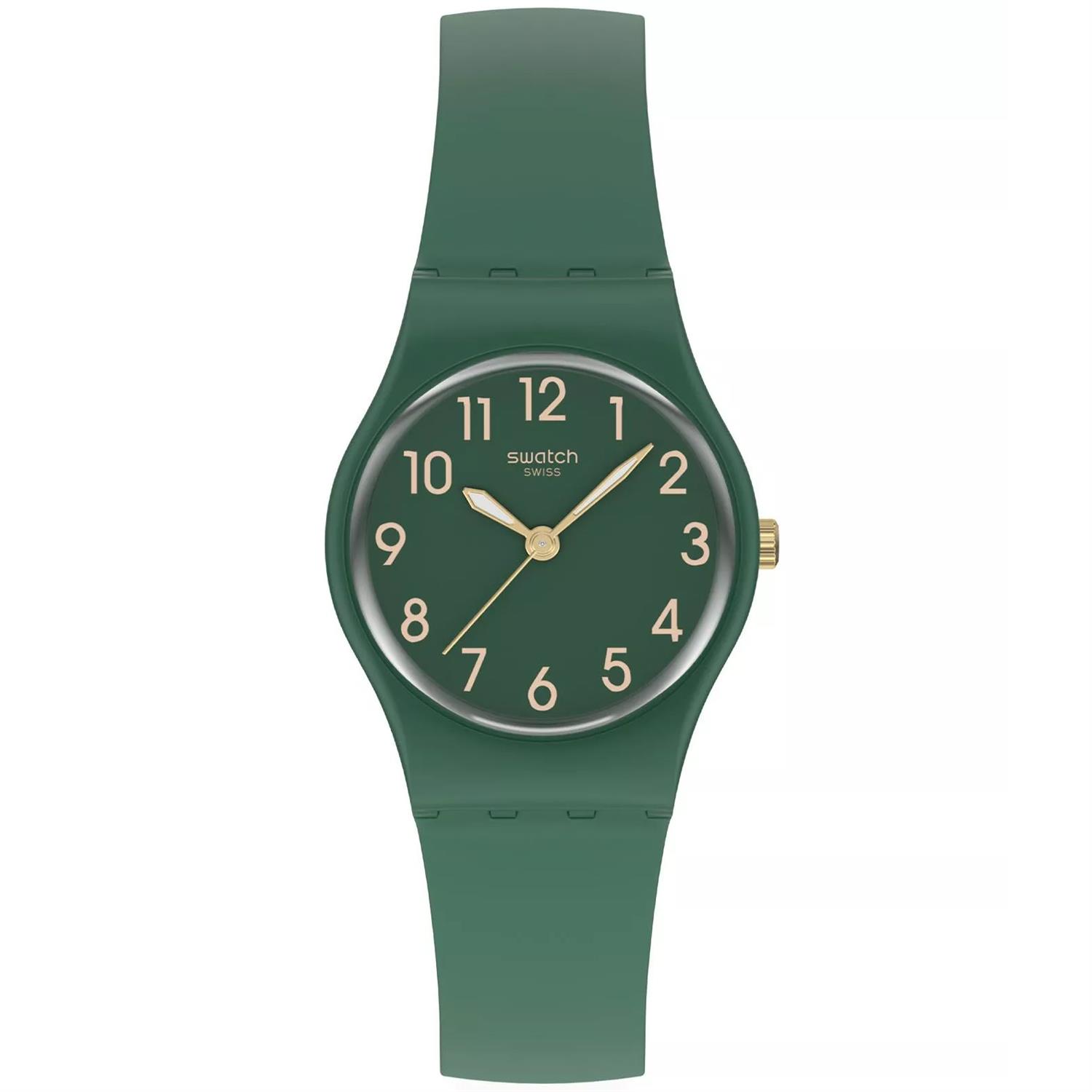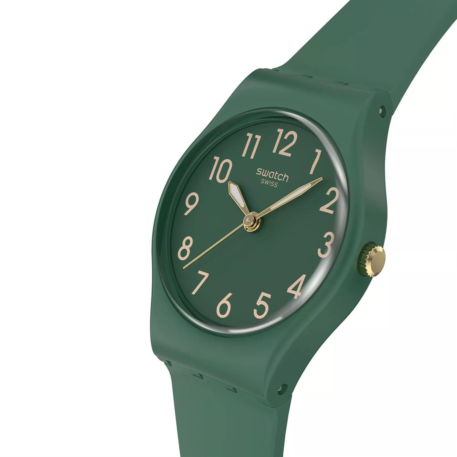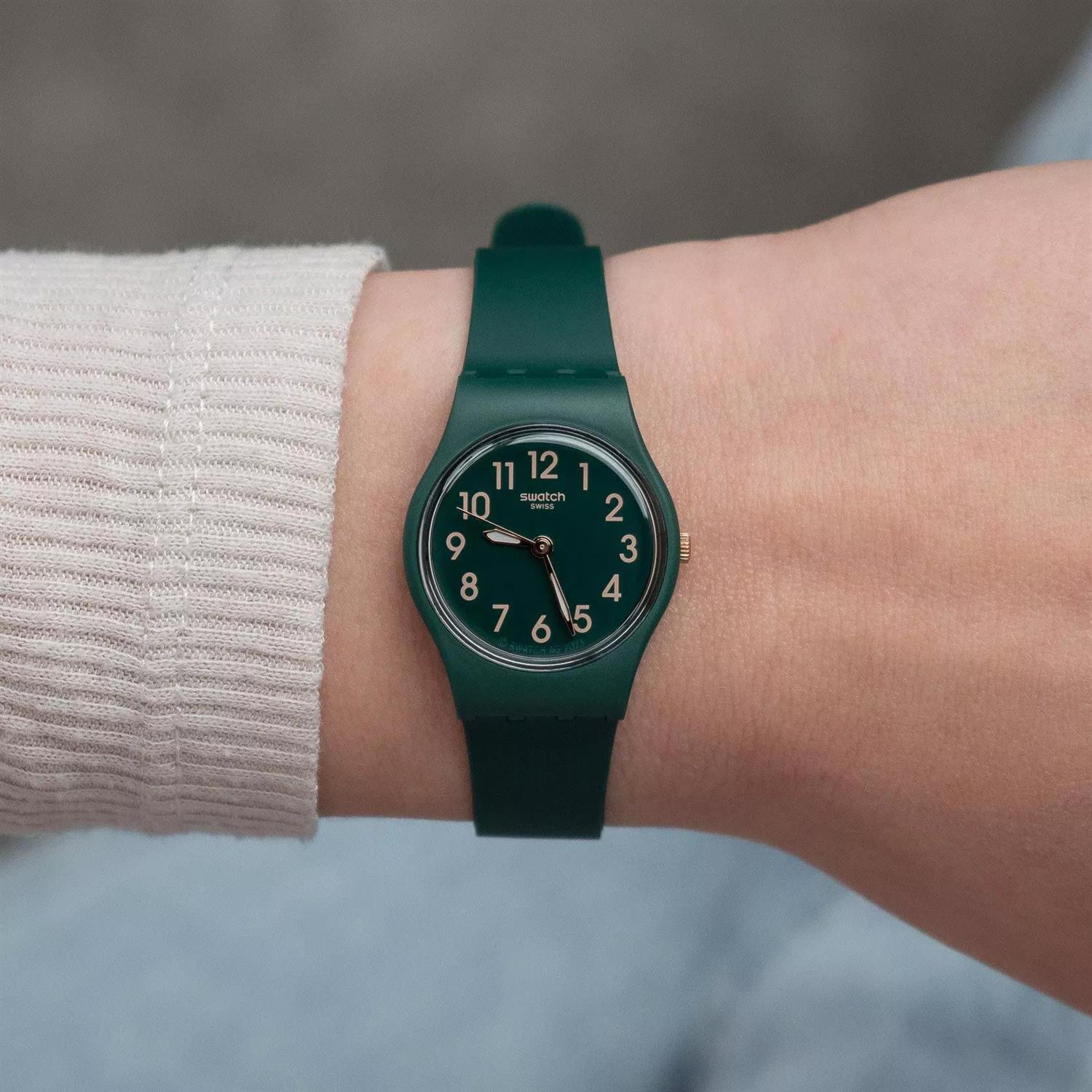 ساعت مچی زنانه سواچ swatch با طراحی روزانه بند سیلیکونی سبز و قاب گرد سبز با صفحه گرد سبز و قابلیت داشتن شب نما و موتور سوییسی با انرژی باطری و مقاوم در برابر آب تا عمق 30 متر به همراه گارانتی بین المللی