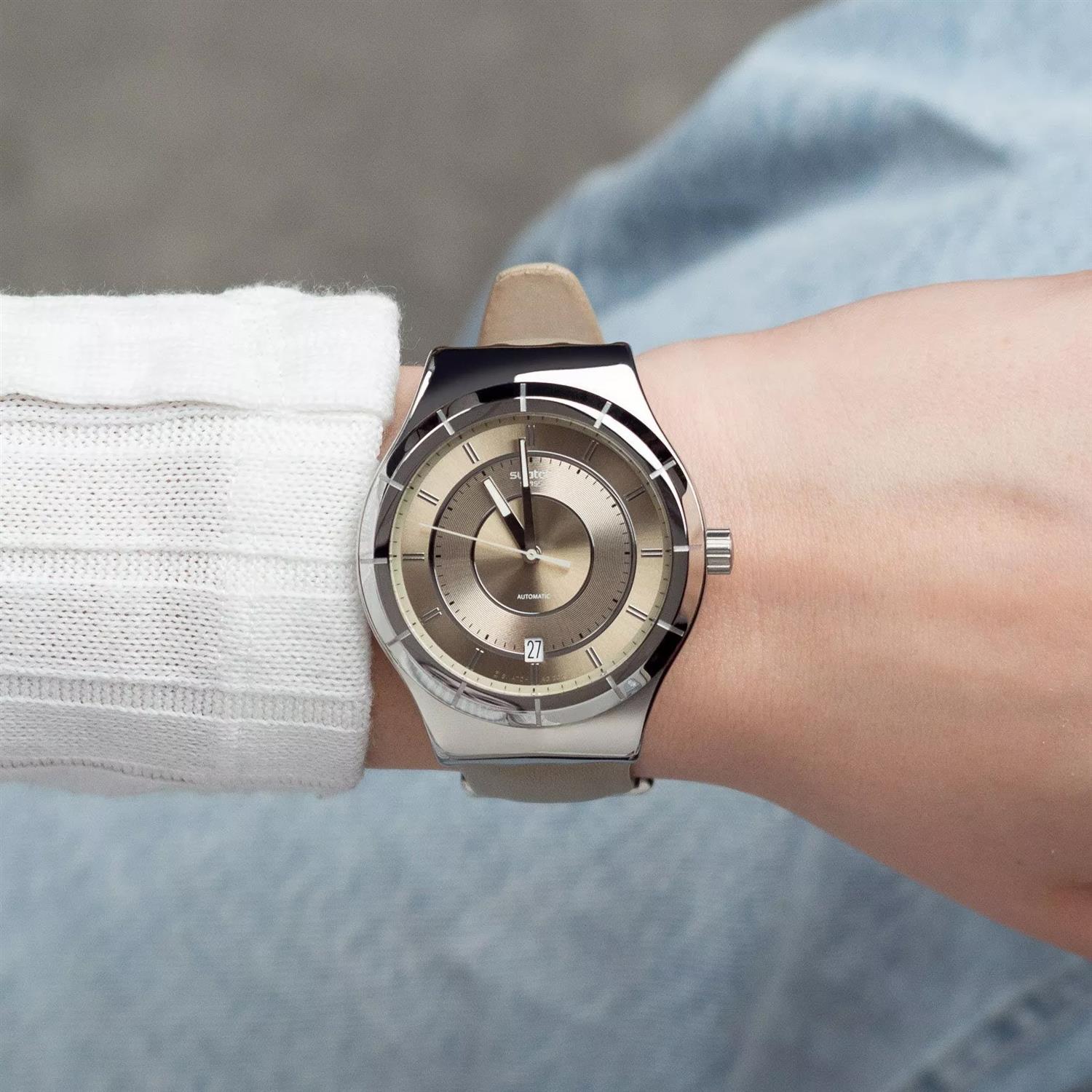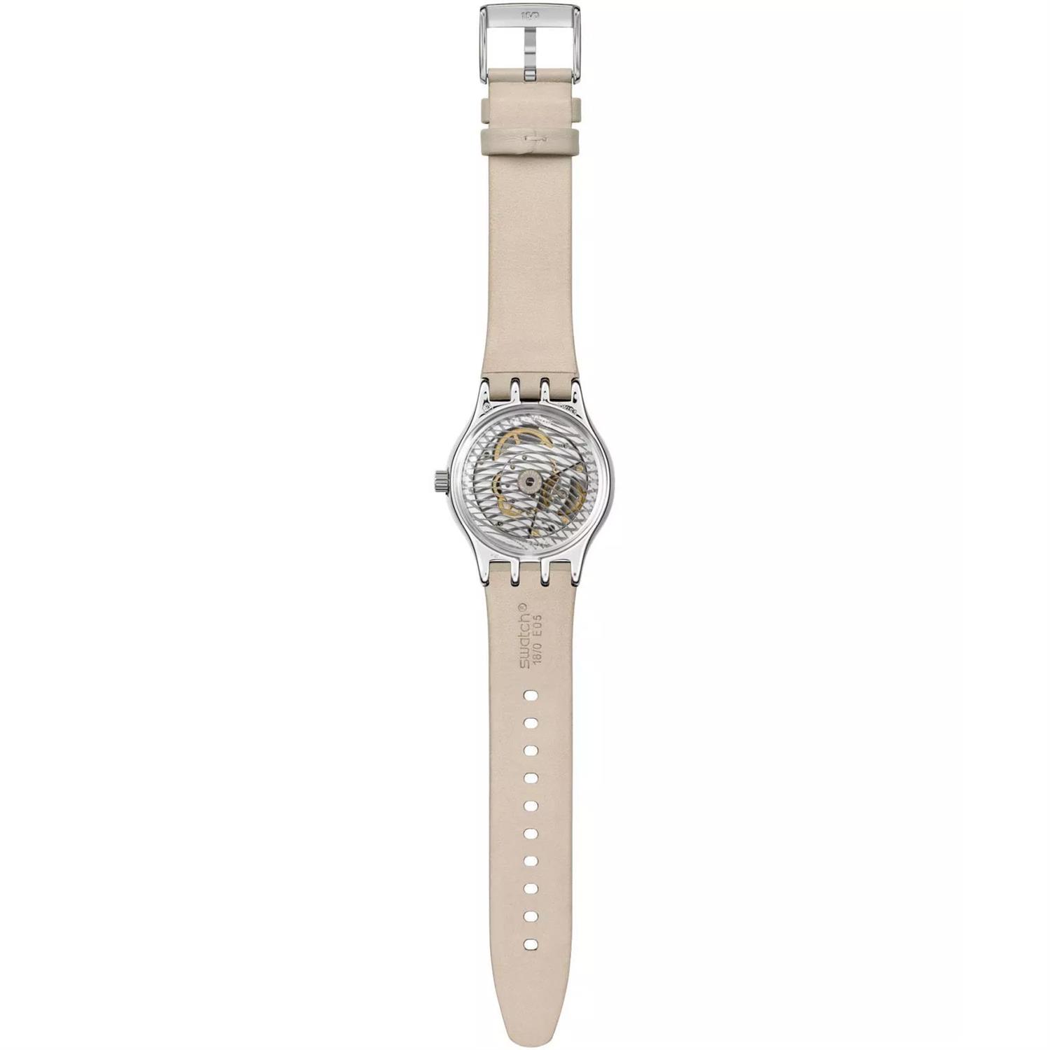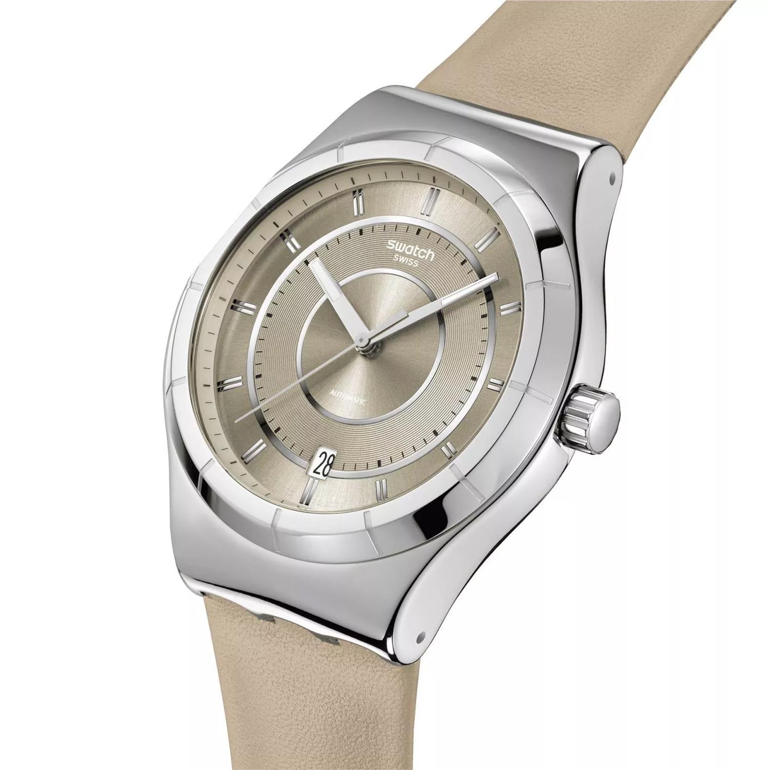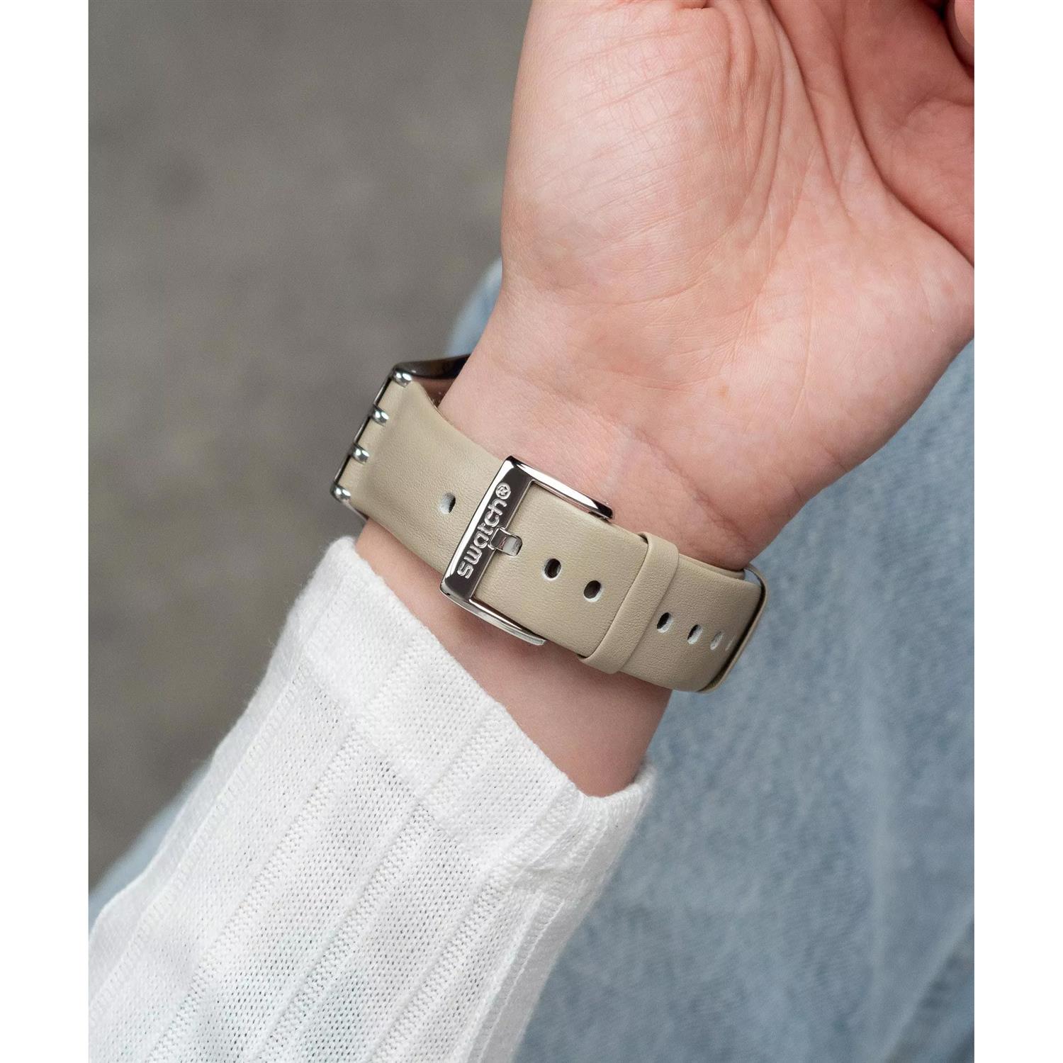 ساعت مچی مردانه سواچ SWATCH با طراحی روزانه بند چرمی کرم و قاب گرد استیل و صفحه کرم با قابلیت داشتن شب نما / تقویم و موتوراتوماتیک سوییسی و انرژی مکانیکی و مقاوم در برابر آب تا عمق 30 متر به همراه دو سال گارانتی بین المللی