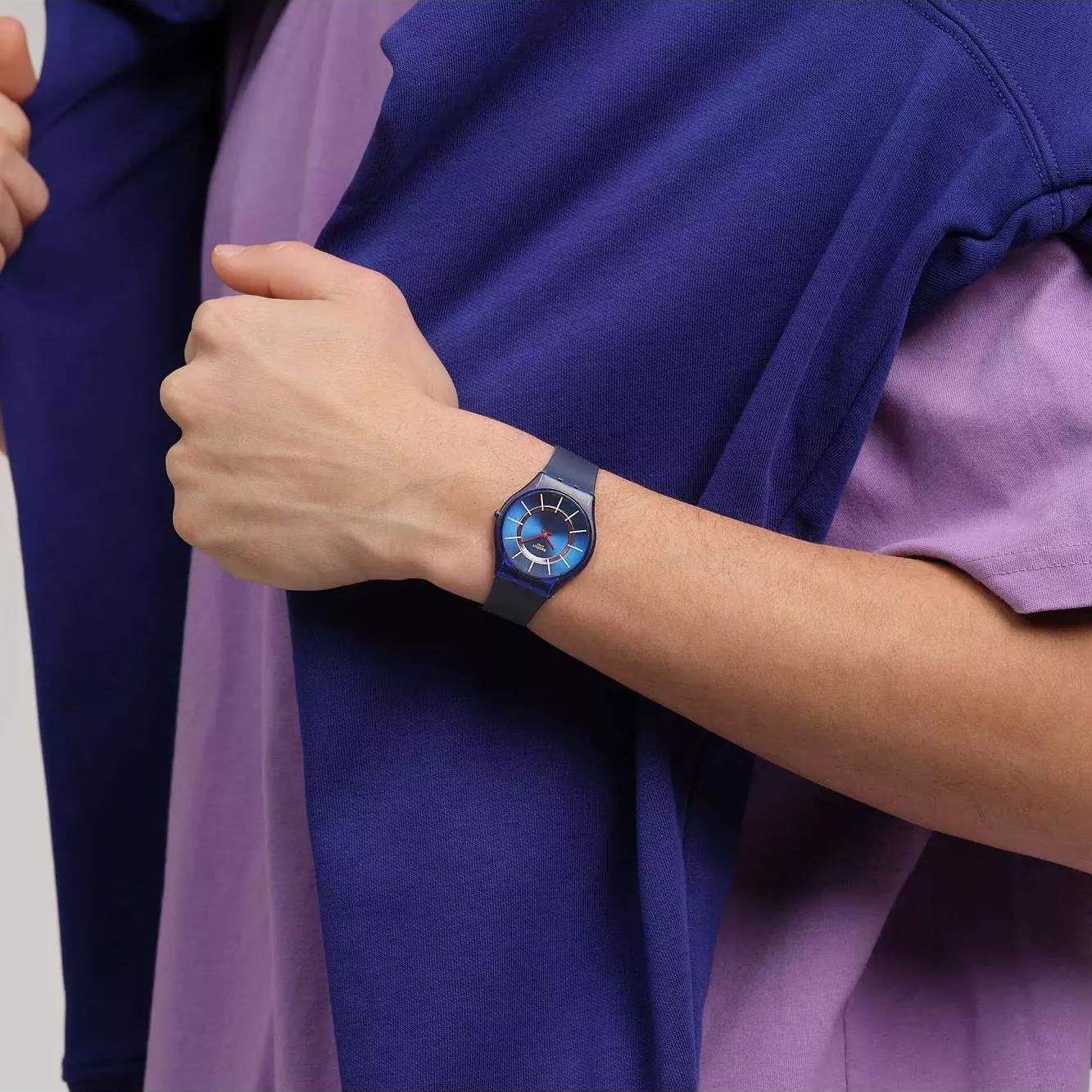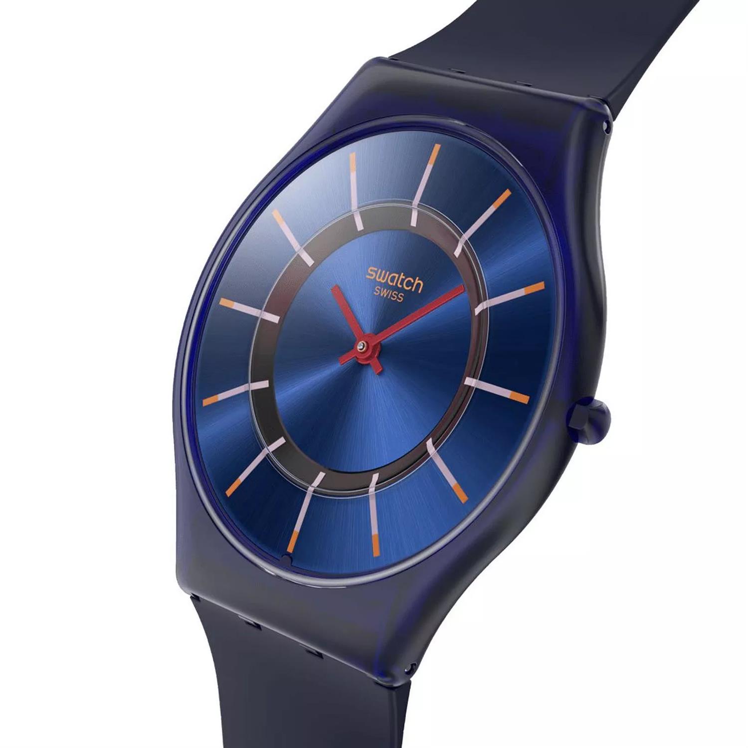 ساعت مچی زنانه سواچ swatch بسیار نازک با طراحی روزانه بند سیلیکونی سرمه ای و قاب گرد سرمه ای با صفحه گرد سرمه ای و قابلیت داشتن شب نما و موتور سوییسی با انرژی باطری و مقاوم در برابر آب تا عمق 30 متر به همراه گارانتی بین المللی