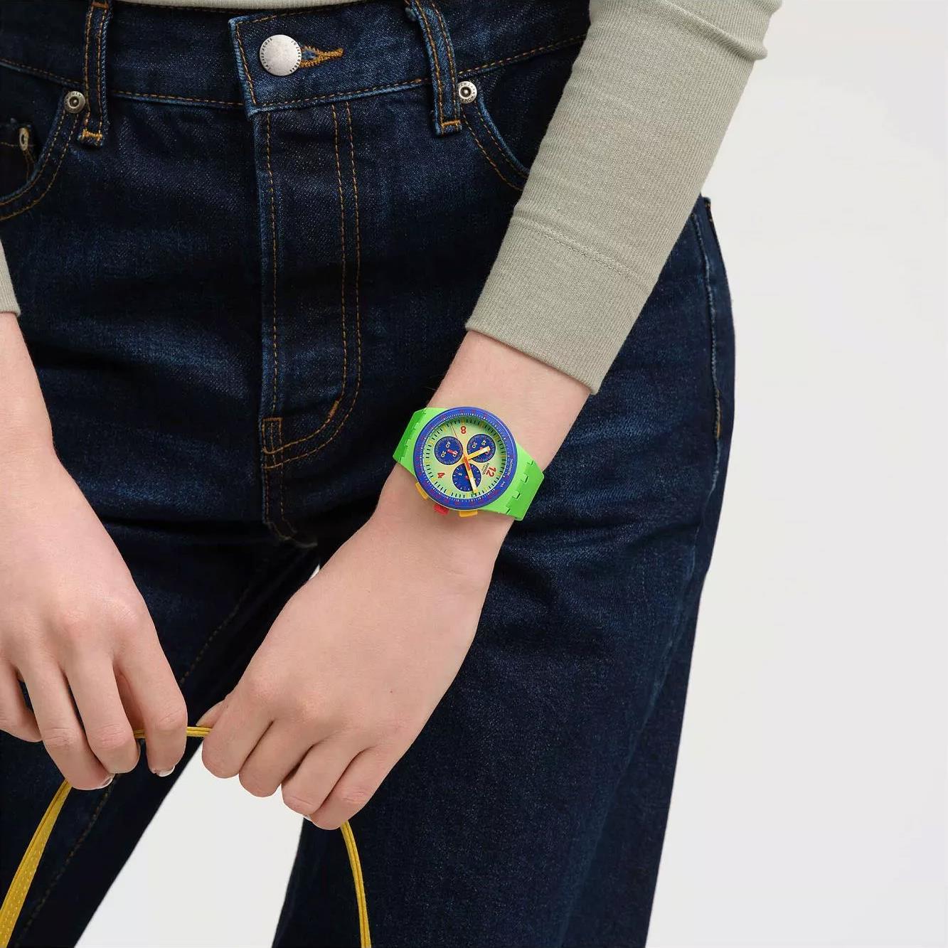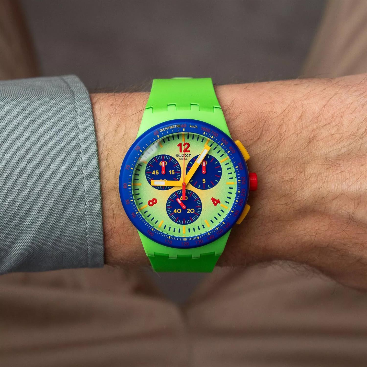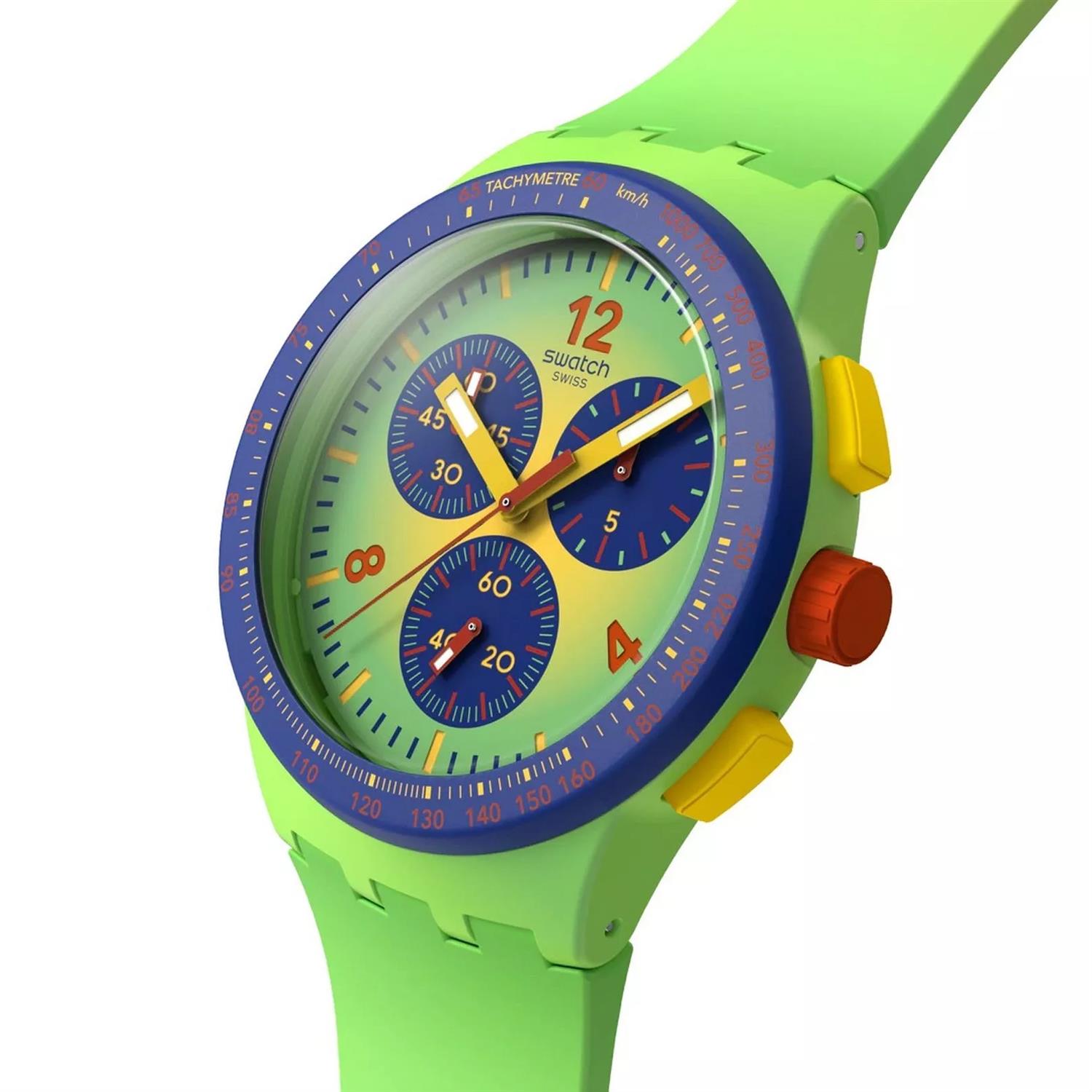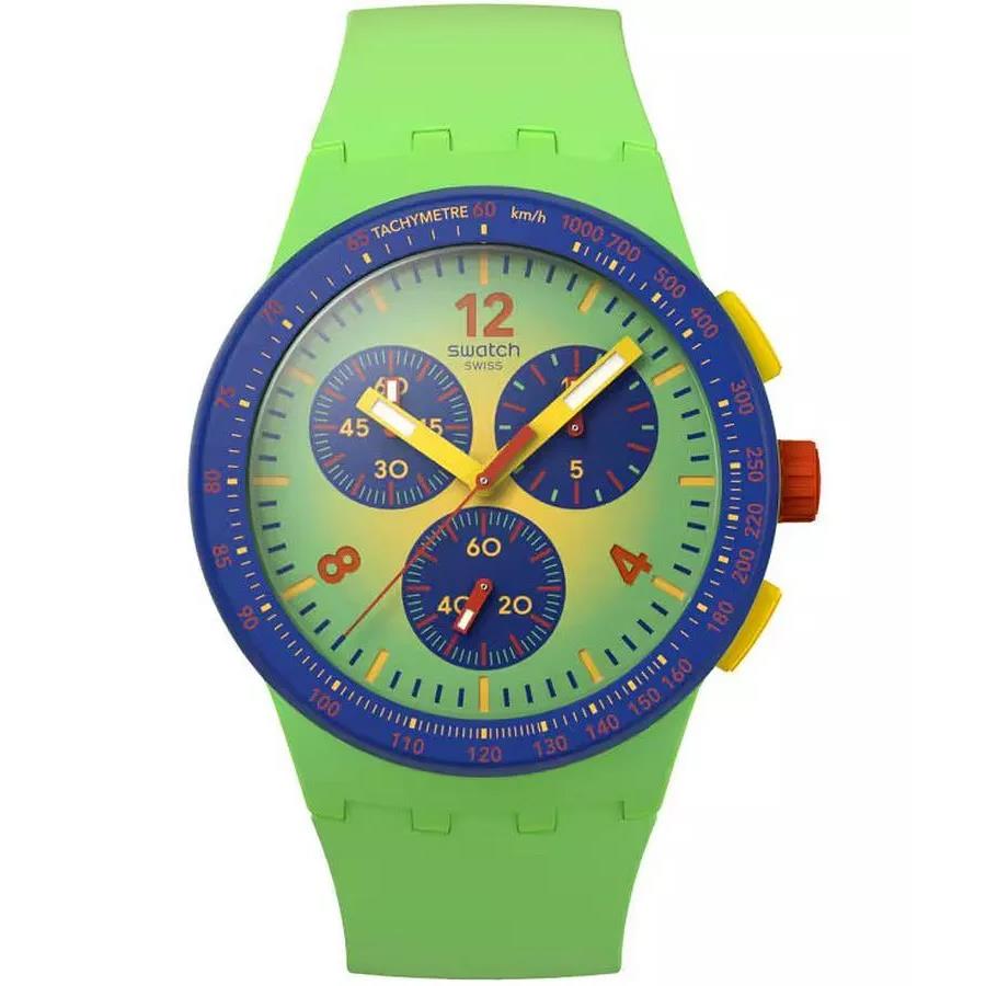 ساعت مچی مردانه سواچ SWATCH با طراحی روزانه بند سیلیکونی سبز و قاب گرد سرمه ای سبز و صفحه گرد چند رنگ با قابلیت داشتن شب نما / کرنوگراف / زه تاچی متر و موتور سوییسی و انرژی باتری و مقاوم در برابر آب تا عمق 30 متر به همراه دو سال گارانتی بین المللی