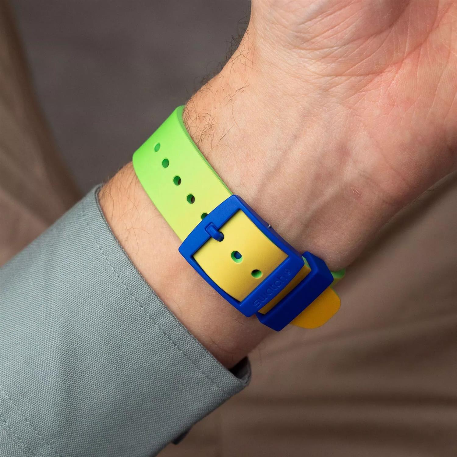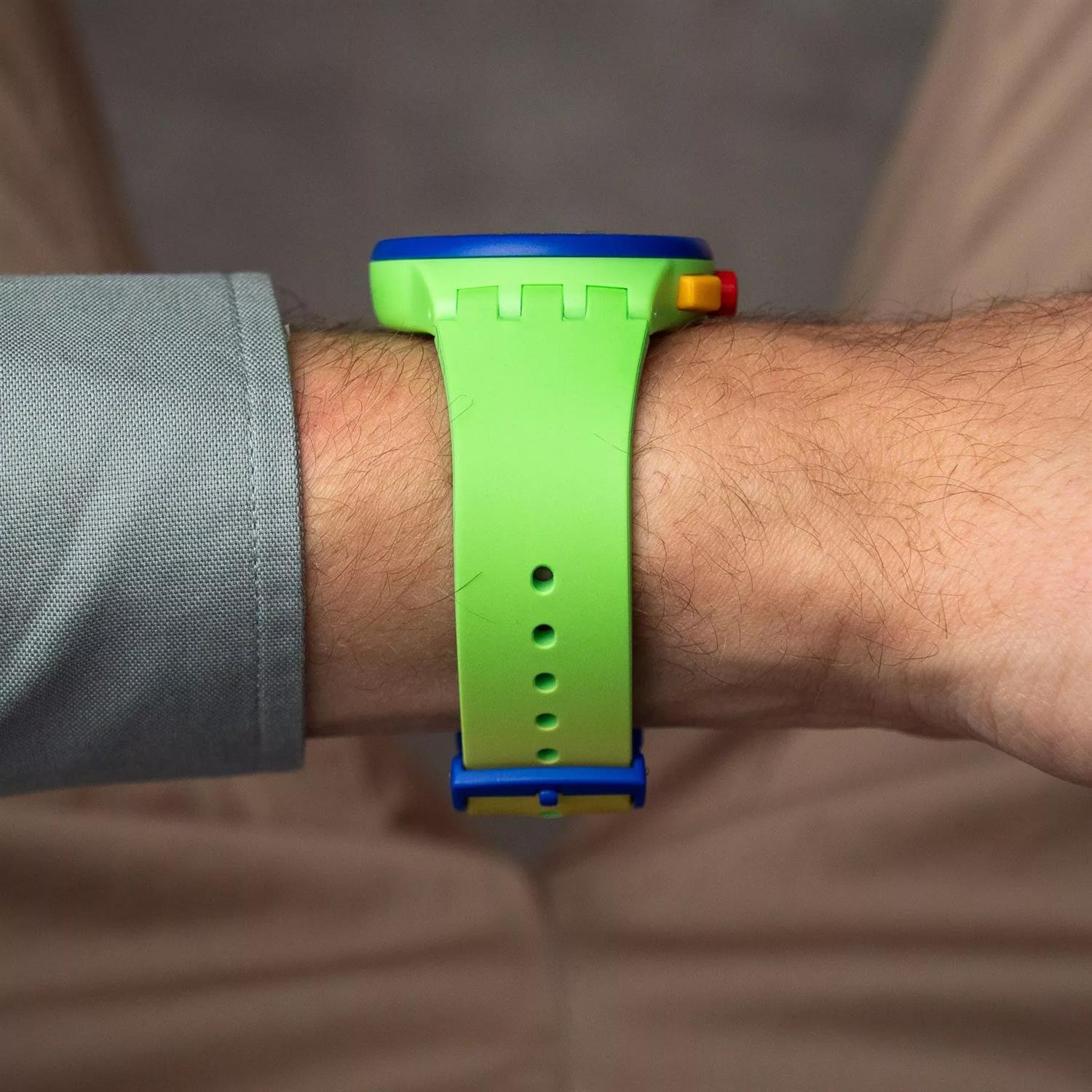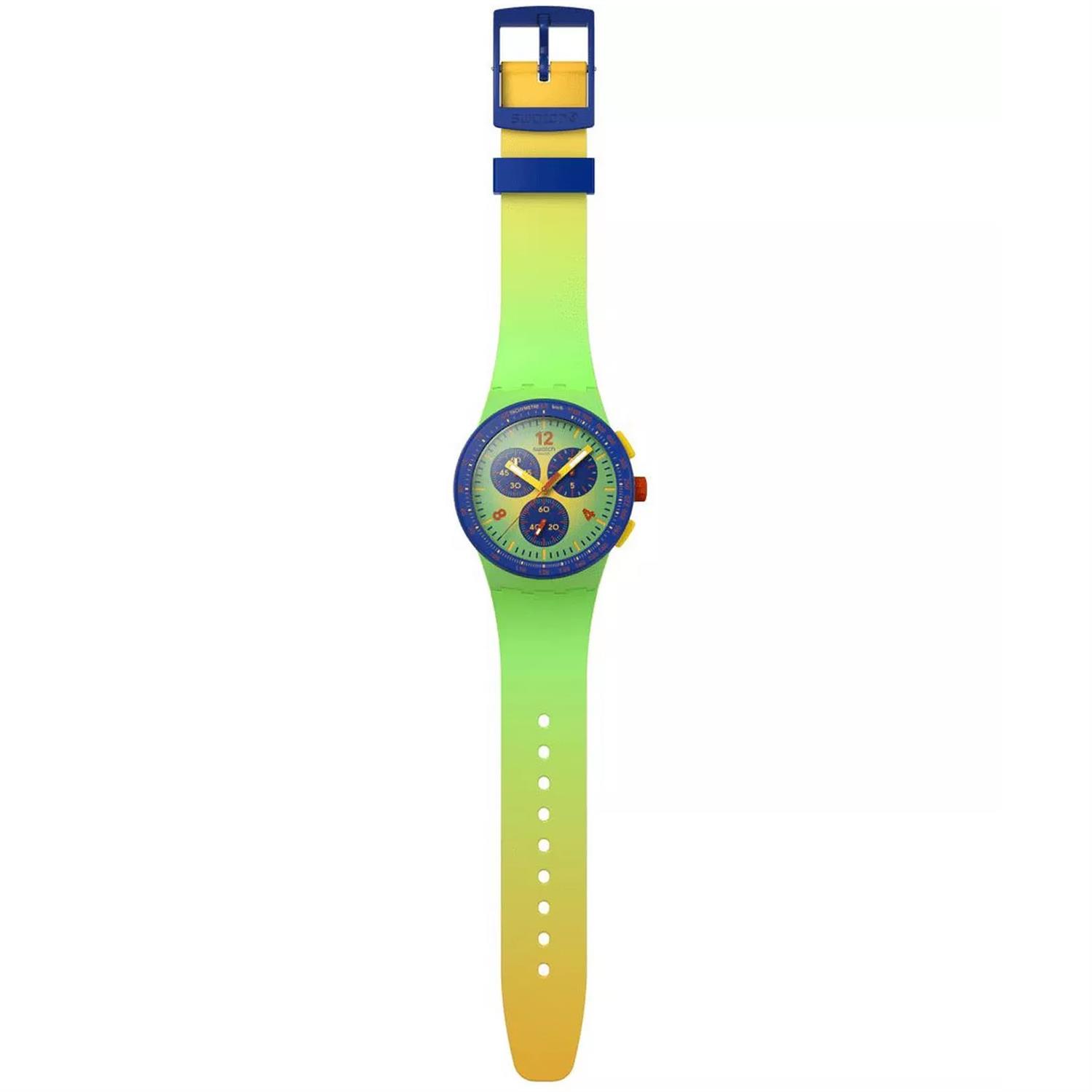 ساعت مچی مردانه سواچ SWATCH با طراحی روزانه بند سیلیکونی سبز و قاب گرد سرمه ای سبز و صفحه گرد چند رنگ با قابلیت داشتن شب نما / کرنوگراف / زه تاچی متر و موتور سوییسی و انرژی باتری و مقاوم در برابر آب تا عمق 30 متر به همراه دو سال گارانتی بین المللی