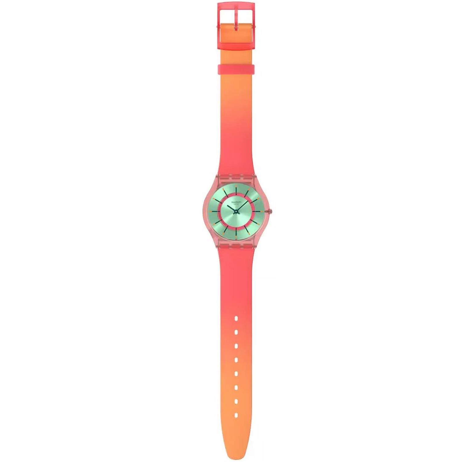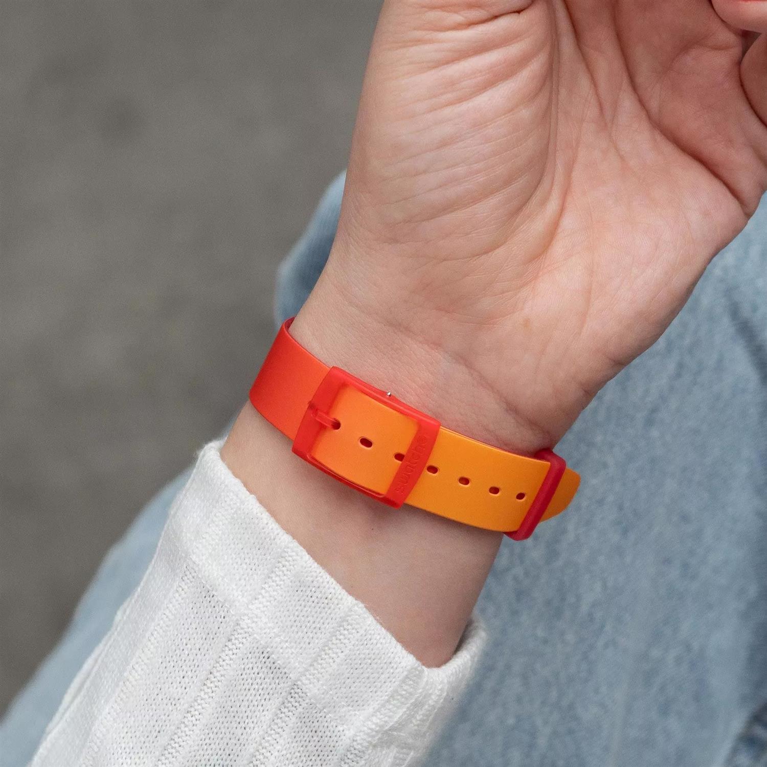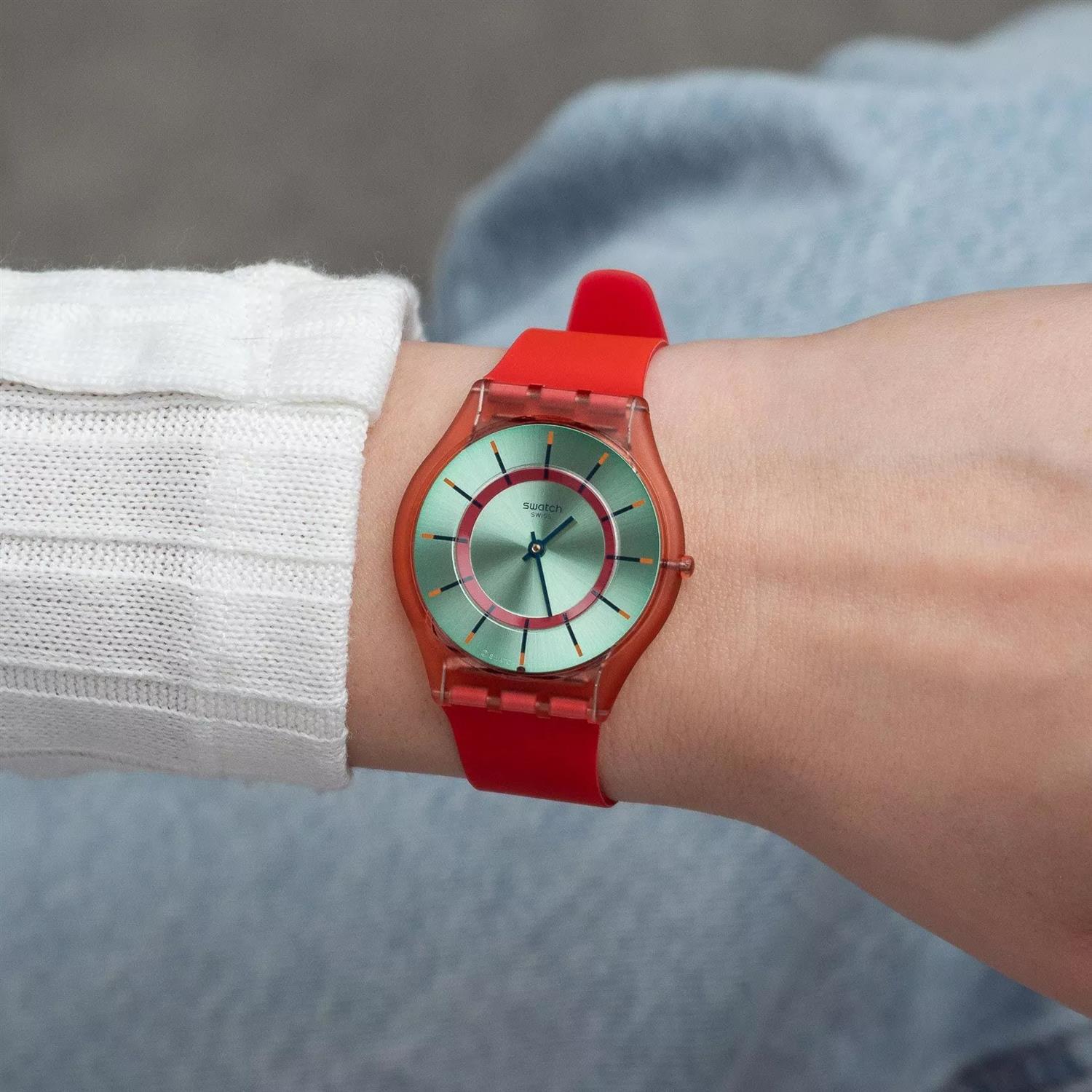 ساعت مچی زنانه سواچ swatch با طراحی روزانه بند سیلیکونی نارنجی و قاب گرد نازک نارنجی و صفحه گرد دو رنگ و قابلیت داشتن شب نما و موتور سوییسی با انرژی باطری و مقاوم در برابر آب تا عمق 30 متر به همراه گارانتی بین المللی
