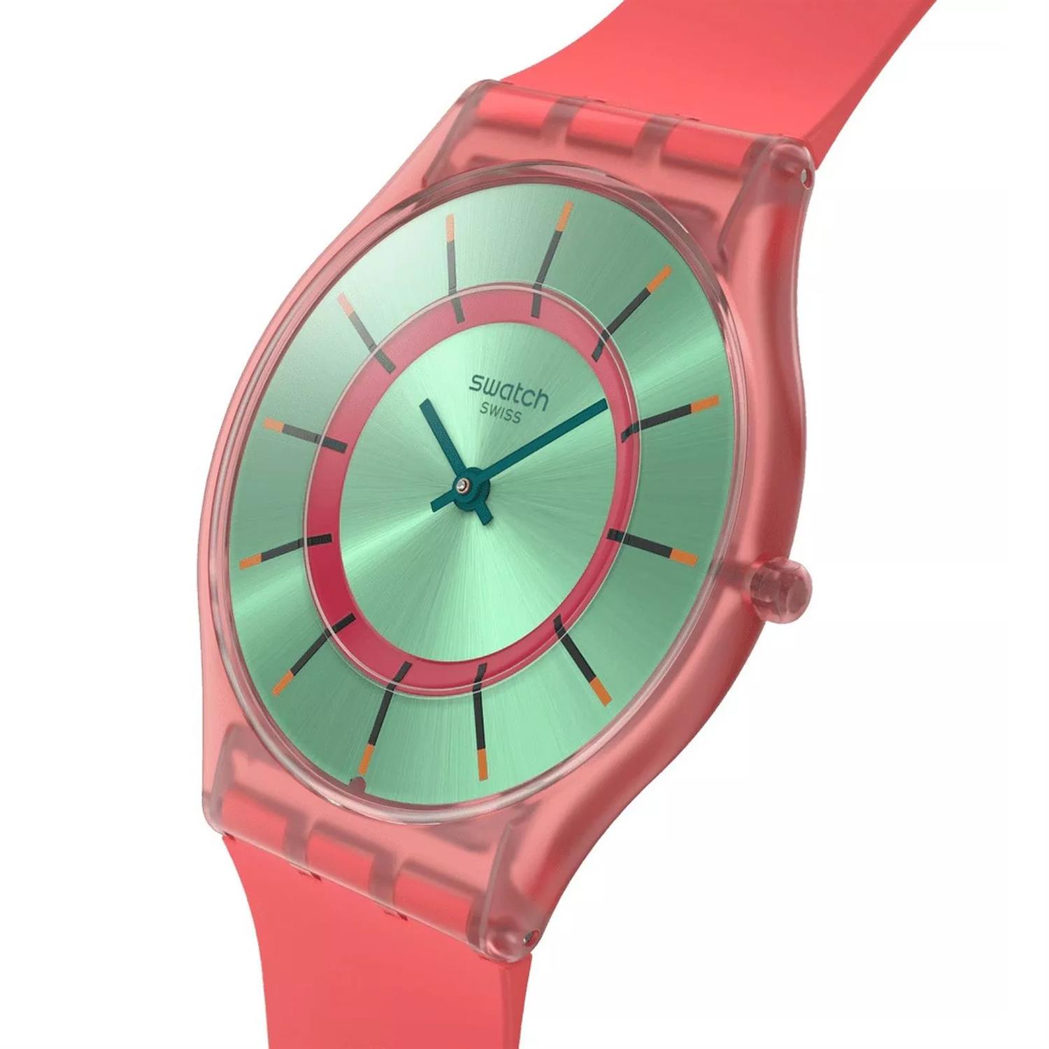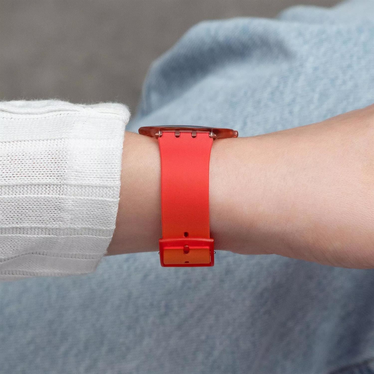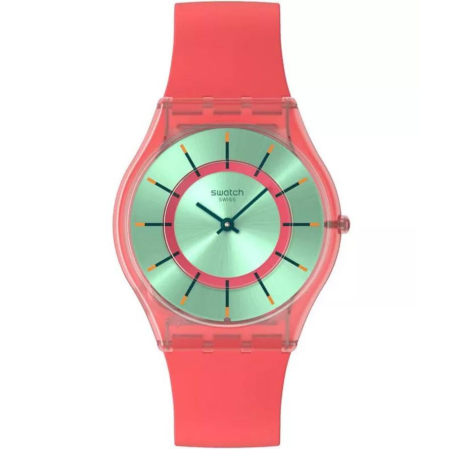 ساعت مچی زنانه سواچ swatch با طراحی روزانه بند سیلیکونی نارنجی و قاب گرد نازک نارنجی و صفحه گرد دو رنگ و قابلیت داشتن شب نما و موتور سوییسی با انرژی باطری و مقاوم در برابر آب تا عمق 30 متر به همراه گارانتی بین المللی