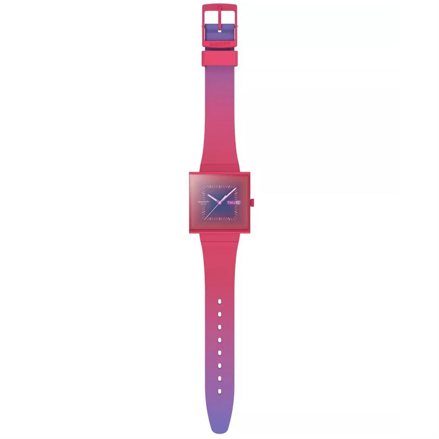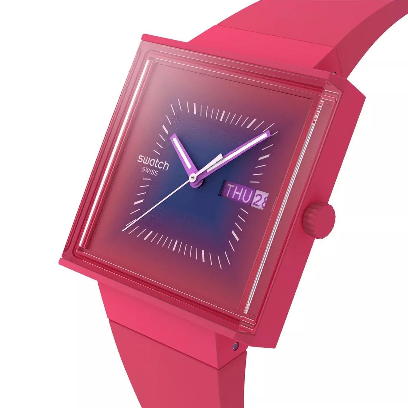 ساعت مچی زنانه سواچ SWATCH با طراحی روزانه بند سیلیکونی صورتی و قاب مربعی صورتی و صفحه مربع سرمه ای صورتی با موتور سوییسی و انرژی باتری با قابلیت داشتن تقویم / شبنما / روزهای هفته و مقاوم در برابر آب تا عمق 30 متر به همراه دو سال گارانتی بین المللی