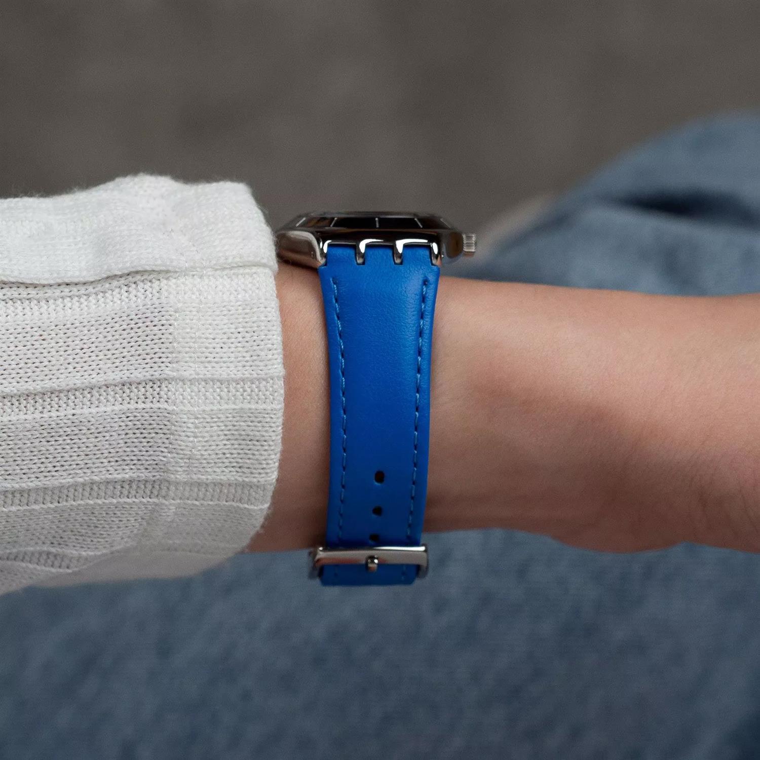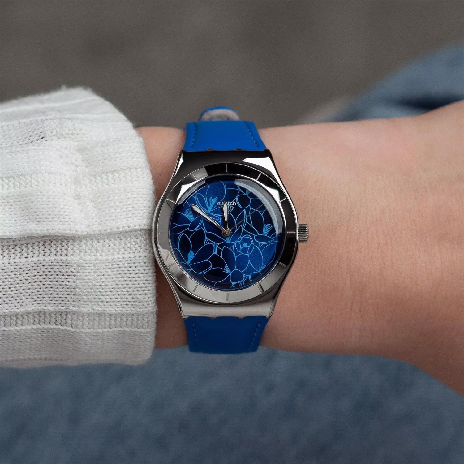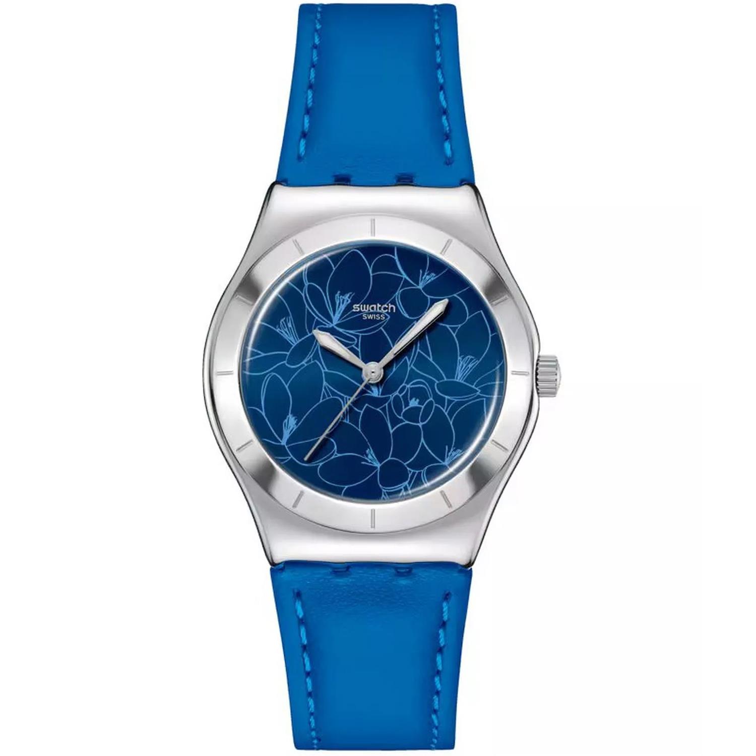 ساعت مچی زنانه سواچ swatch با طراحی روزانه بند چرمی آبی و قاب گرد استیل با صفحه گرد سرمه ای و قابلیت داشتن شب نما و موتور سوییسی با انرژی باطری و مقاوم در برابر آب تا عمق 30 متر به همراه گارانتی بین المللی