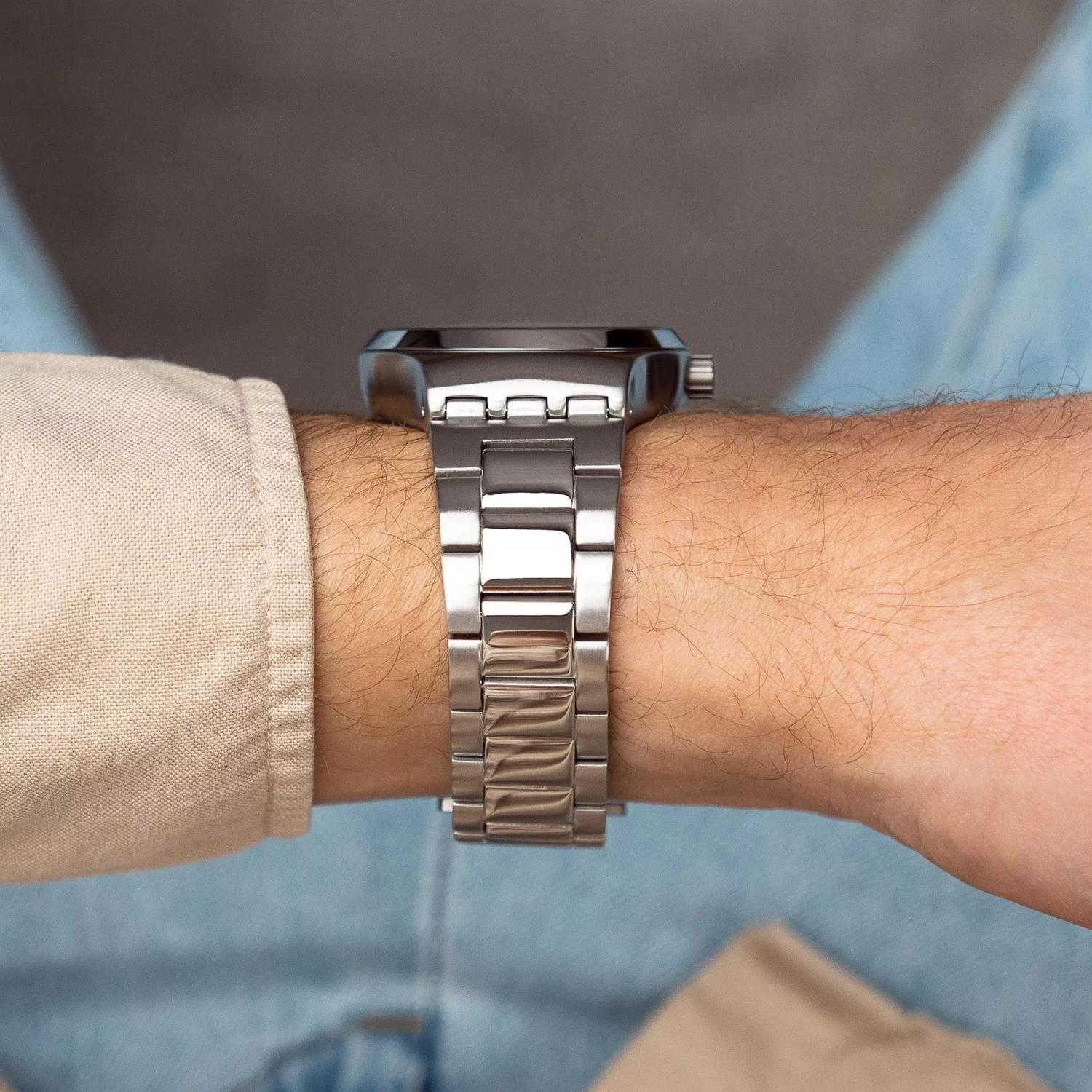 بند: فلزی (Steel bracelet) با قفل پروانهای (Butterfly / Deployment clasp)