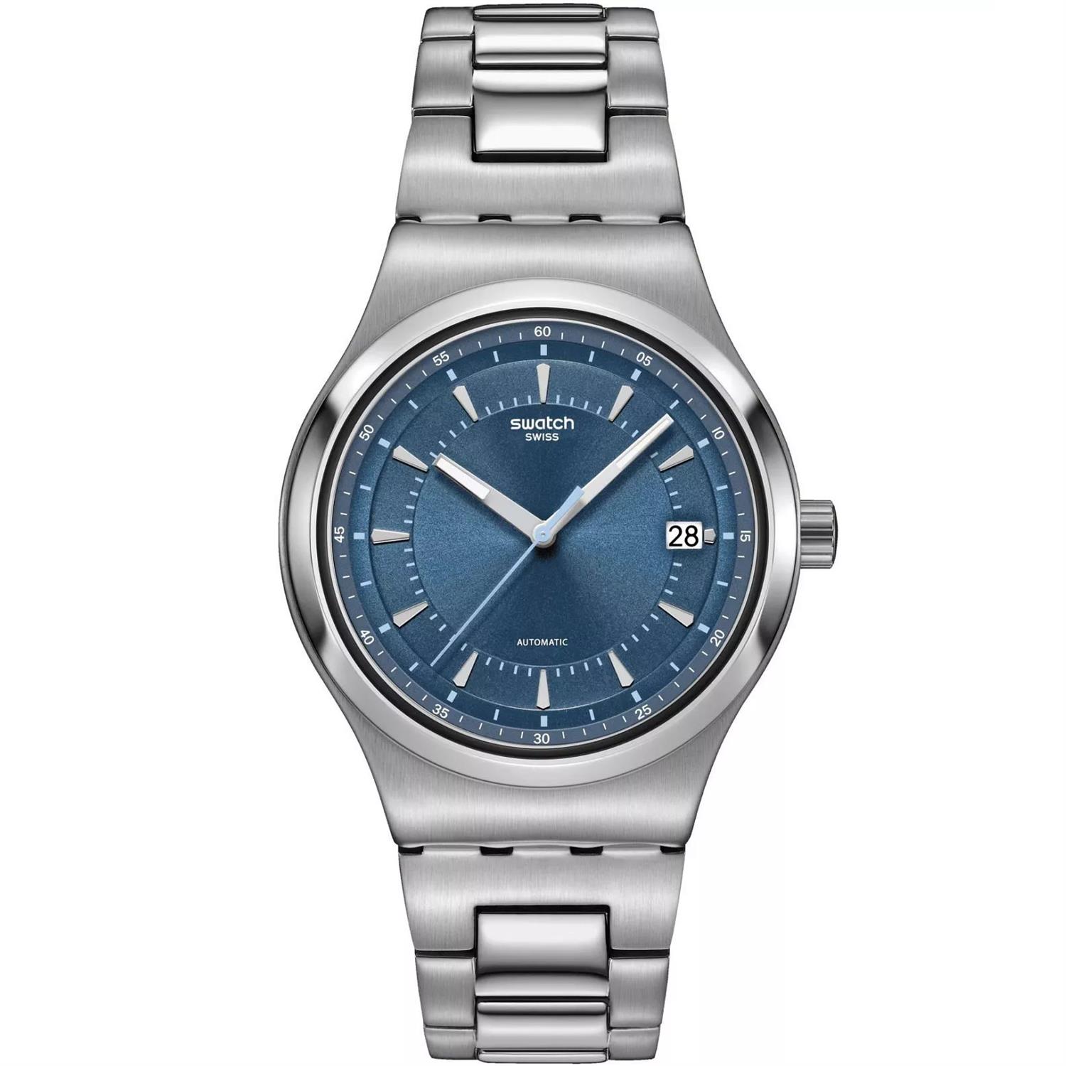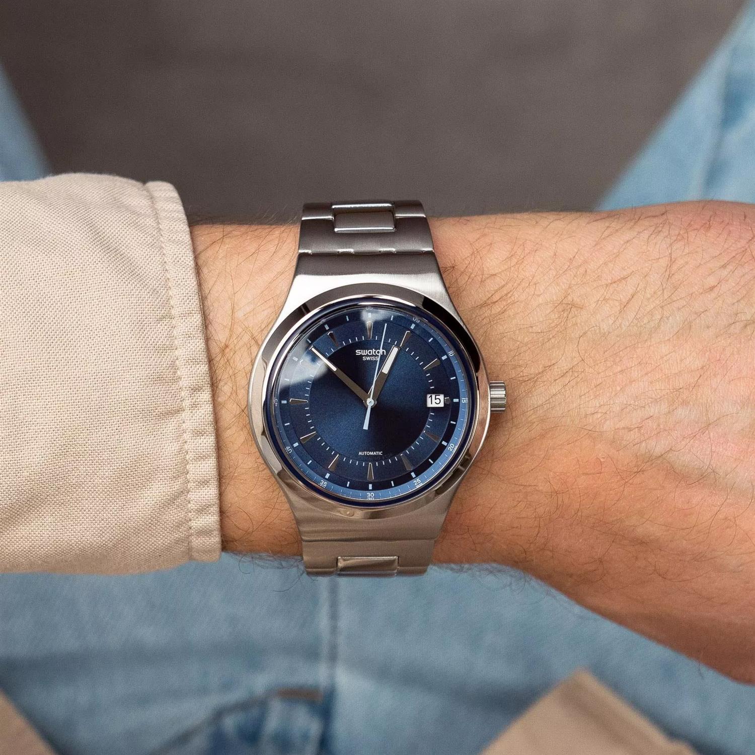 Swatch YIS435G که با نام «Shimmer At Dusk» شناخته میشود، ساعتی مردانه و خودکار از سری «Sistem 51 Irony» است. طراحیاش ساده اما مدرن است — قاب و بند تمامفلزی، صفحه آبی با عقربههای نقرهای و ثانیهشمار آبیرنگ، و نگاه شکیل و بروز. این مدل ترکیبی است از روح کلاسیک و حس امروزی، مناسب برای استفاده روزمره، محل کار یا استایلهای رسمی/نیمهرسمی.
