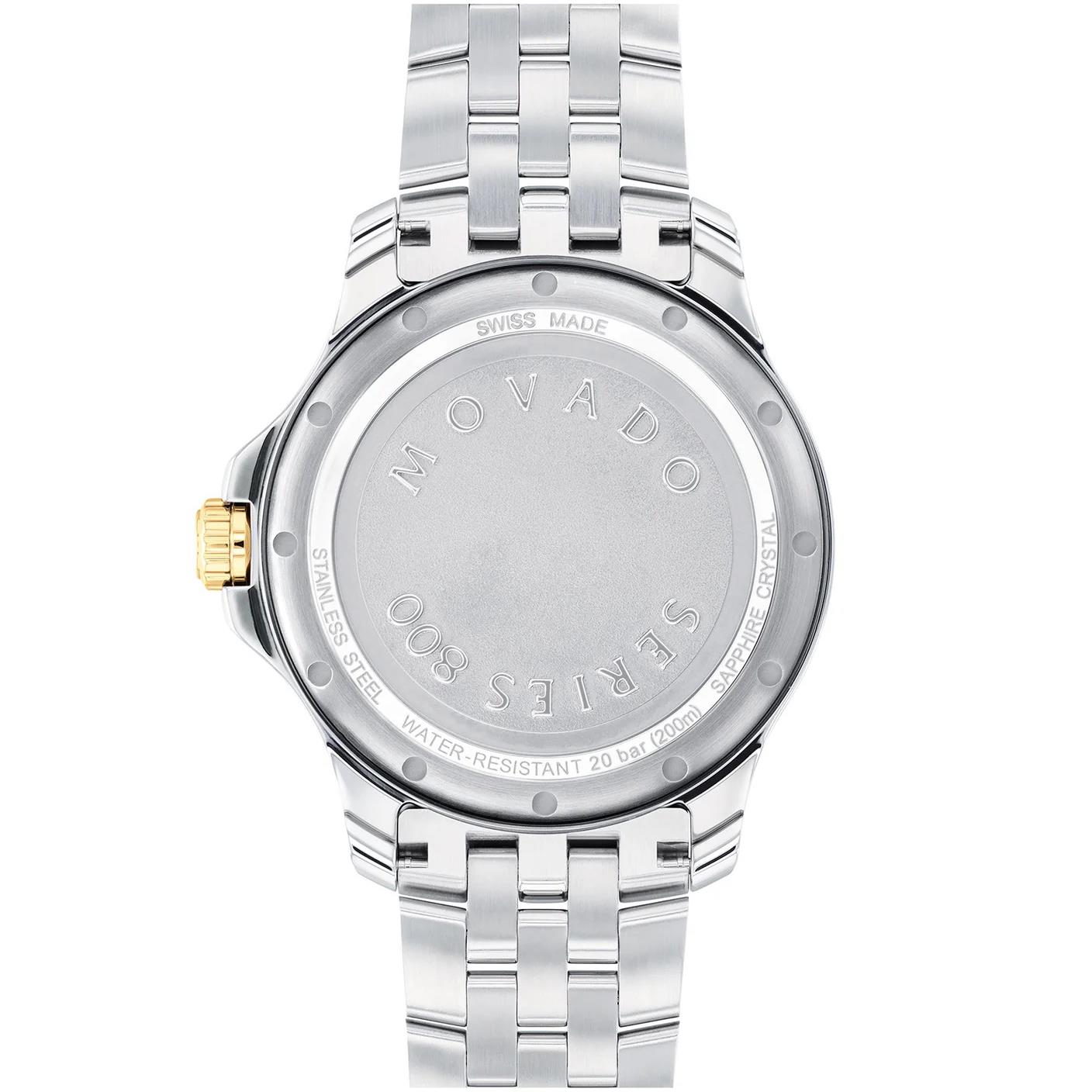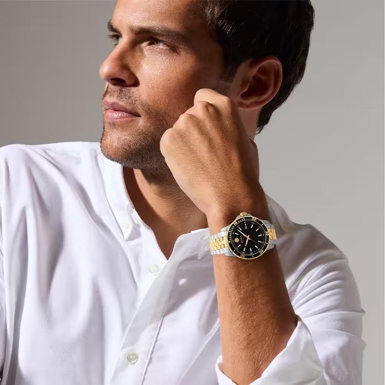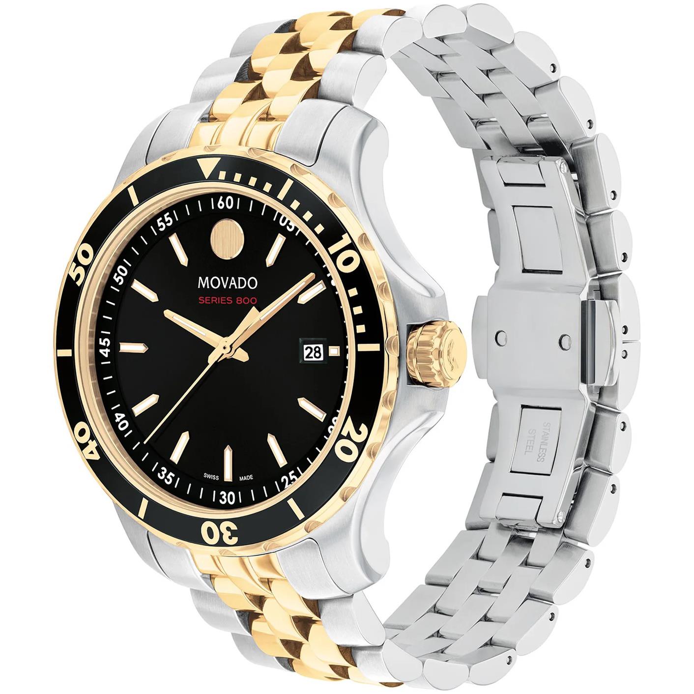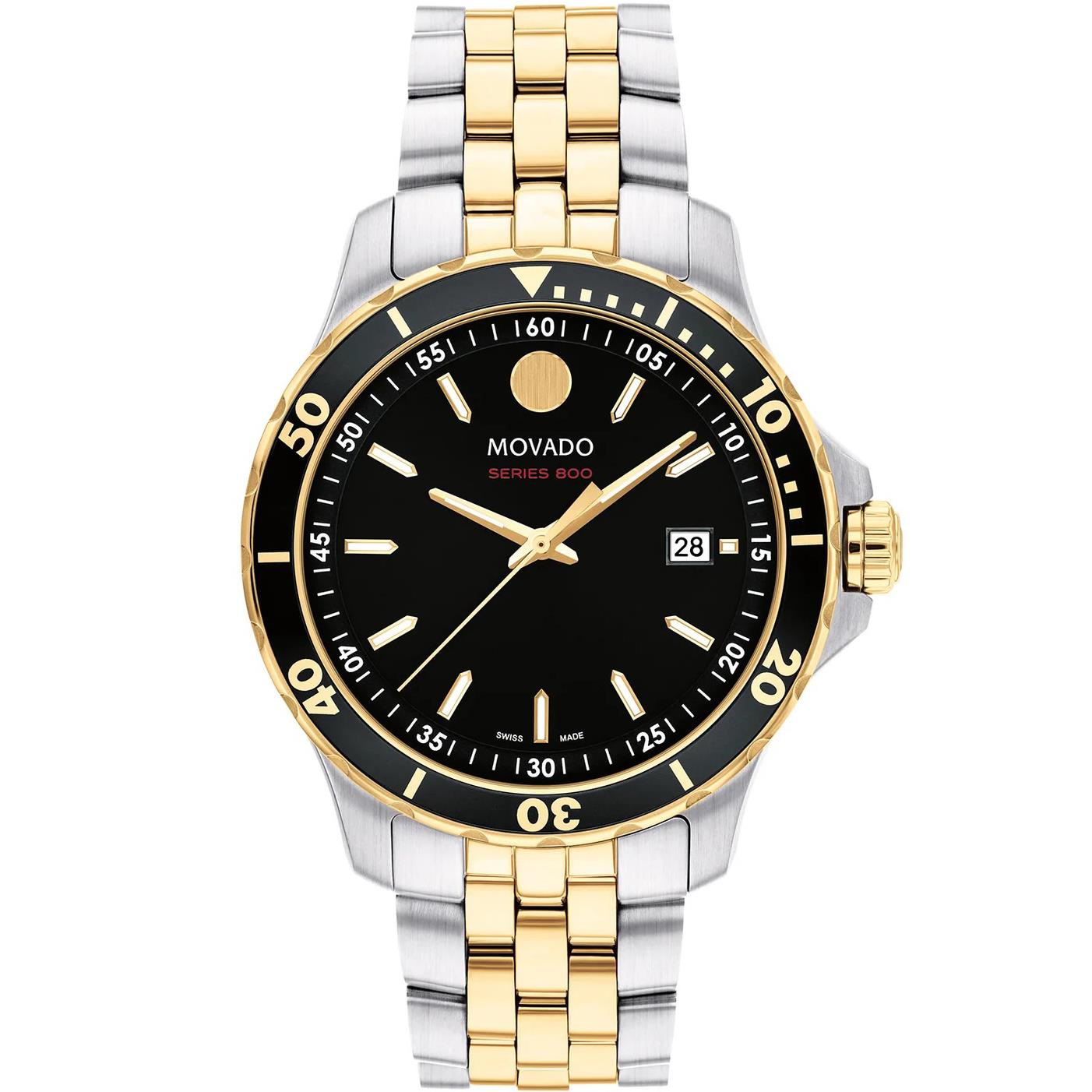 ساعت مچی مردانه موادو MOVADO با طراحی روزانه بند استیل طلایی و قاب طلایی استیل مشکی و صفحه گرد مشکی با شیشه ضد خراش و قابلیت داشتن تقویم /شب نما / زه چرخان و موتور سوییسی با انرژی باتری و مقاوم در برابر آب تا عمق 200 متر به همراه دو سال گارانتی بین المللی