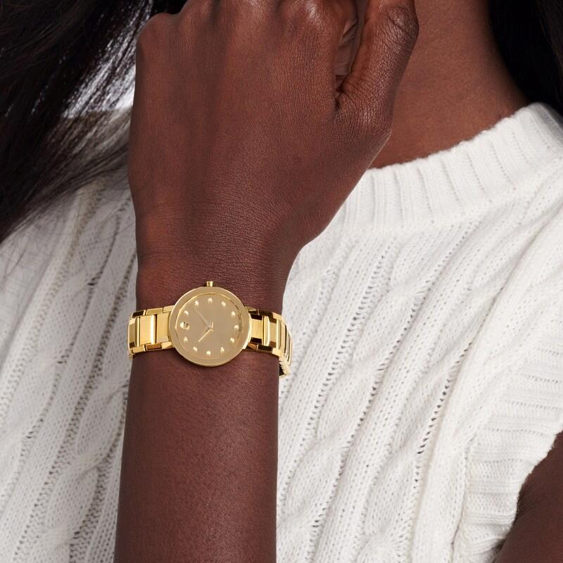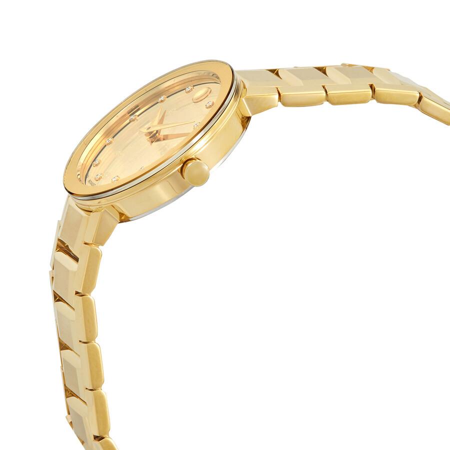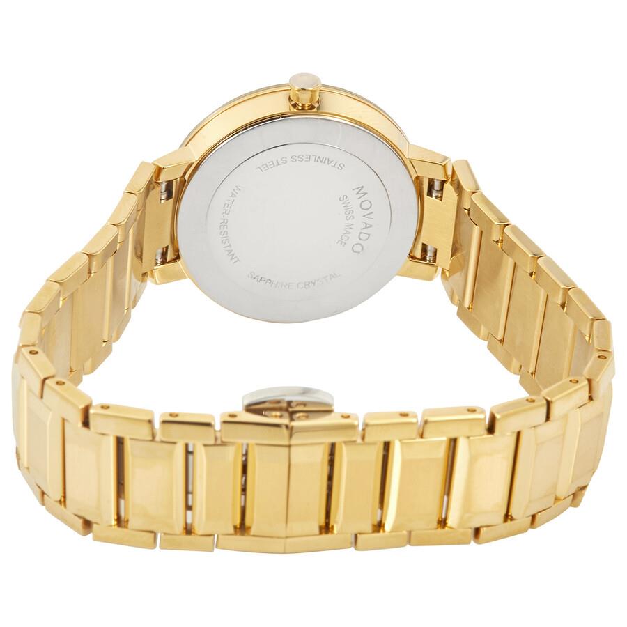 ساعت مچی زنانه movado با طراحی کلاسیک بند فلزی طلایی و قاب گرد طلایی و صفحه نگین دار طلایی با شیشه ضد خراش و موتورسوئیسی با انرژی باتری و مقاومت در برابر آب تا عمق 30 متر به همراه دو سال گارانتی بین المللی