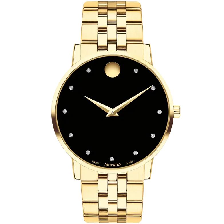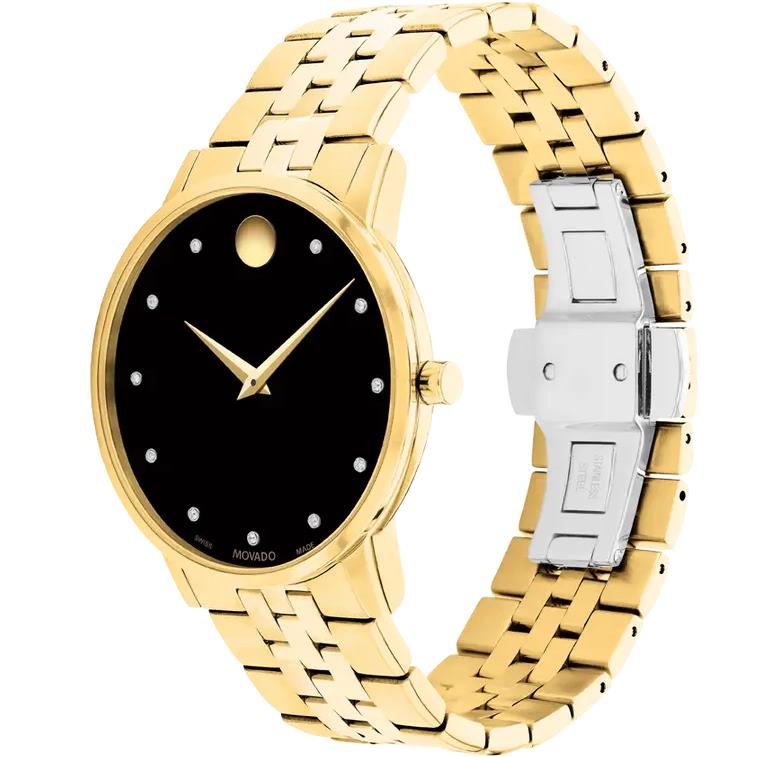 ساعت مچی مردانه موادو MOVADO با طراحی روزانه بند فلزی طلایی و قاب گرد طلایی و صفحه نگین دار مشکی با شیشه ضد خراش و موتور سوییسی با انرژی باتری و مقاوم در برابر آب تا عمق 30 متر به همراه دو سال گارانتی بین المللی