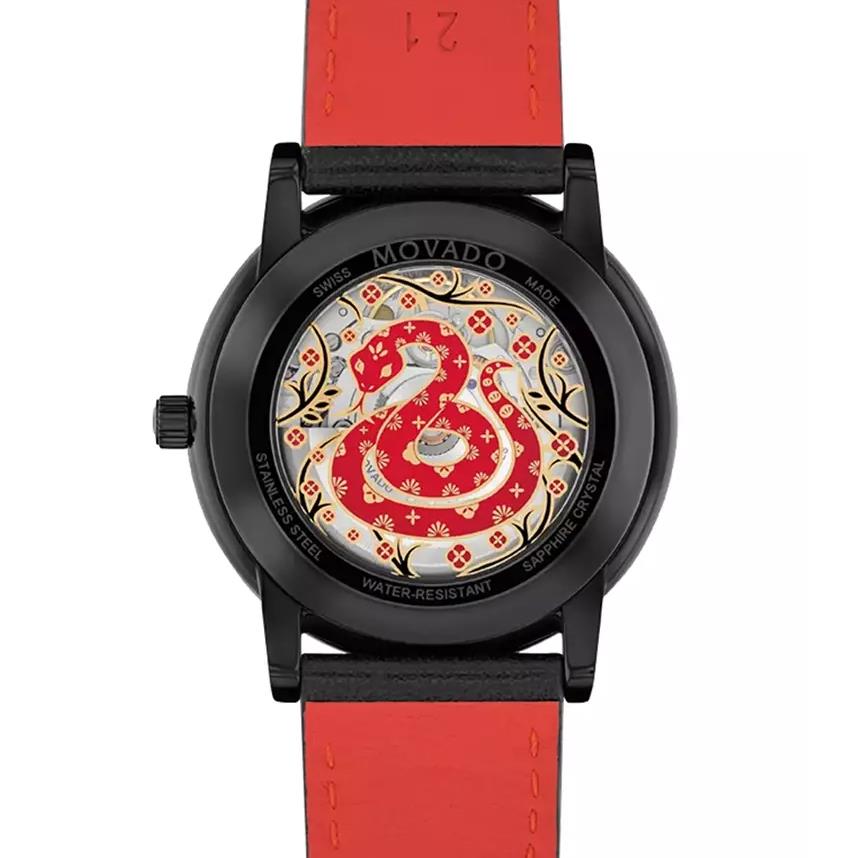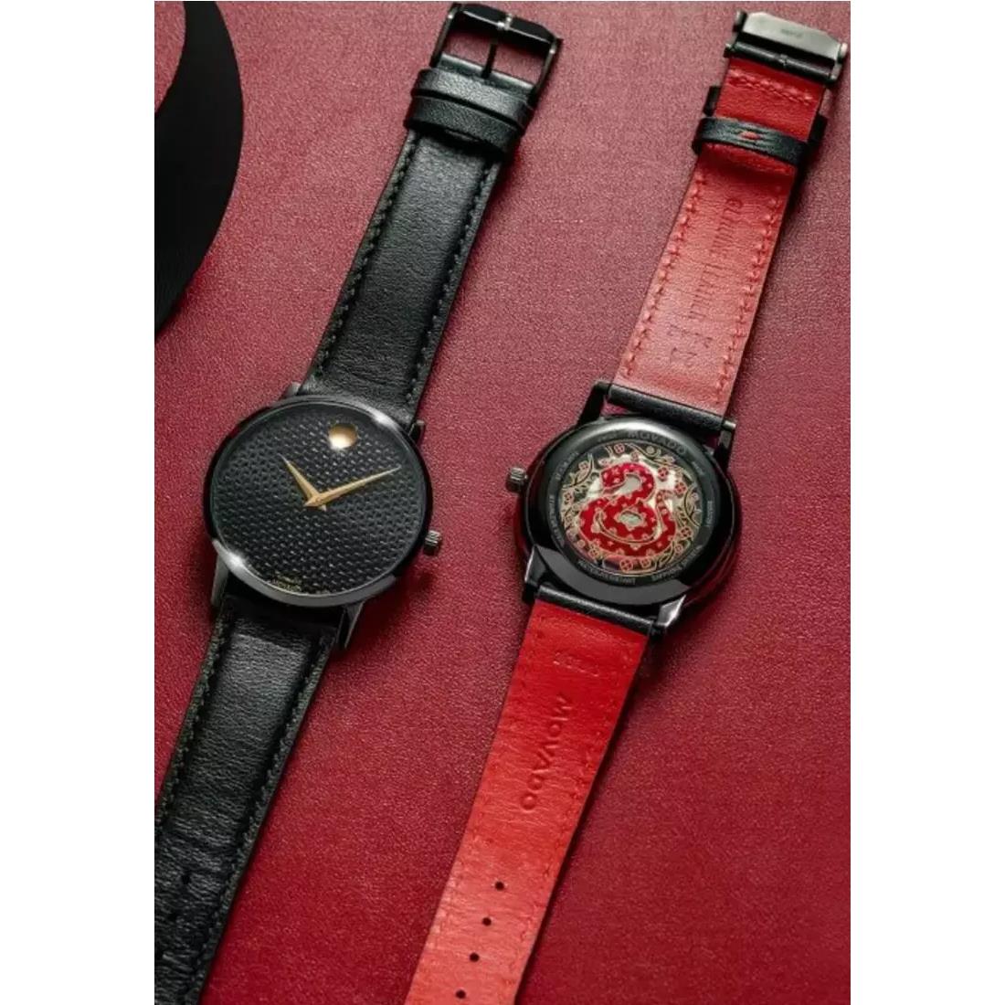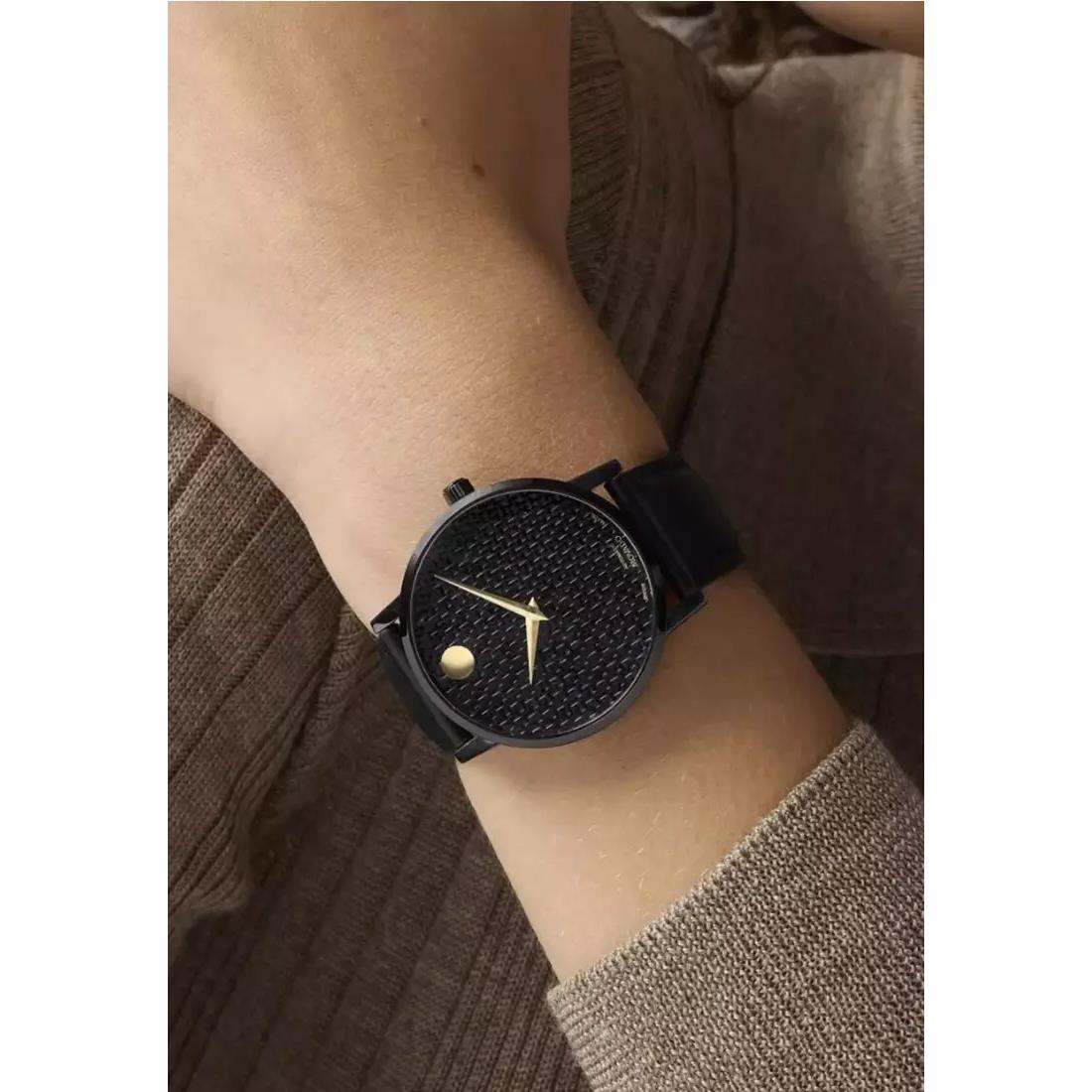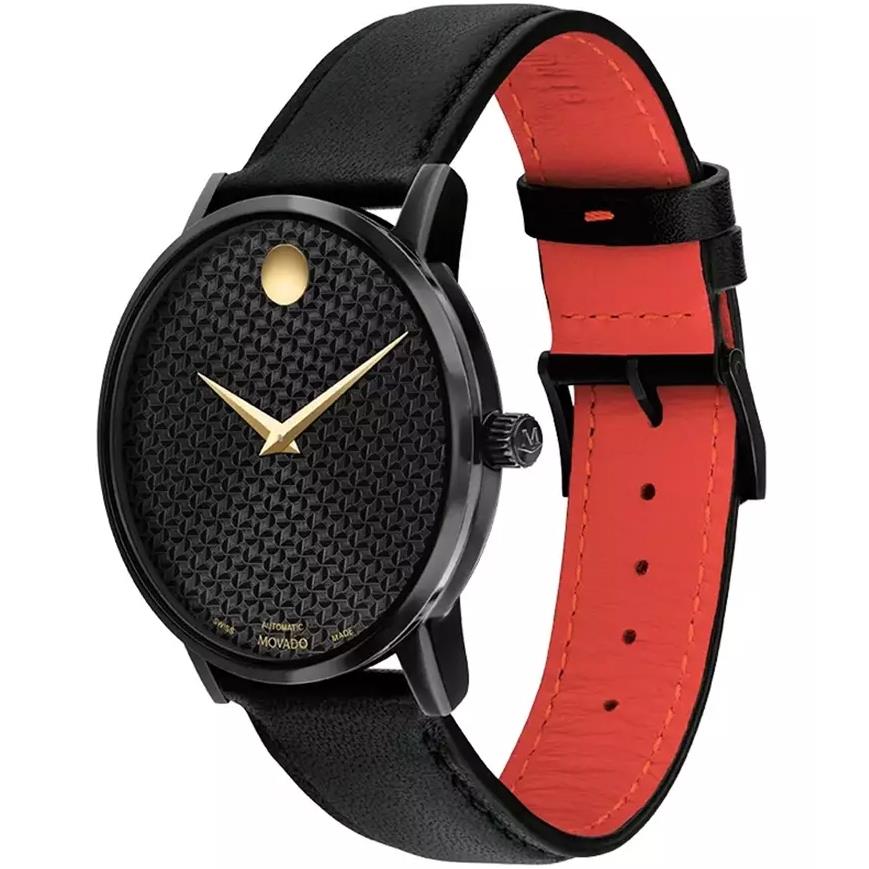 ساعت مچی مردانه موادو MOVADO با طراحی روزانه بند چرمی مشکی و قاب فلزی مشکی و صفحه گرد مشکی و موتور اتوماتیک سوییسی با انرژی مکانیکی و مقاوم در برابر آب تا عمق 30 متر به همراه دو سال گارانتی بین المللی