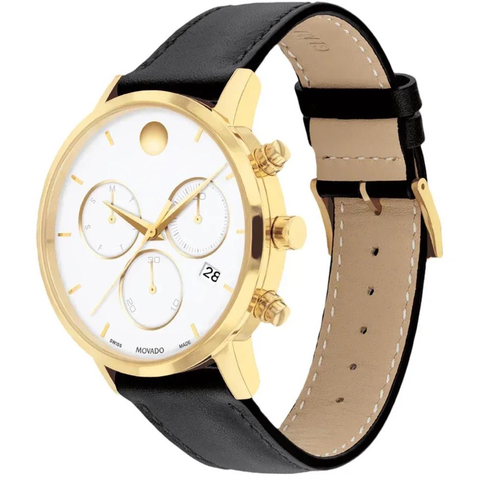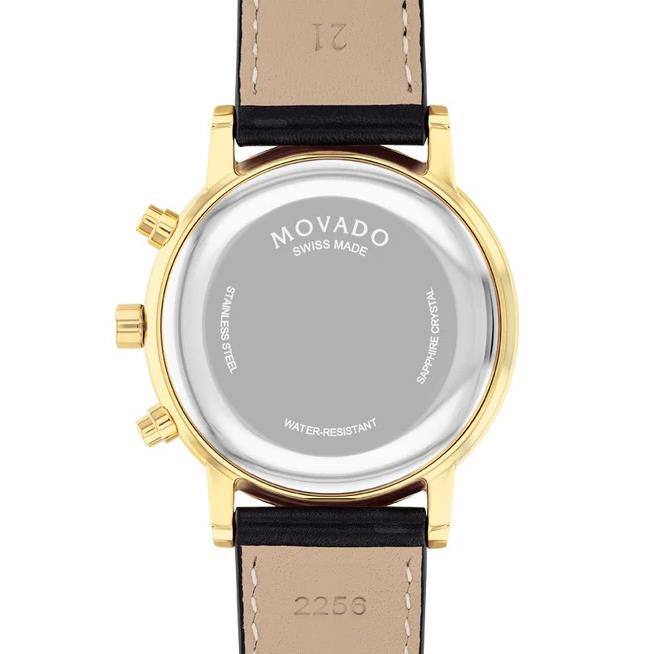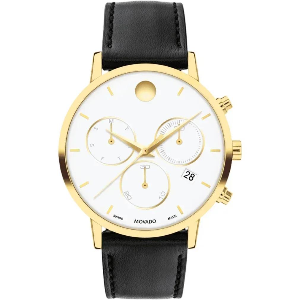 ساعت مچی مردانه موادو MOVADO با طراحی روزانه بند چرمی مشکی و قاب فلزی طلایی و صفحه گرد سفید با شیشه ضد خراش و قابلیت داشتن کرنوگراف / تقویم /روزهای هفته و موتور سوییسی با انرژی باتری و مقاوم در برابر آب تا عمق 30 متر به همراه دو سال گارانتی بین المللی