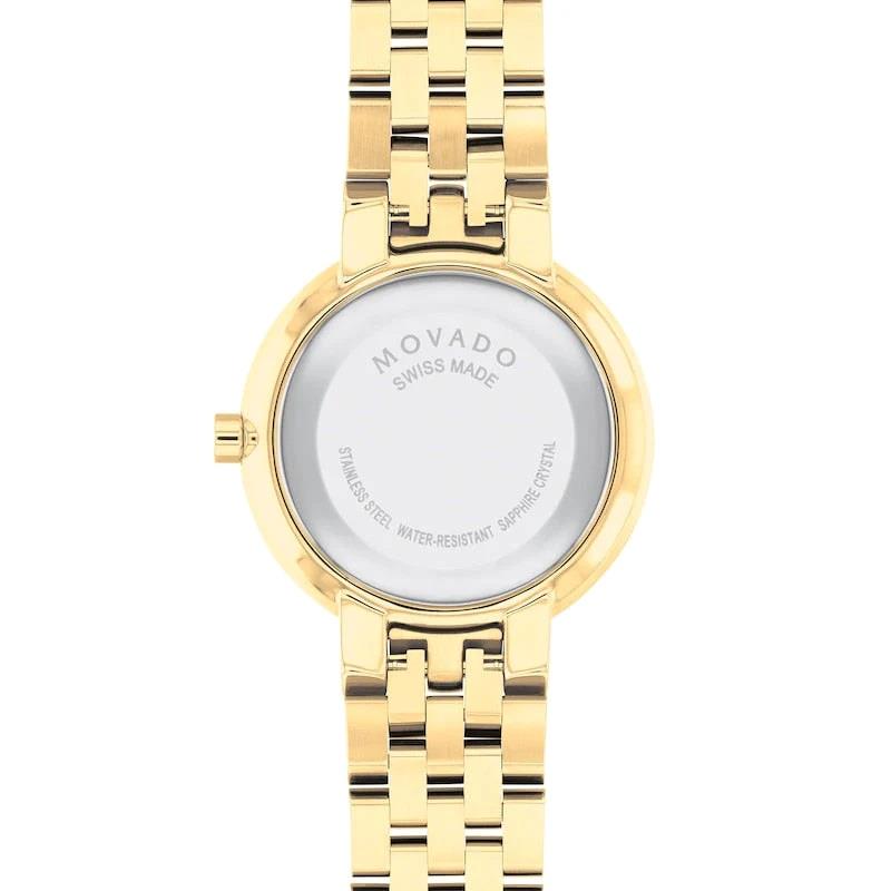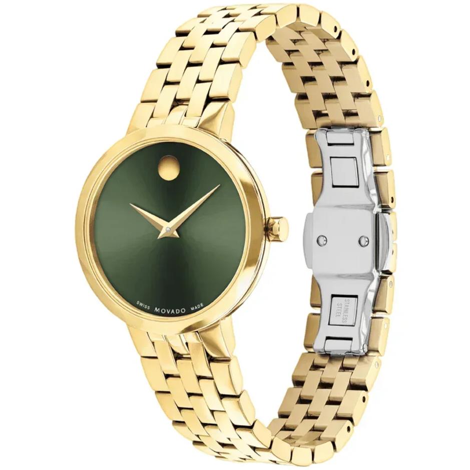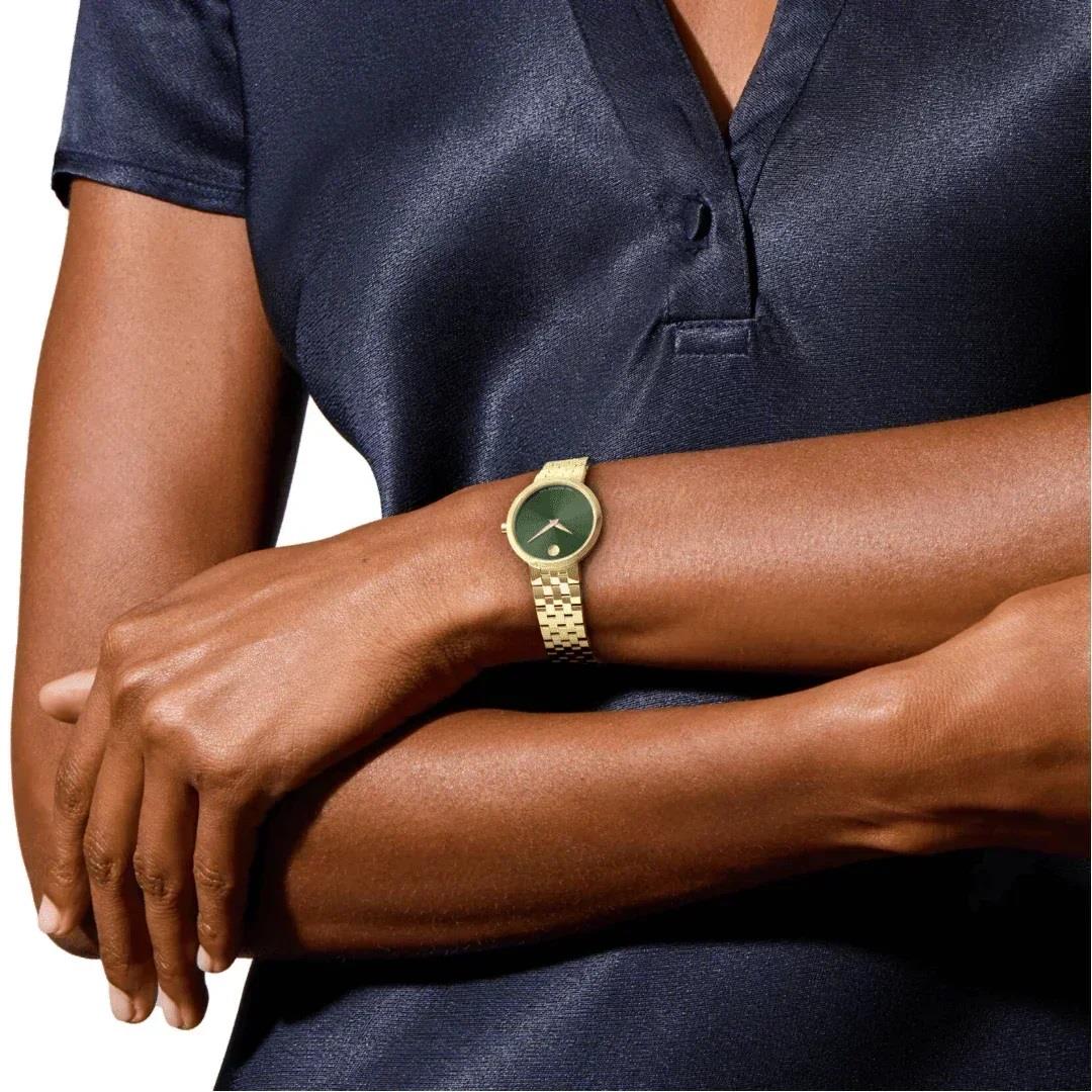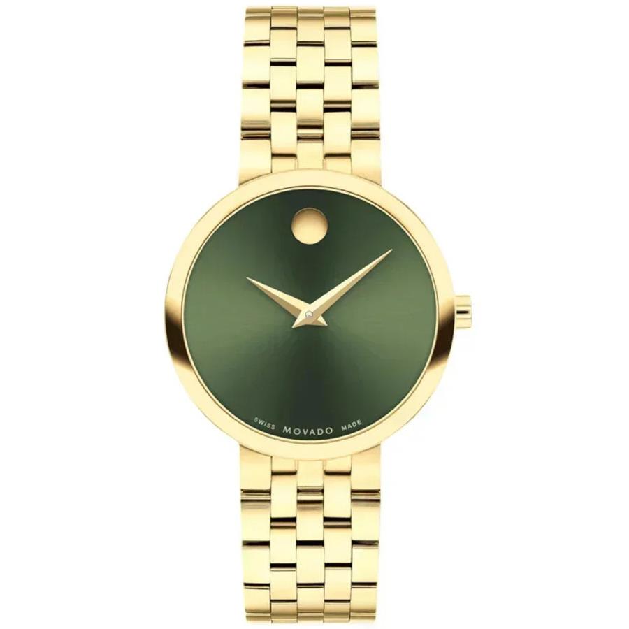 ساعت مچی زنانه movado با طراحی کلاسیک بند فلزی طلایی و قاب گرد طلایی و صفحه گرد سبز با شیشه ضد خراش و موتور سوئیسی با انرژی باتری و مقاومت در برابر آب تا عمق 30 متر به همراه دو سال گارانتی بین المللی