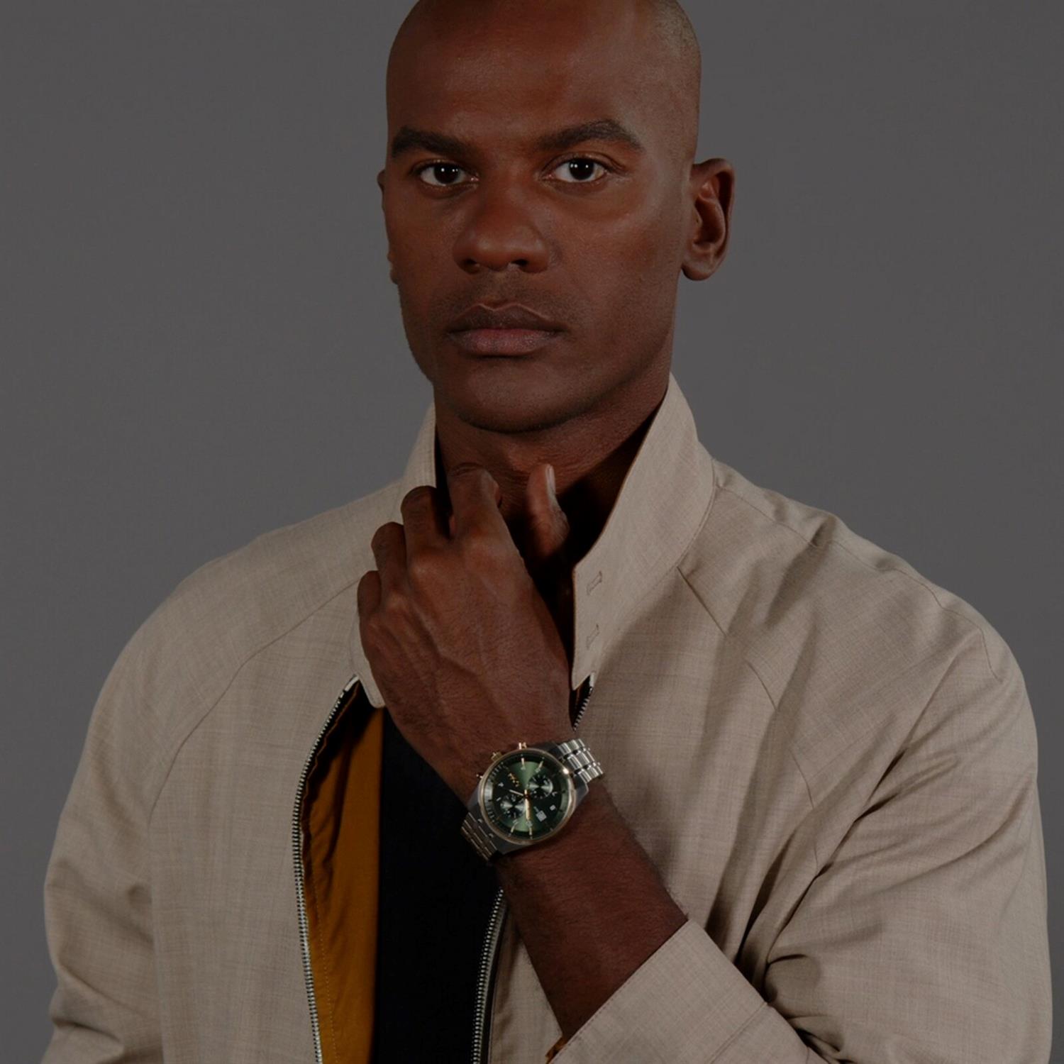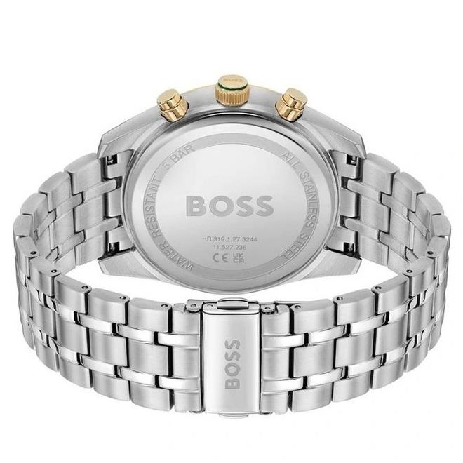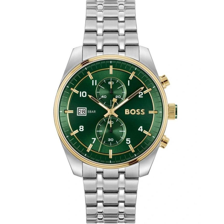 ساعت مچی مردانه هوگوباس Hugo Boss با طراحی روزانه بند استیل با قاب گرد طلایی استیل و صفحه سبز با قابلیت کرنوگراف تقویم و موتور ژاپنی با انرژی باتری و مقاوم در برابر آب تا عمق 50 متر به همراه گارانتی بین المللی