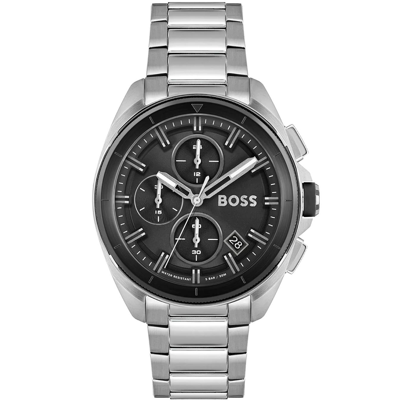 ساعت مچی مردانه هوگوباس Hugo Boss با طراحی روزانه بند استیل با قاب گرد مشکی استیل و صفحه مشکی با قابلیت کرنوگراف تقویم شب نما و موتور ژاپنی با انرژی باتری و مقاوم در برابر آب تا عمق 50 متر به همراه گارانتی بین المللی
