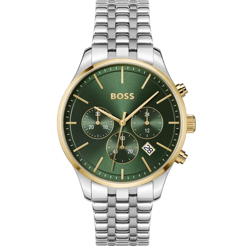 ساعت مچی مردانه هوگوباس Hugo Boss با طراحی روزانه بند استیل با قاب گرد طلایی استیل و صفحه سبز با قابلیت کرنوگراف تقویم و موتور ژاپنی با انرژی باتری و مقاوم در برابر آب تا عمق 50 متر به همراه گارانتی بین المللی