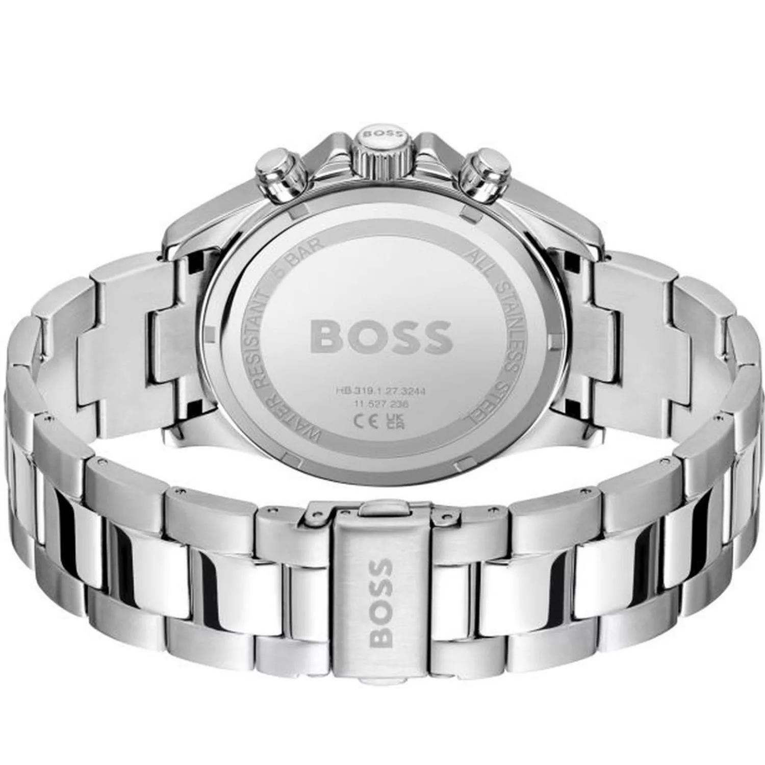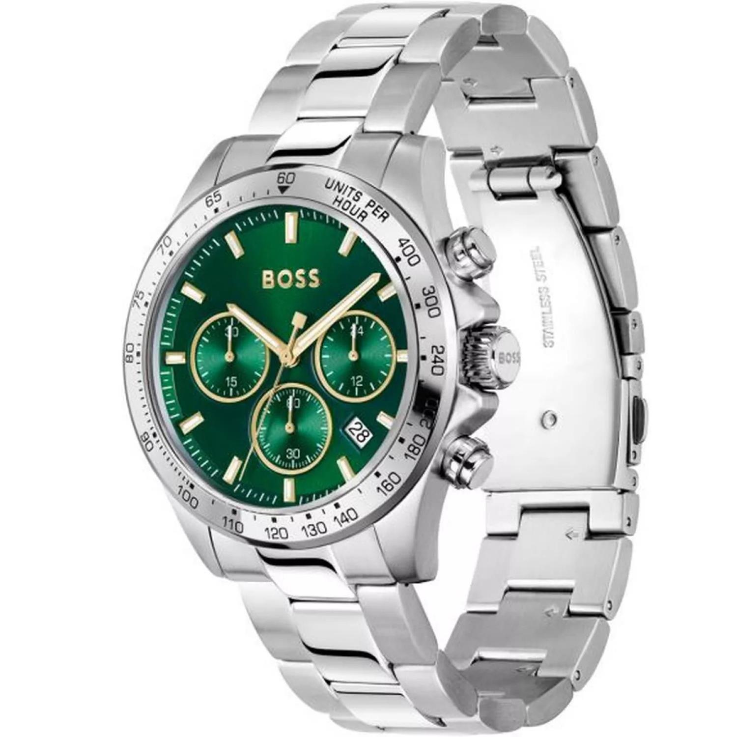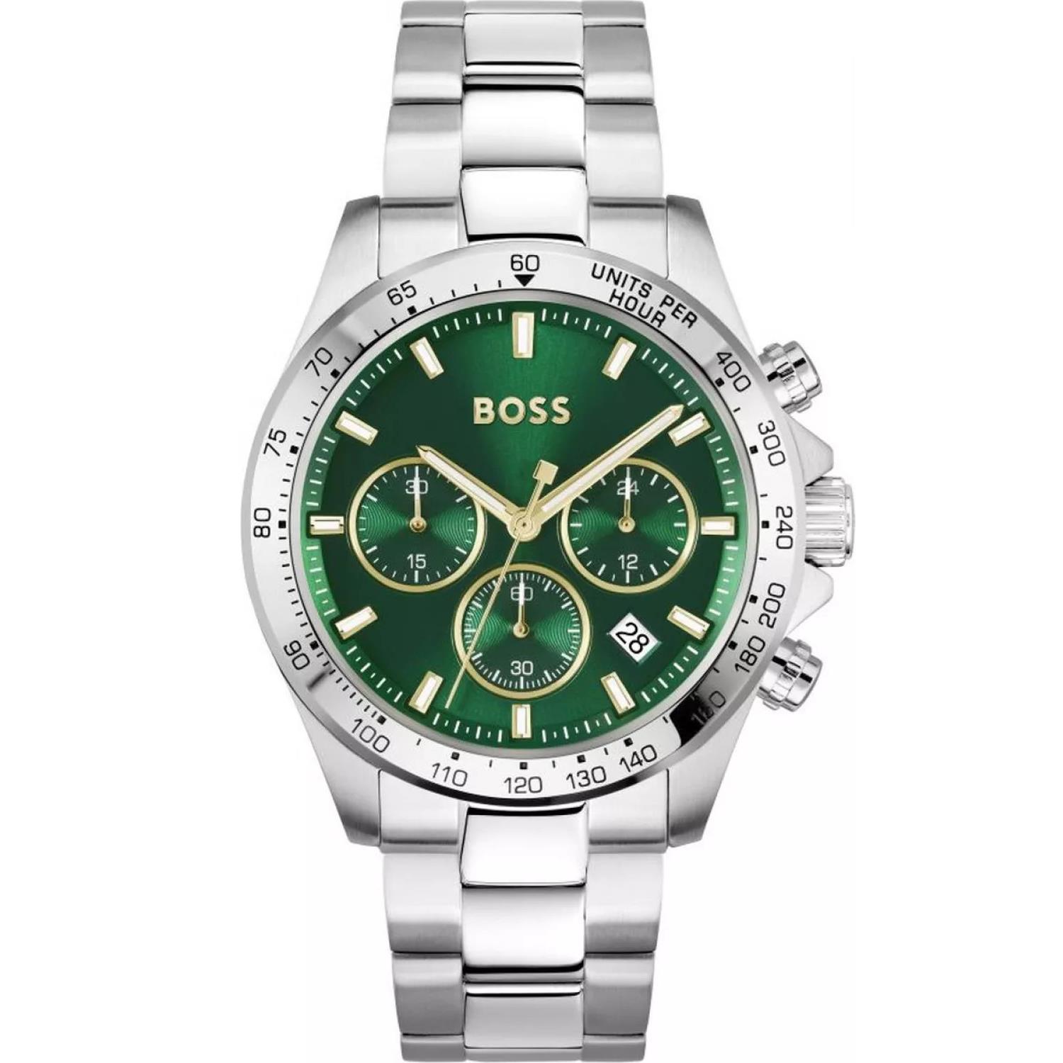 ساعت مچی مردانه هوگوباس Hugo Boss با طراحی روزانه بند استیل با قاب گرد استیل و صفحه سبز با قابلیت کرنوگراف تقویم شب نما و موتور ژاپنی با انرژی باتری و مقاوم در برابر آب تا عمق 50 متر به همراه گارانتی بین المللی
