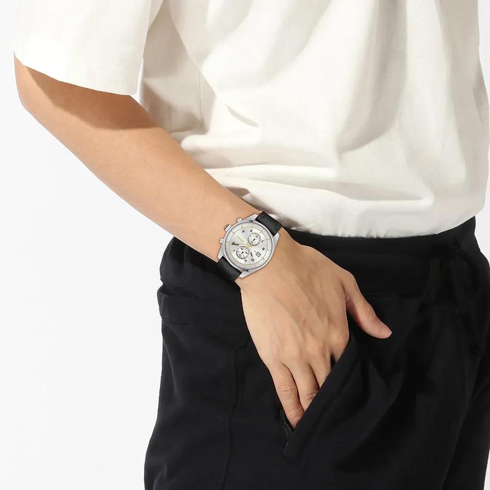 ساعت مچی مردانه هوگوباس Hugo Boss با طراحی روزانه بند چرمی با قاب گرد استیل و صفحه نقره ای با شیشه ضد خراش و قابلیت کرنوگراف تقویم شب نما و موتور ژاپنی با انرژی باتری و مقاوم در برابر آب تا عمق 50 متر به همراه گارانتی بین المللی