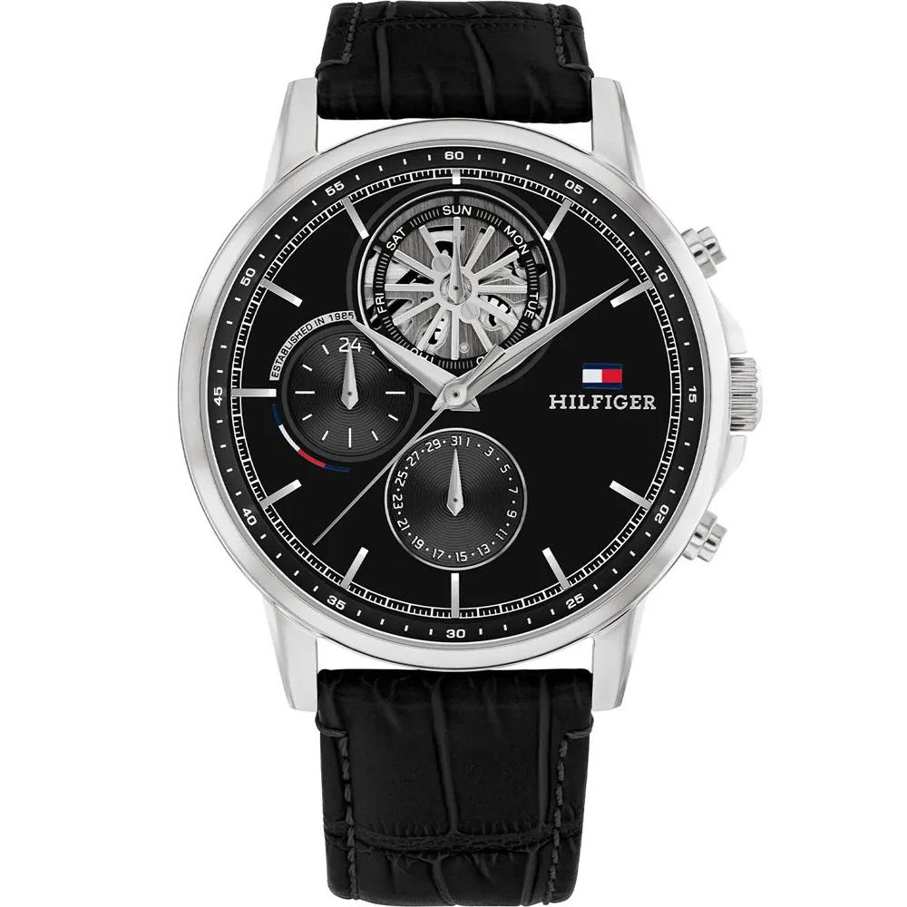ساعت مچی مردانه تامی هیلفیگر Tommy Hilfiger با طراحی روزانه بند چرمی و قاب گرد استیل و صفحه قلب باز مشکی با قابلیت داشتن تقویم / روزهای هفته / روز و شب و موتور ژاپنی با انرژی باتری و مقاوم در برابر آب تا عمق 50 متر به همراه گارانتی بین المللی