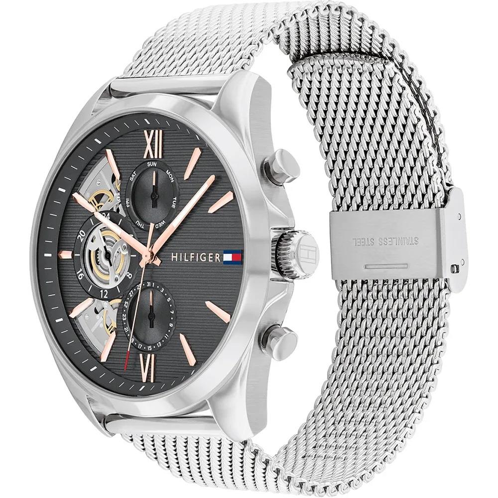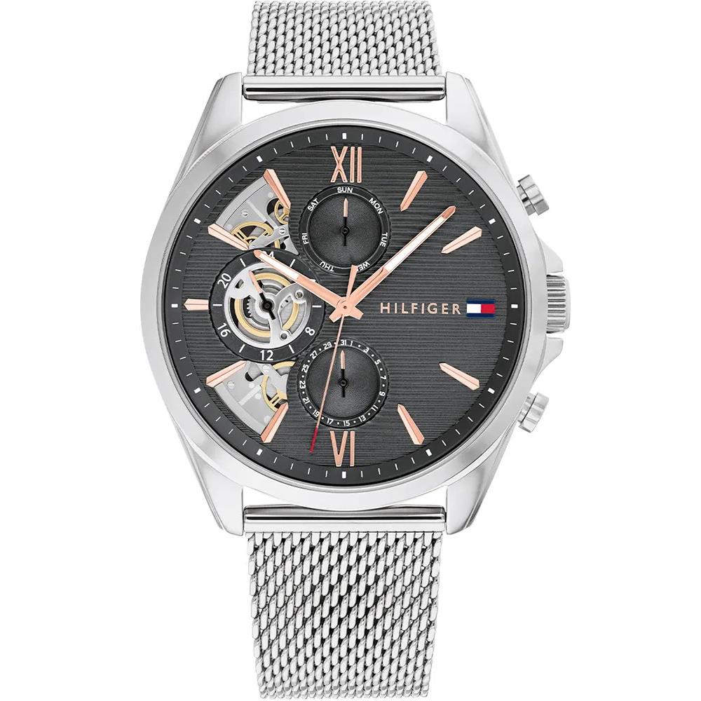 ساعت مچی مردانه تامی هیلفیگر Tommy Hilfiger با طراحی روزانه بند حصیربافت استیل و قاب گرد استیل و صفحه قلب باز طوسی با قابلیت داشتن تقویم / روزهای هفته / روزوشب / شب نما  و موتور ژاپنی با انرژی باتری و مقاوم در برابر آب تا عمق 50 متر به همراه گارانتی بین المللی