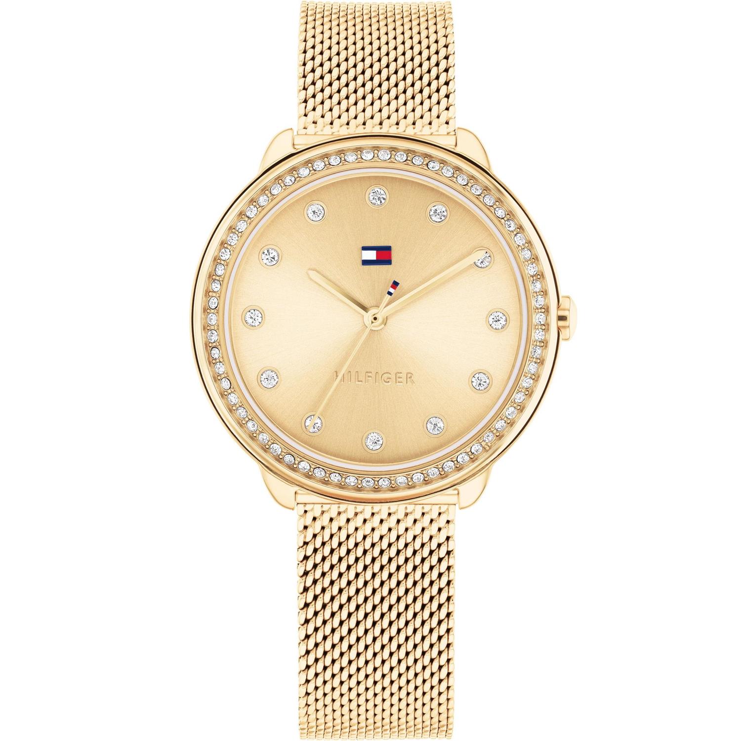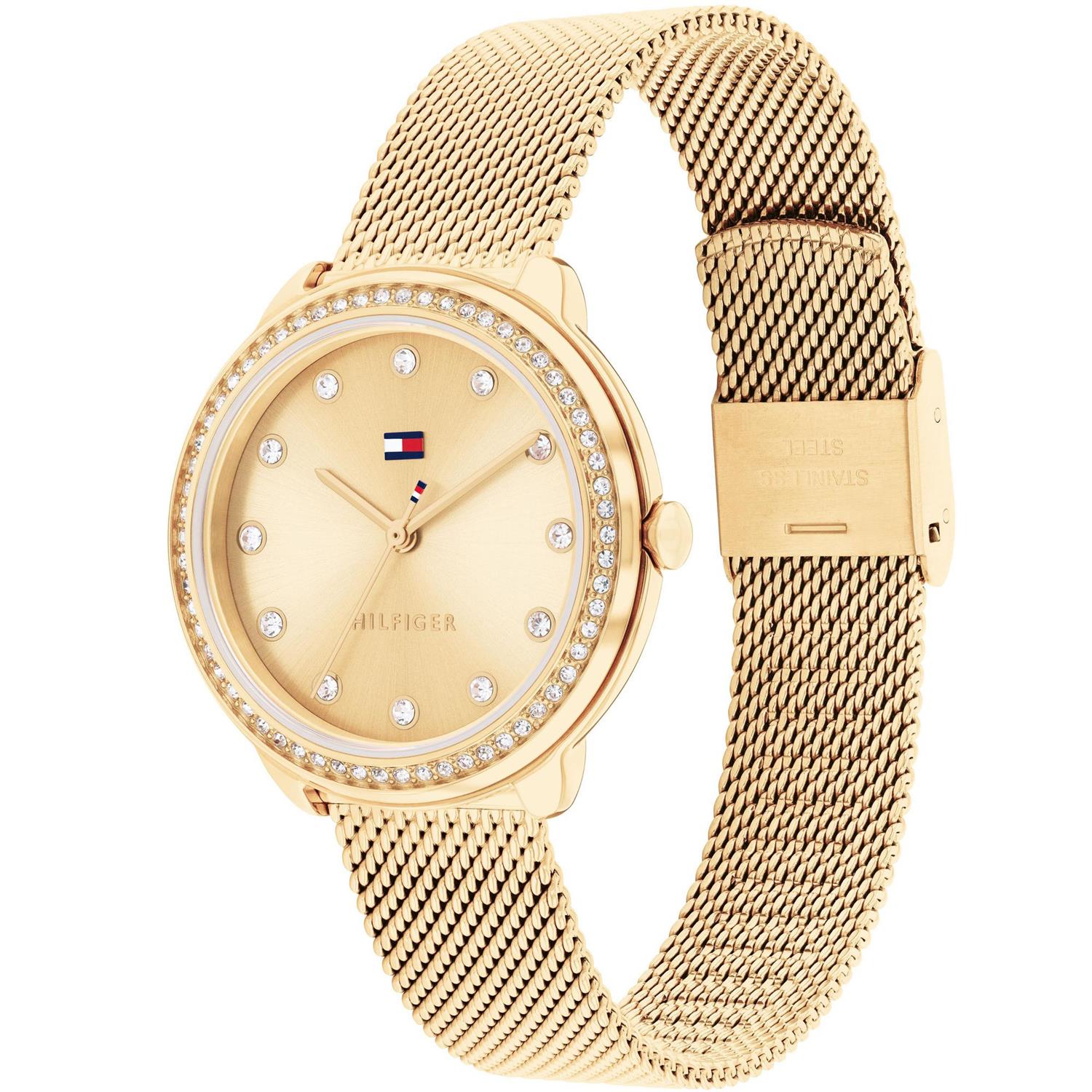 ساعت مچی زنانه تامی هیلفیگر Tommy Hilfiger بار طراحی روزانه بند حصیر بافت طلایی و قاب گرد طلایی با صفحه نگین دار طلایی با موتور ژاپنی و انرژی باتری و مقاوم در برابر آب تا عمق 30 متربه همراه گارانتی بین المللی