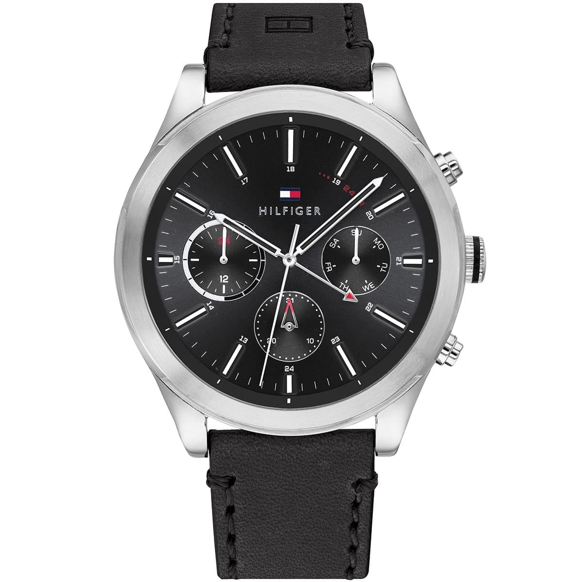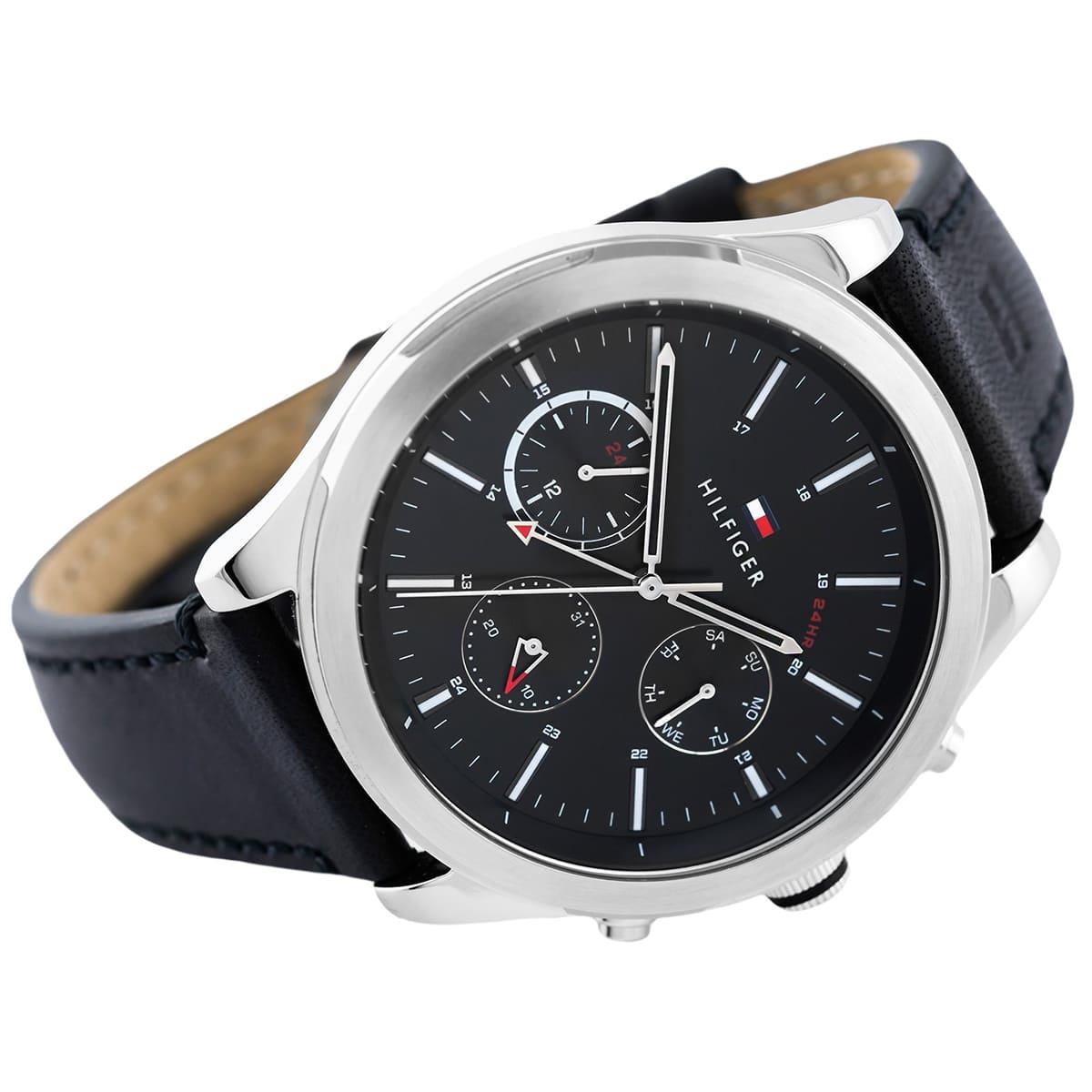 ساعت مچی مردانه تامی هیلفیگر Tommy Hilfiger با طراحی روزانه بند چرمی و قاب گرد استیل و صفحه مشکی با قابلیت داشتن تقویم / روزهای هفته / روزوشب /دو زمانه و موتور ژاپنی با انرژی باتری و مقاوم در برابر آب تا عمق 50 متر به همراه گارانتی بین المللی