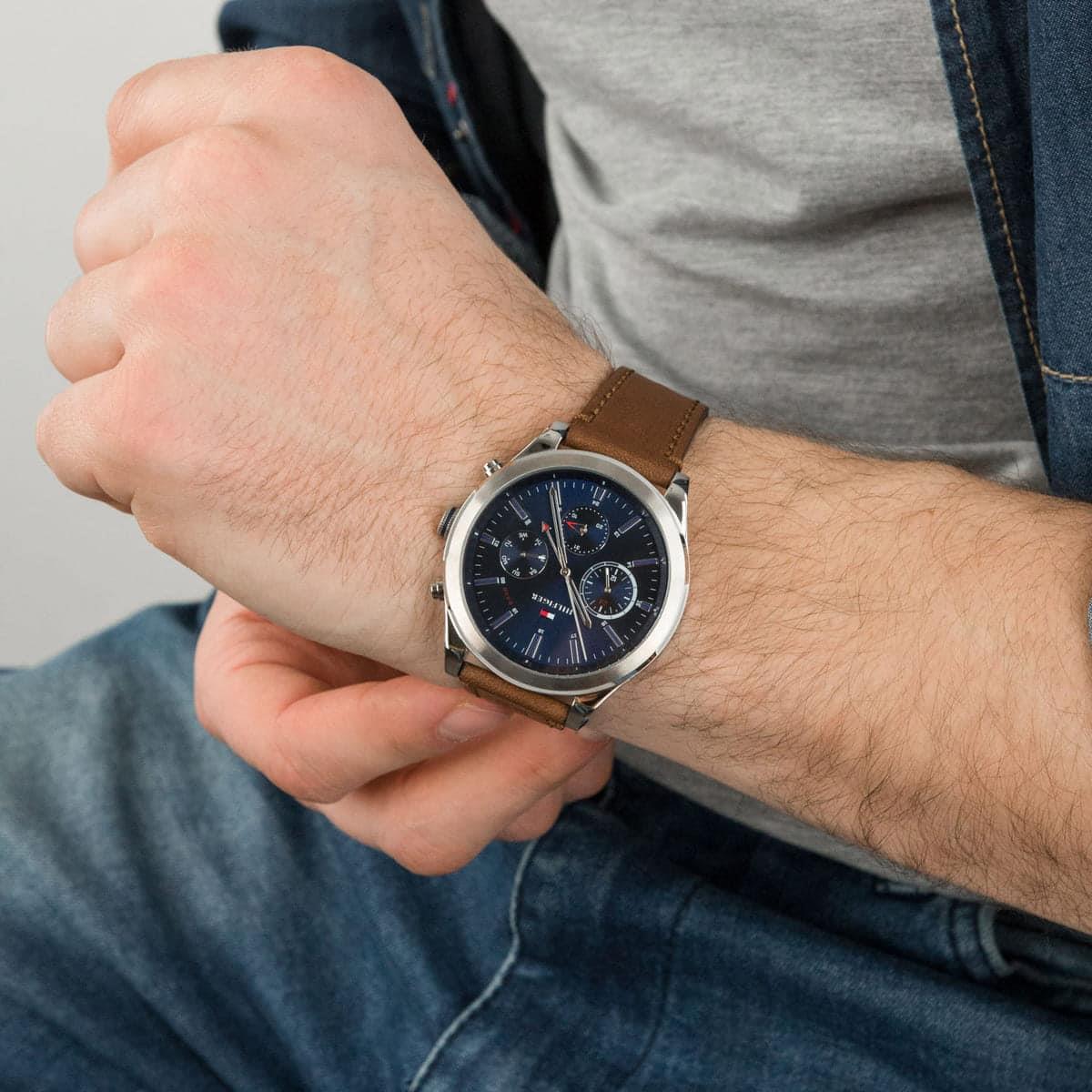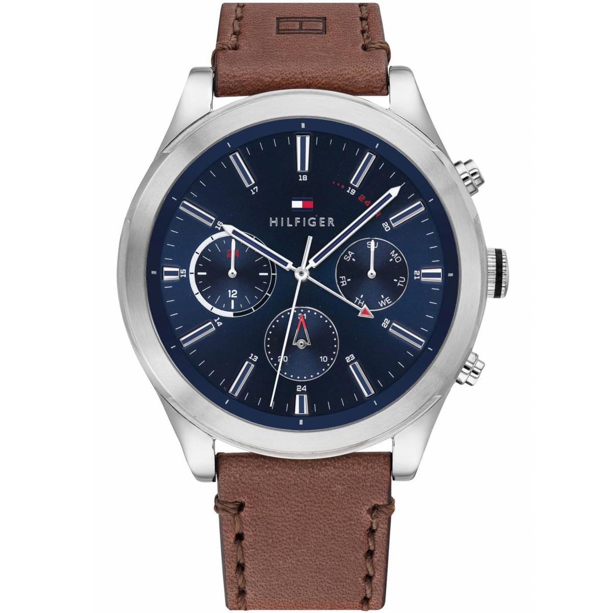 ساعت مچی مردانه تامی هیلفیگر Tommy Hilfiger با طراحی روزانه بند چرمی قهوه ای و قاب گرد استیل و صفحه سرمه ای با قابلیت داشتن تقویم / روزهای هفته / روزوشب/دو زمانه و موتور ژاپنی با انرژی باتری و مقاوم در برابر آب تا عمق 50 متر به همراه گارانتی بین المللی
