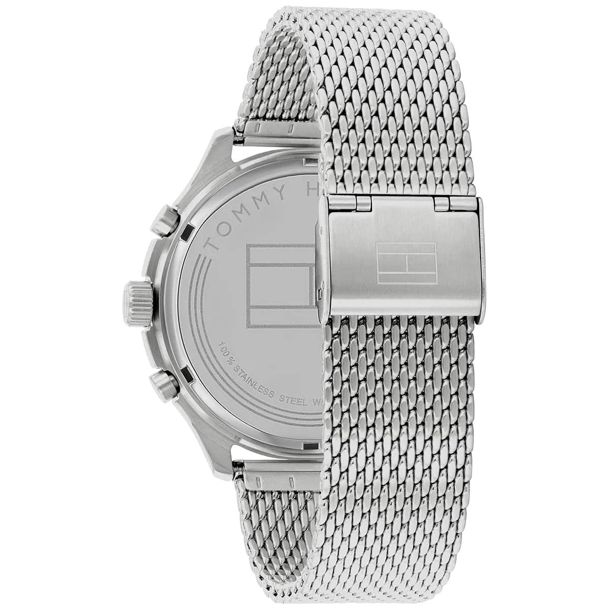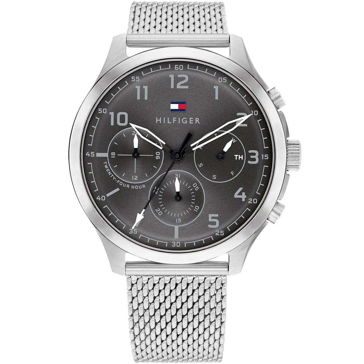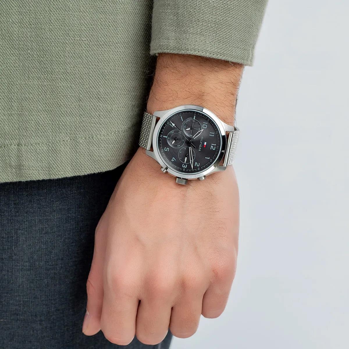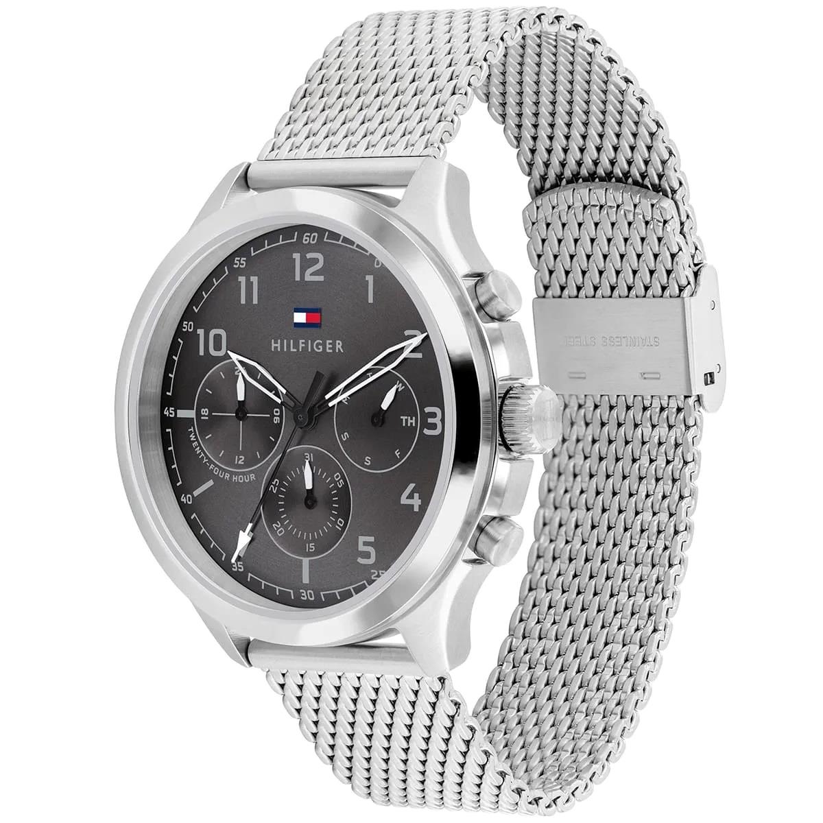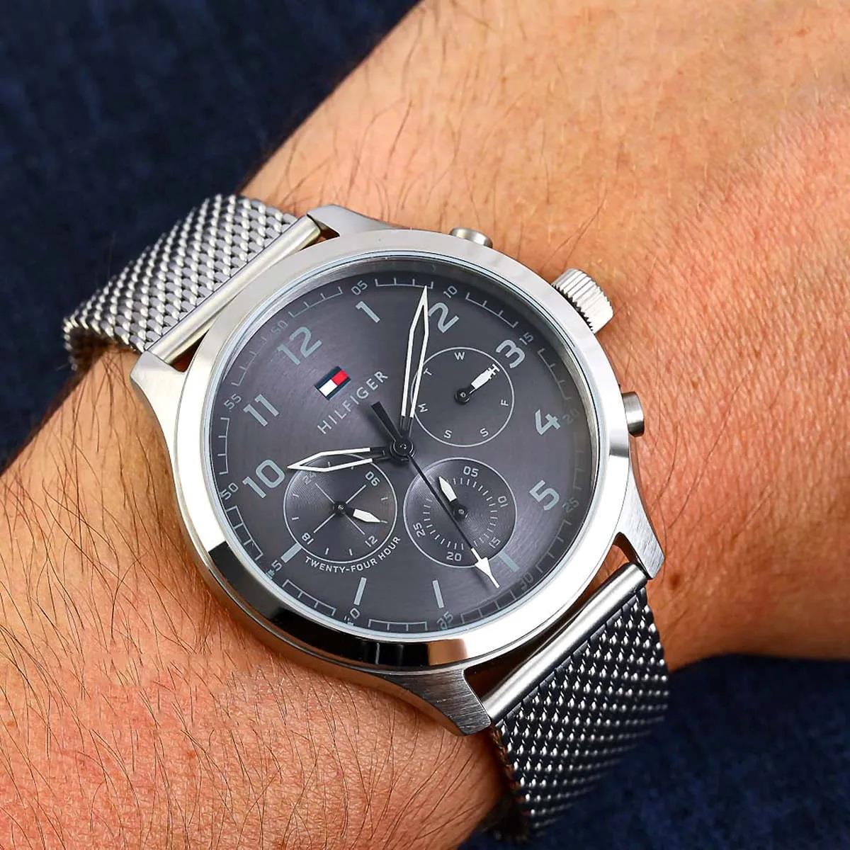 ساعت مچی مردانه تامی هیلفیگر Tommy Hilfiger با طراحی روزانه بند حصیربافت استیل و قاب گرد استیل و صفحه طوسی با قابلیت داشتن تقویم / روزهای هفته / روزوشب / شب نما  و موتور ژاپنی با انرژی باتری و مقاوم در برابر آب تا عمق 50 متر به همراه گارانتی بین المللی