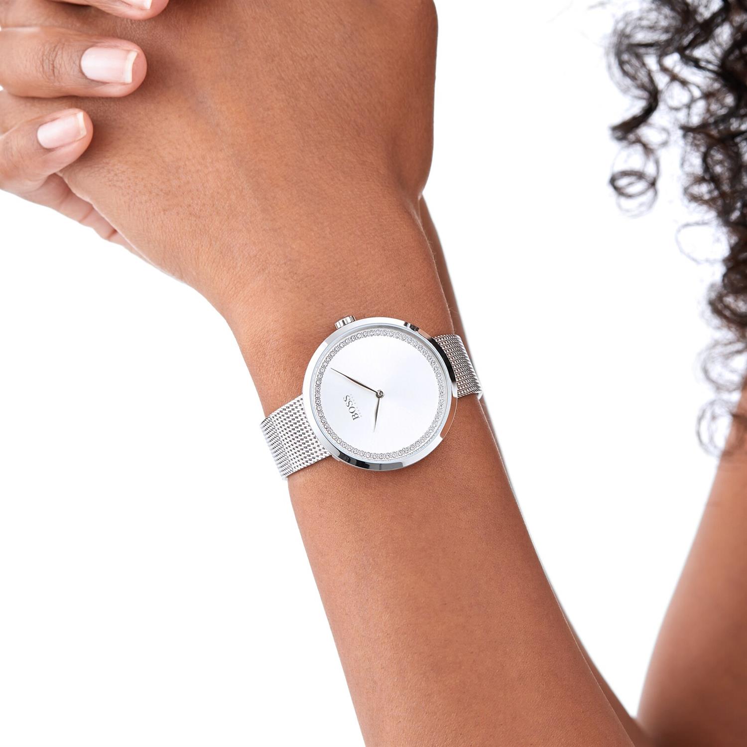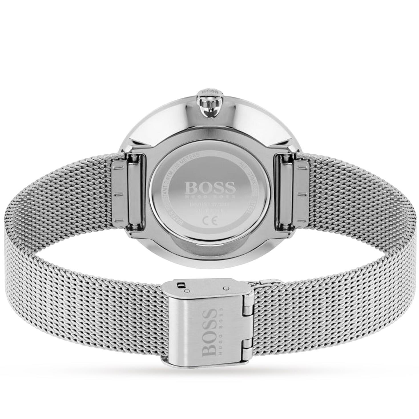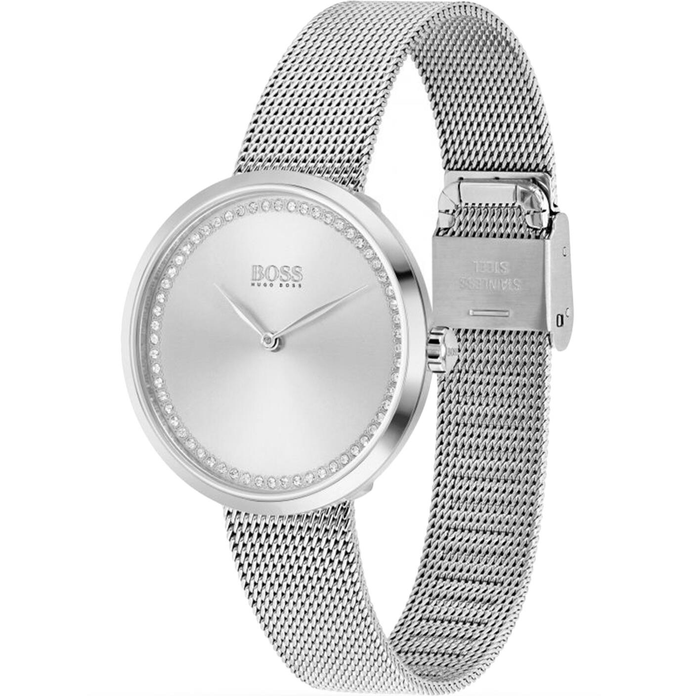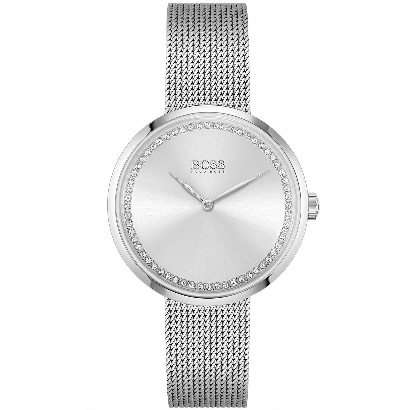 ساعت مچی زنانه هوگوباس Hugo Boss با طراحی روزانه بند حصیر بافت استیل با قاب گرد استیل و صفحه نگین دار نقره ای و موتور ژاپنی با انرژی باتری و مقاوم در برابر آب تا عمق 30 متر به همراه گارانتی بین المللی