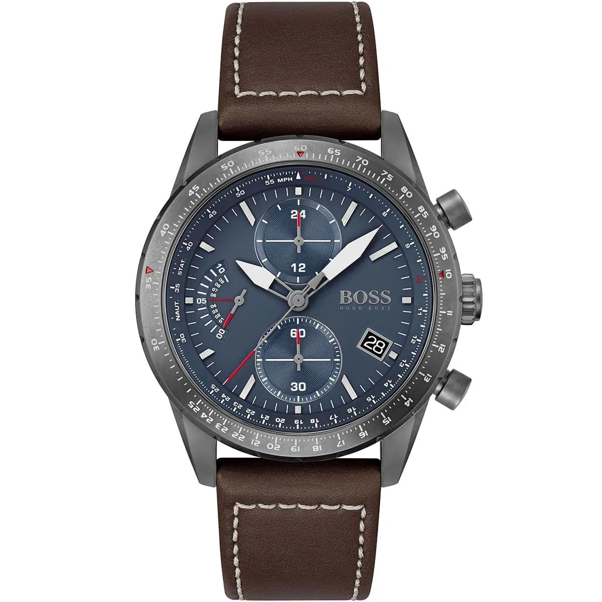 ساعت مچی مردانه هوگوباس Hugo Boss با طراحی روزانه بند چرمی قهوه ای با قاب فلزی طوسی و صفحه گرد سرمه ای با قابلیت کرنوگراف تقویم شب نما زه تاچی متر و موتور ژاپنی با انرژی باتری و مقاوم در برابر آب تا عمق 50 متر به همراه گارانتی بین المللی