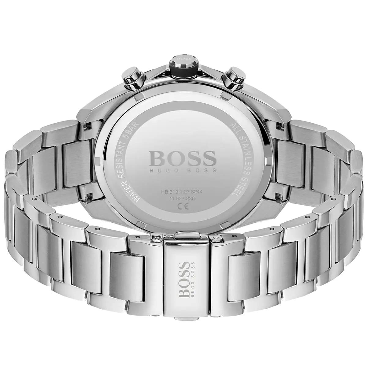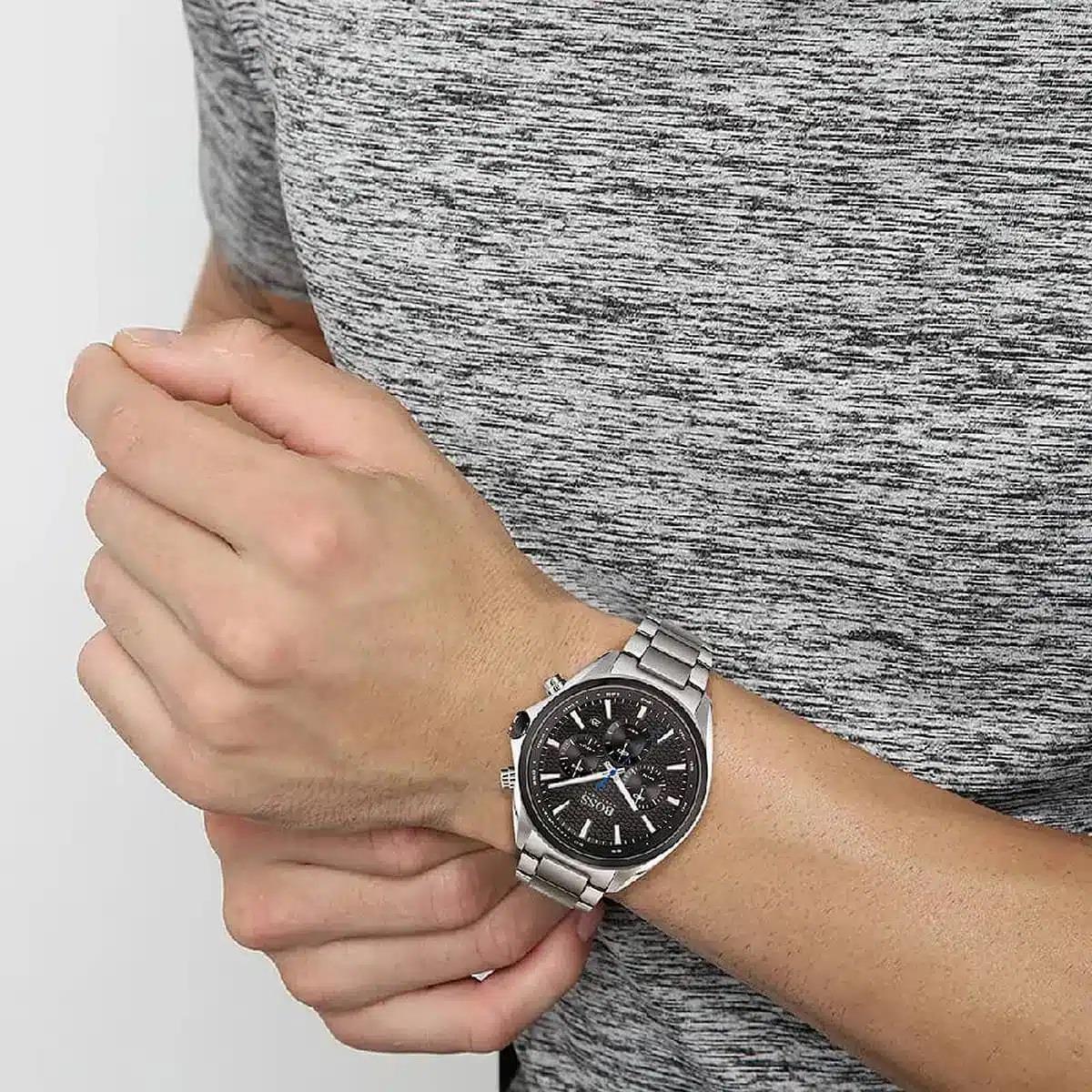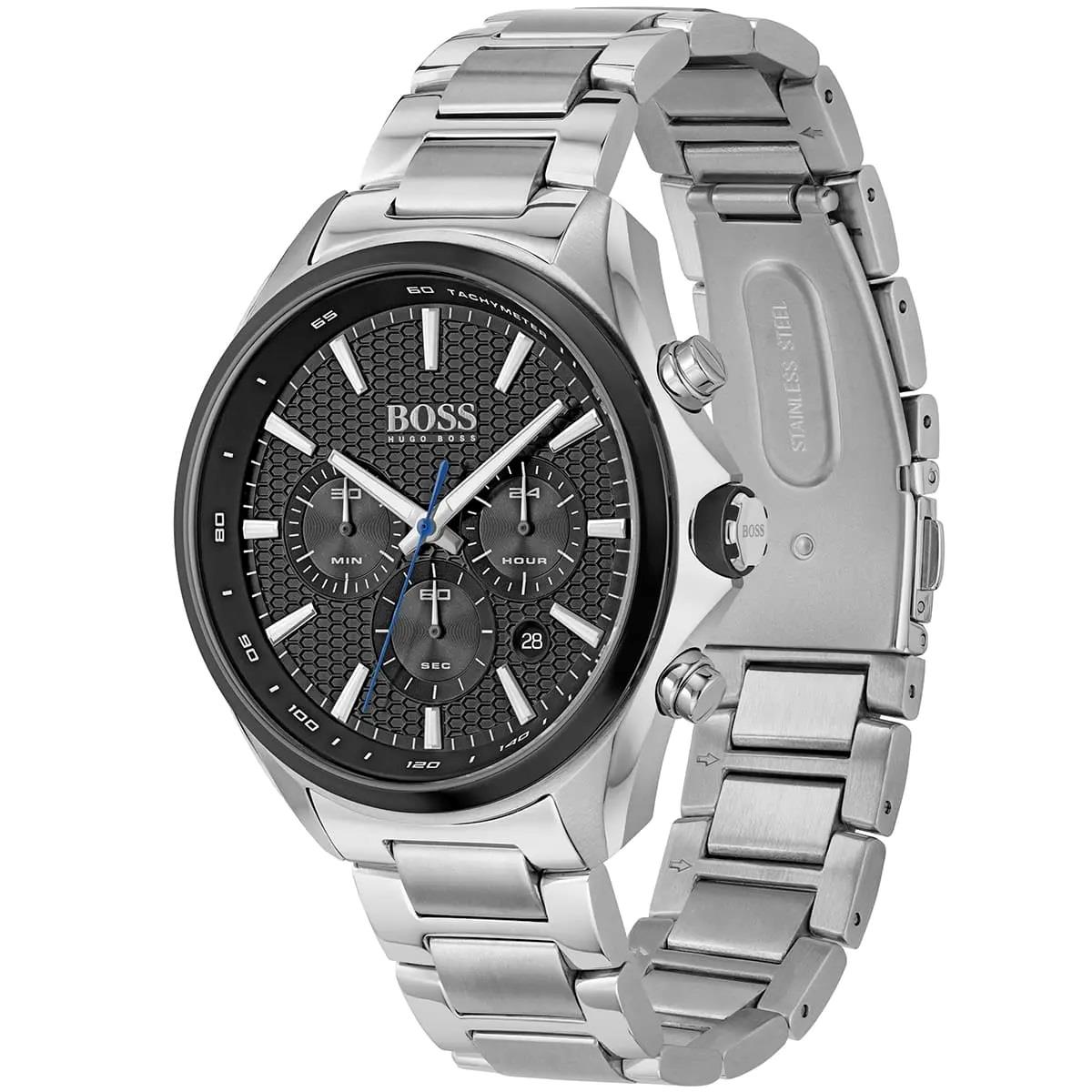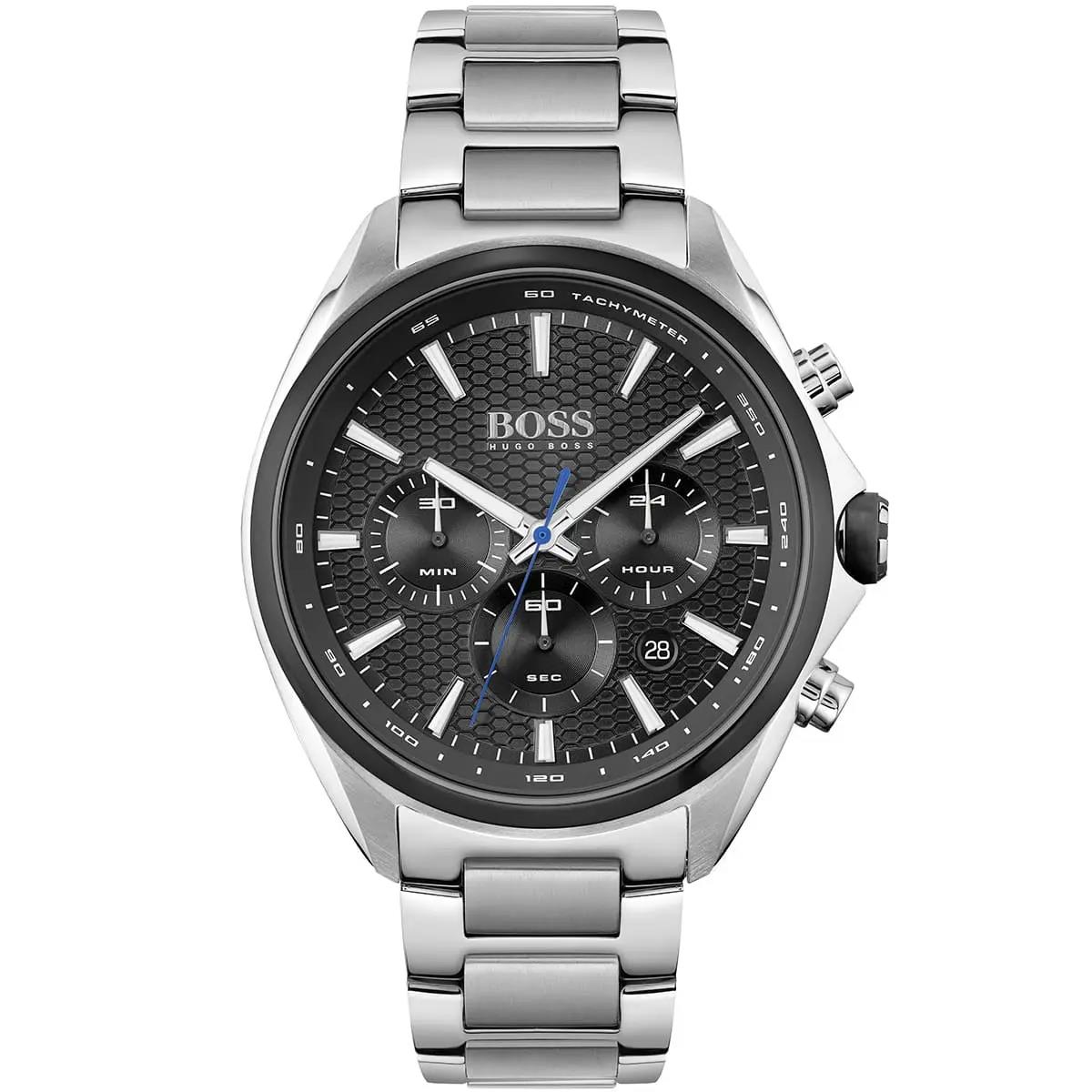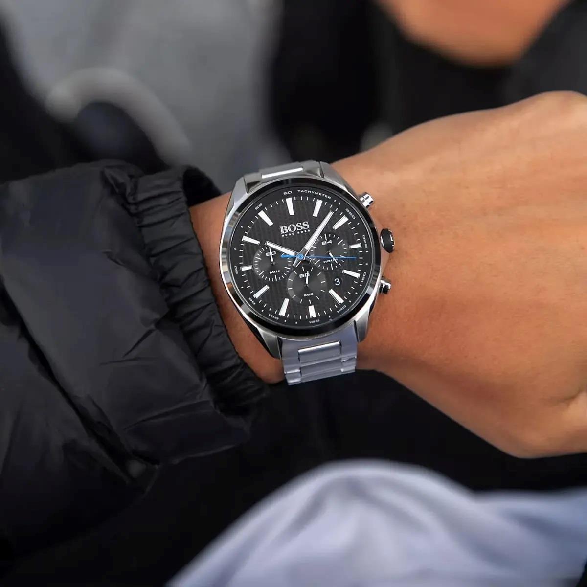 ساعت مچی مردانه هوگوباس Hugo Boss با طراحی روزانه بند استیل با قاب گرد استیل مشکی و صفحه مشکی با قابلیت کرنوگراف تقویم شب نما و موتور ژاپنی با انرژی باتری و مقاوم در برابر آب تا عمق 50 متر به همراه گارانتی بین المللی