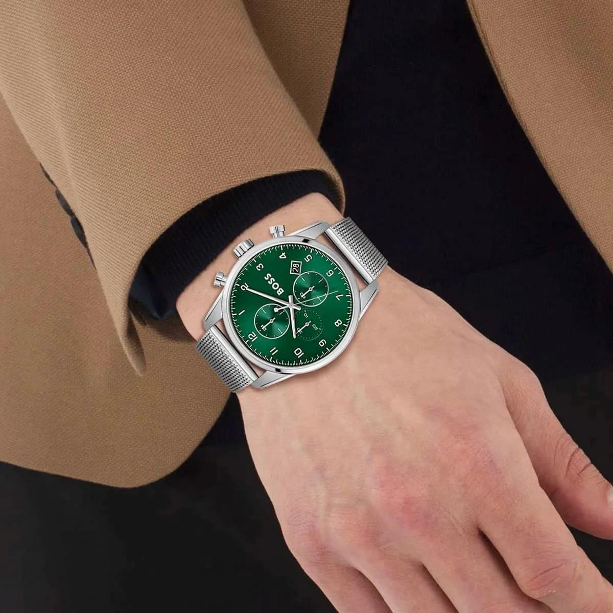 ساعت مچی مردانه هوگوباس Hugo Boss با طراحی روزانه بند حصیربافت استیل با قاب گرد استیل و صفحه سبز با قابلیت کرنوگراف تقویم شب نما و موتور ژاپنی با انرژی باتری و مقاوم در برابر آب تا عمق 50 متر به همراه گارانتی بین المللی