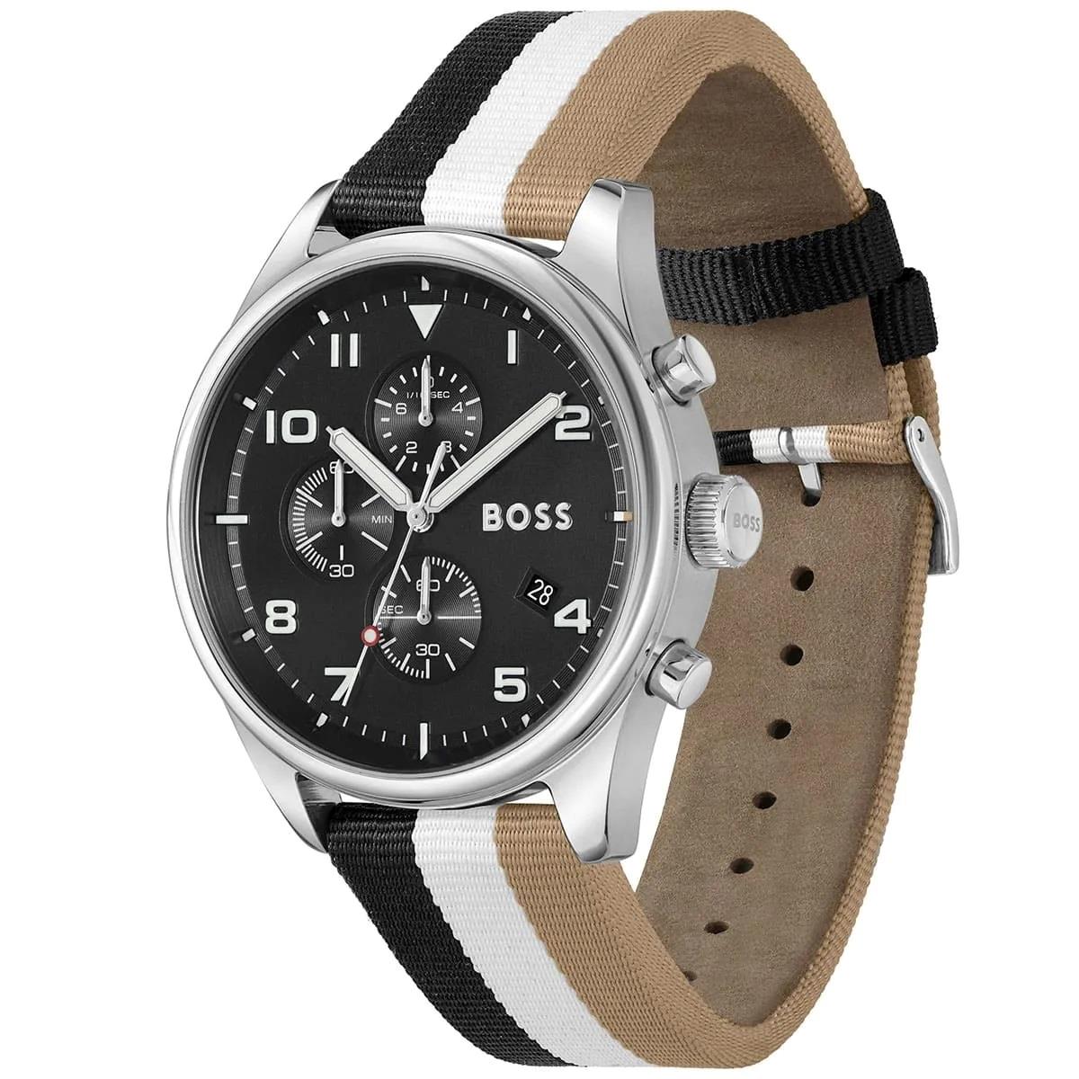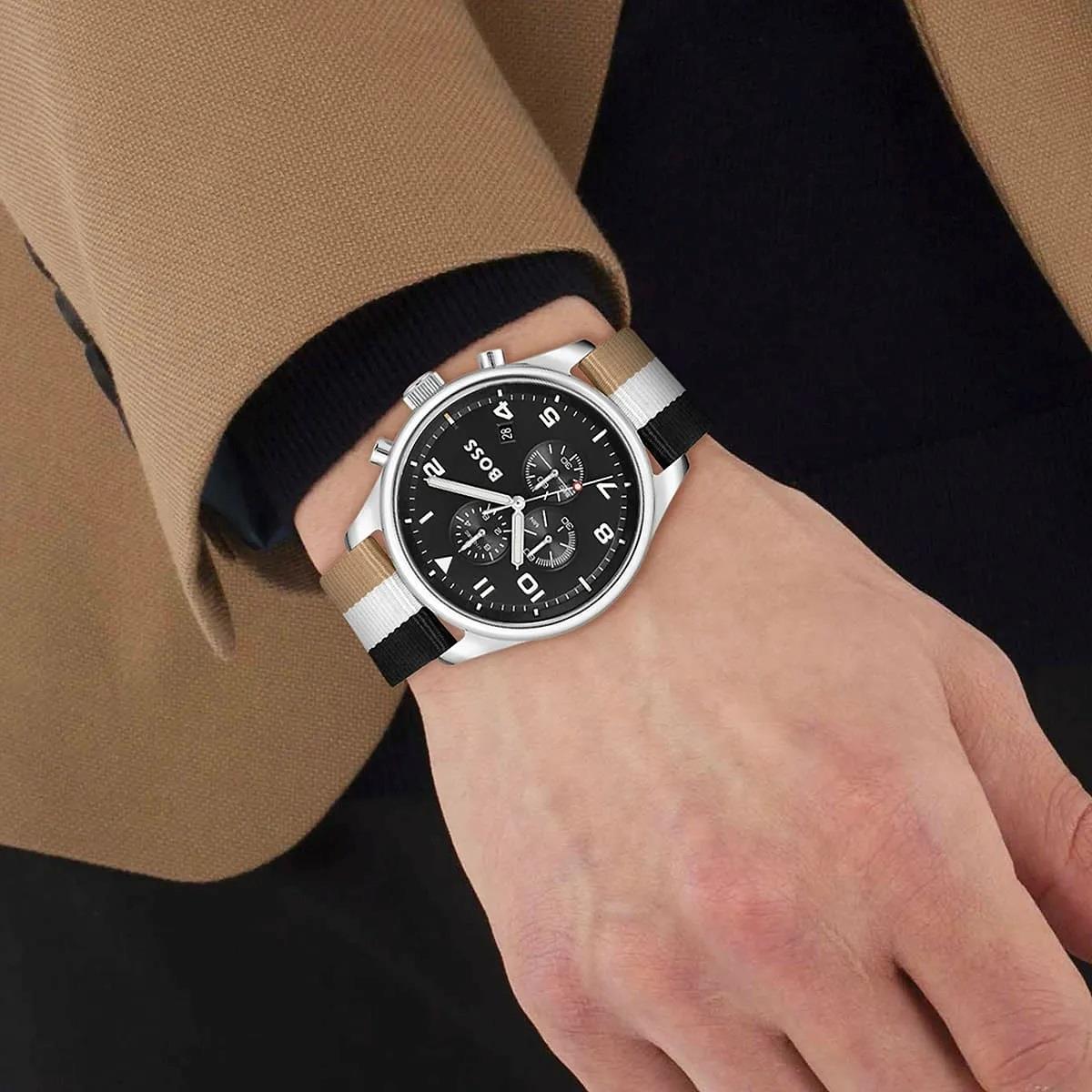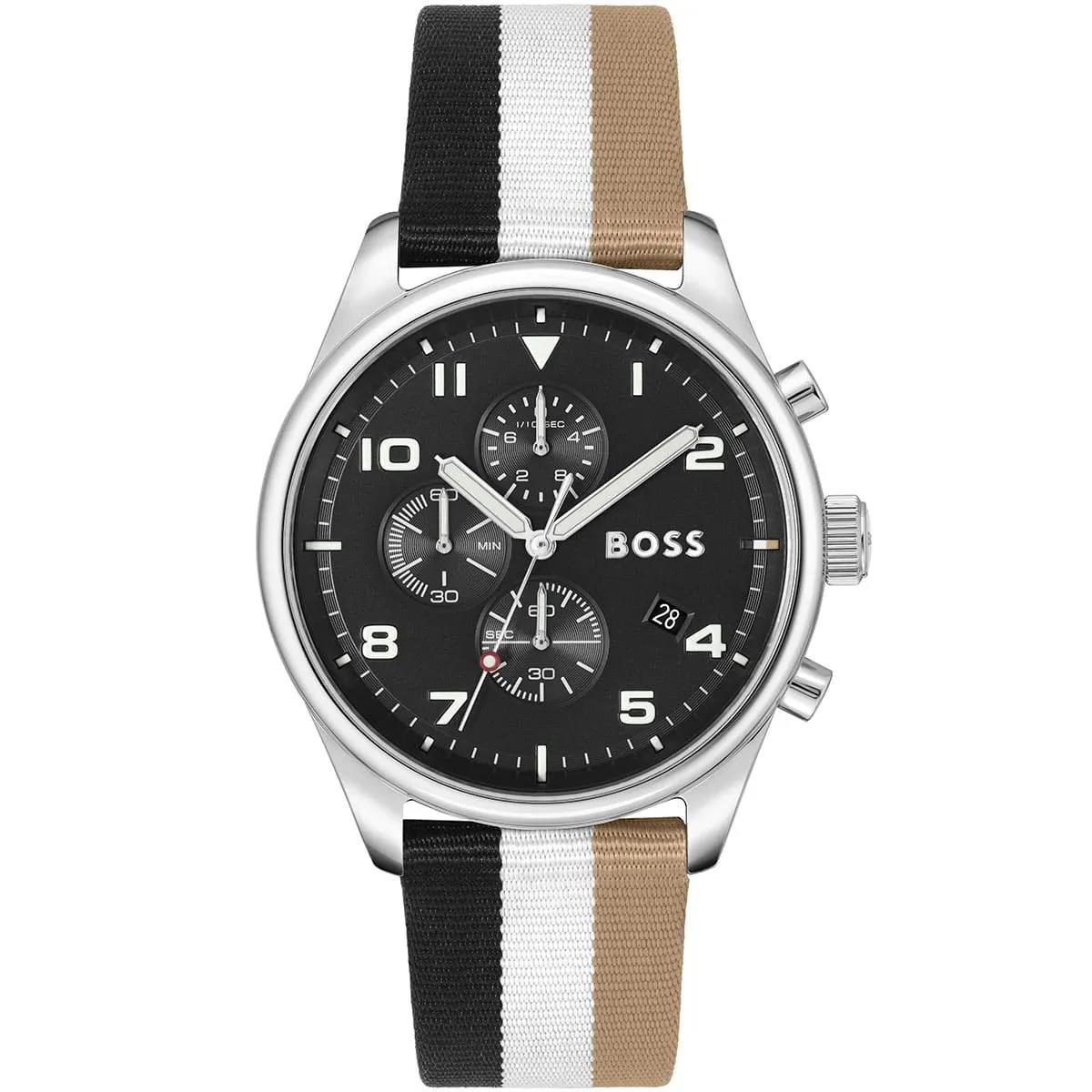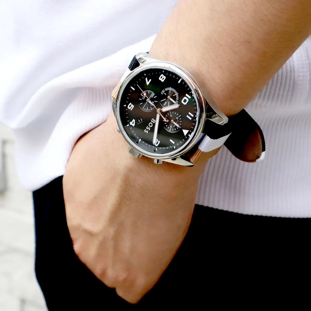 ساعت مچی مردانه هوگوباس Hugo Boss با طراحی روزانه بند برزنتی چند رنگ با قاب گرد استیل و صفحه مشکی با قابلیت تقویم / کرنوگراف / شبنما و موتور ژاپنی با انرژی باتری و مقاوم در برابر آب تا عمق 50 متر به همراه گارانتی بین المللی