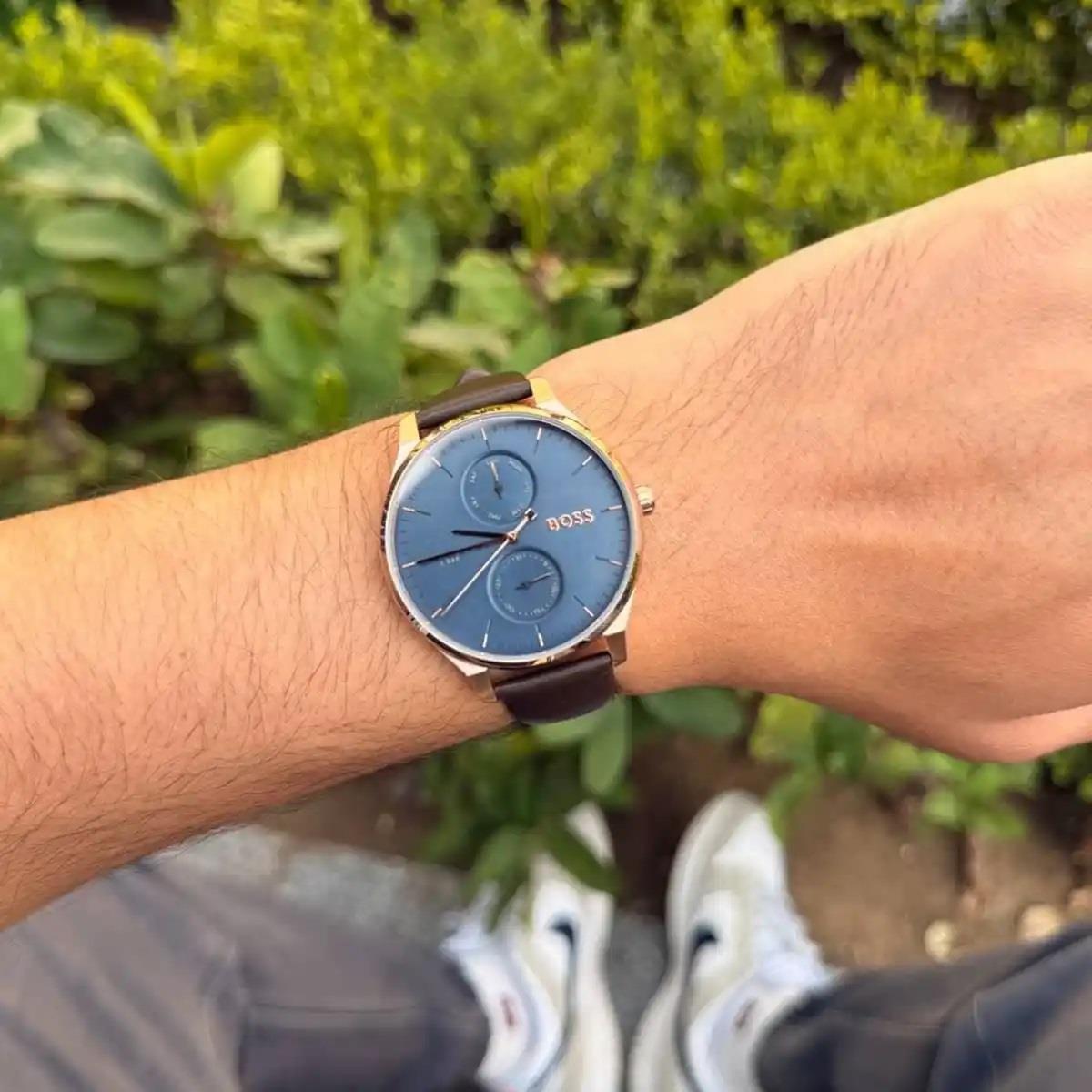 ساعت مچی مردانه هوگوباس Hugo Boss با طراحی روزانه بند چرمی قهوه ای با قاب گرد مسی و صفحه سرمه ای با قابلیت روزهای هفته / تقویم و موتور ژاپنی با انرژی باتری و مقاوم در برابر آب تا عمق 50 متر به همراه گارانتی بین المللی